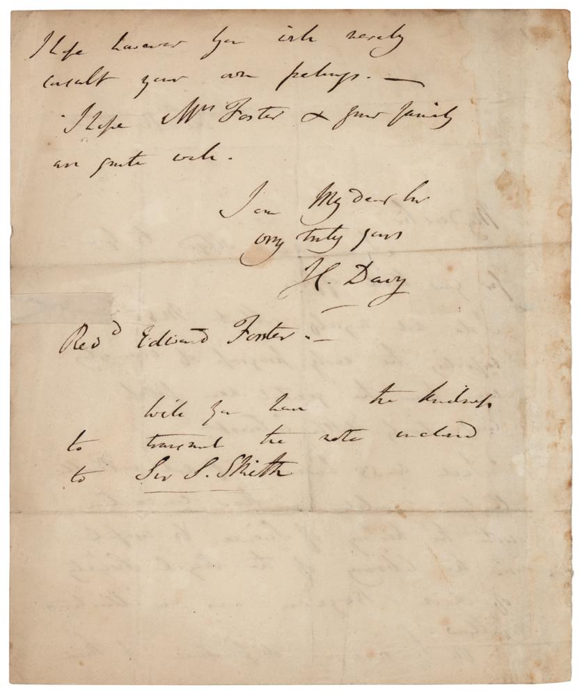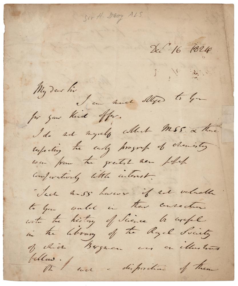 Chemist and inventor (1778-1829) best known for his discoveries of several alkali and alkaline earth metals, as well as contributions to the discoveries of the elemental nature of chlorine and iodine. ALS signed “H. Davy,” one page both sides, 7.5 x 9, December 16, 1824. Letter to Reverend Edward Forster, in part: "I do not myself collect MSS & those reflecting the early progress of chemistry...Such MSS however if not valuable to you would in their connection with the history of Science be useful in the library of the Royal Society." In very good condition, with scattered creasing, soiling, and light staining, and a repaired tear to the right edge. Accompanied by a full letter of authenticity from PSA/DNA.