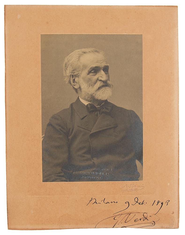 Italian composer (1813-1901) who was one of the most influential figures in the history of opera. Scarce matte-finish 4 x 5.75 half-length portrait of Verdi in a jacket and tie, stamped in the lower portion, "Ricordi & C. Deposto," and affixed to its original A. Ferrario photographer's mount, signed on the mount in black ink, "Milano, 9 Feb: 1893, G. Verdi." In very good to fine condition, with silvering to the image, trimmed edges, and a light stain over most of the signature. Accompanied by a full letter of authenticity from PSA/DNA.