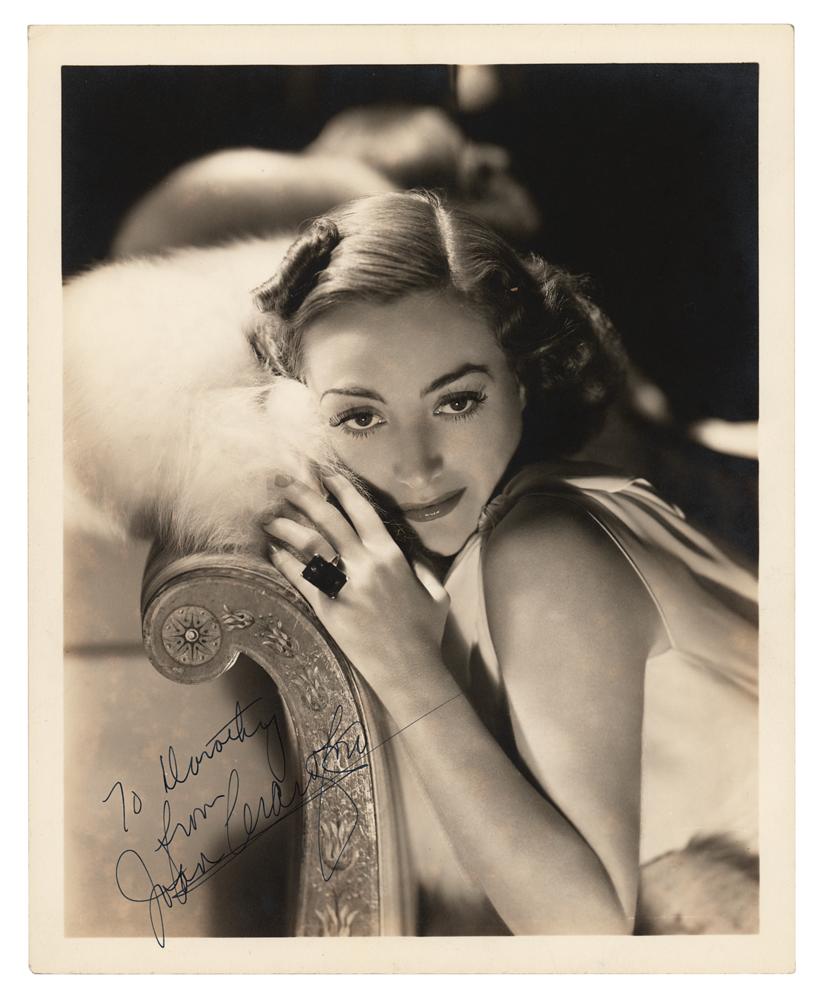 Exquisite vintage 8 x 10 Hurrell portrait photo of the Oscar-winning actress resting her face on a white fur pillow, signed and inscribed in black ink, “To Dorothy, from Joan Crawford." Reverse bears an MGM stamp crediting the photograph to the great George Hurrell. In very fine condition, with some faint silvering to the dark background.