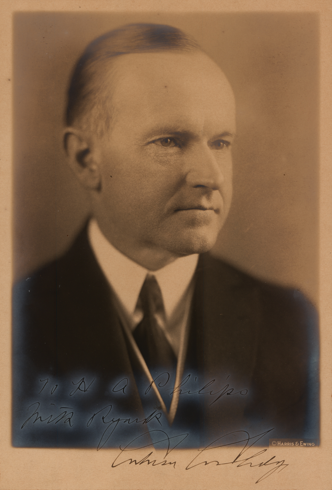 Vintage sepia matte-finish 6.5 x 9.75 Harris & Ewing portrait photo of Calvin Coolidge, signed and inscribed in fountain pen, "To H. A. Philips, with regards, Calvin Coolidge.” In very good to fine condition, with silvering to the lower image edges, and to the inscription.