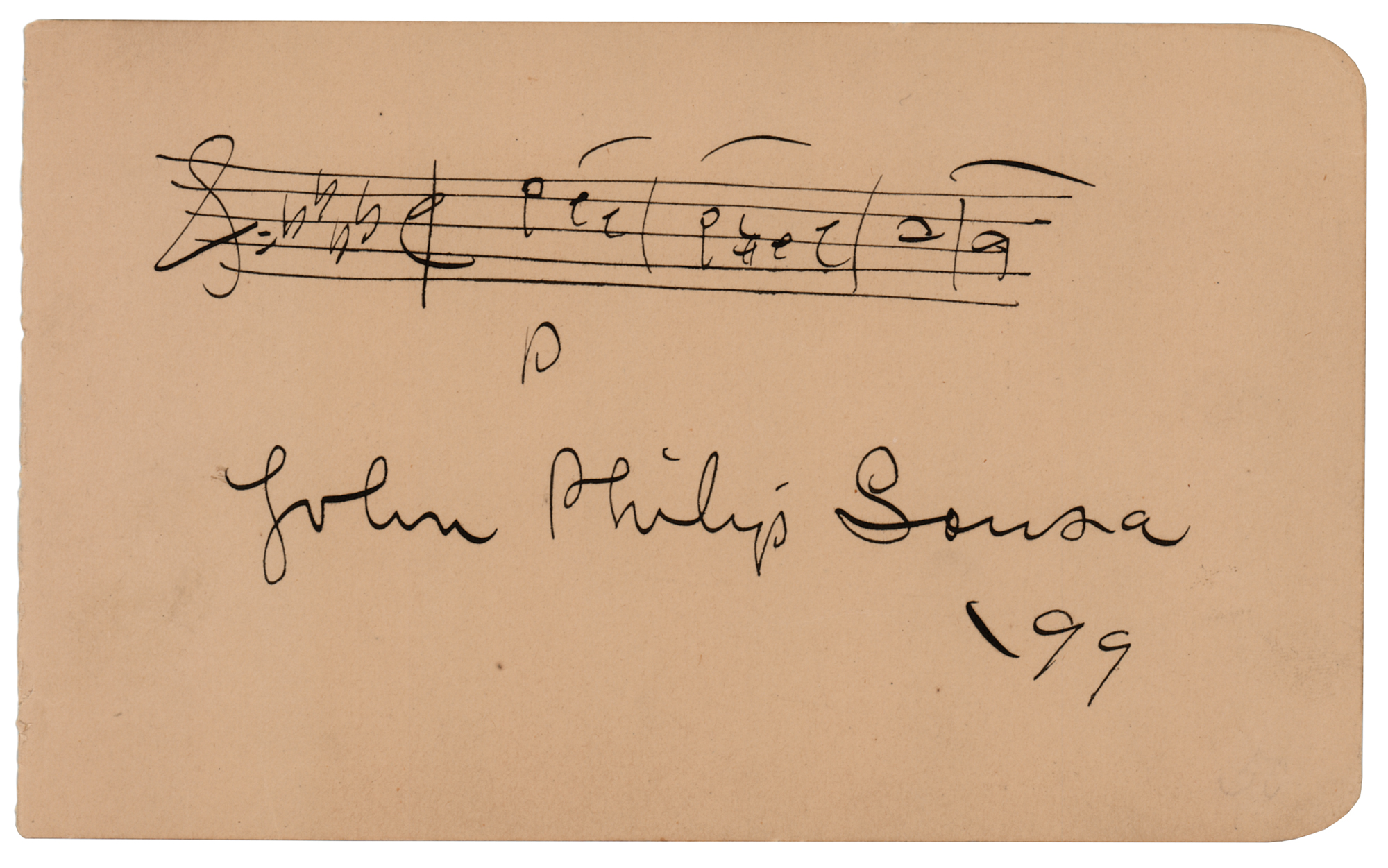 AMQS on an off-white 6 x 3.5 album page, signed in fountain pen, "John Philip Sousa, ‘99,” who above adds three bars of music from his classic patriotic march ‘The Stars and Stripes Forever.’ In very fine condition. Accompanied by a modern photo of Sousa.