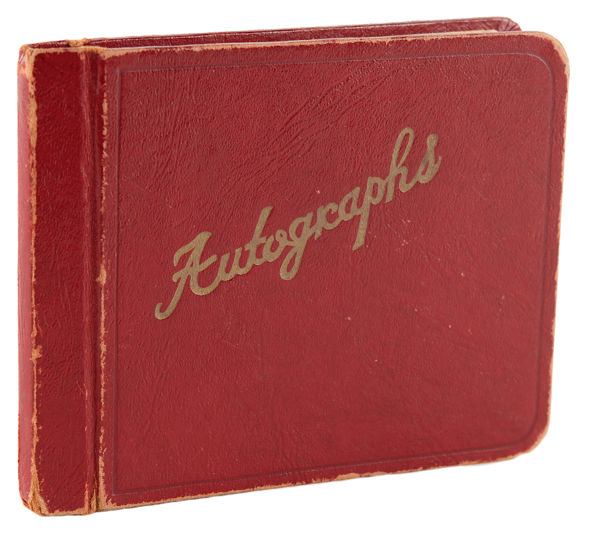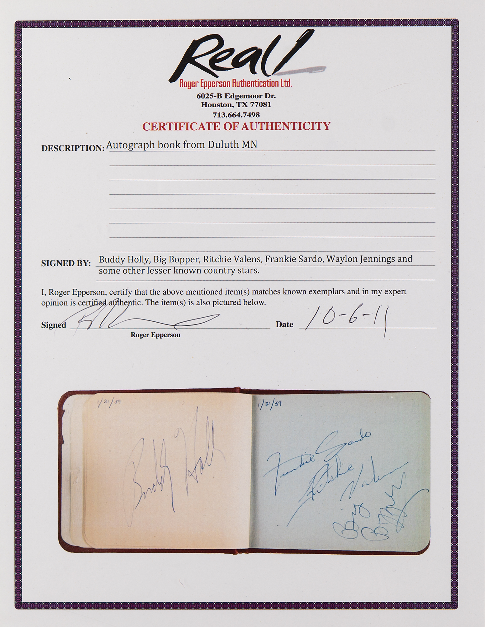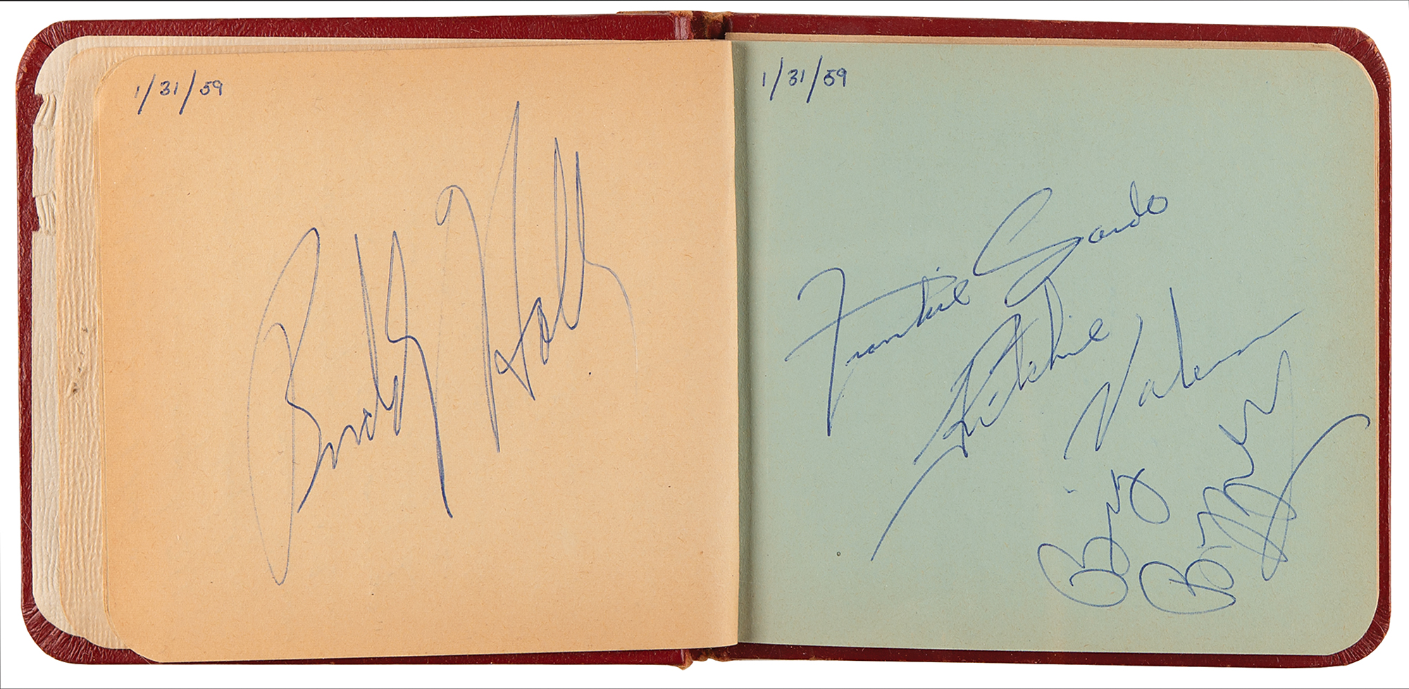 Remarkable vintage autograph album, 6 x 4.75, containing ballpoint signatures of Buddy Holly, Ritchie Valens, and J. P. Richardson, ‘The Big Bopper,’ all of which date to January 31, 1959, when Holly's 1959 Winter Dance Party Tour performed in Duluth, Minnesota, at the National Guard Armory, three days before all three men, together with pilot Roger Peterson, were killed in a plane crash near Clear Lake, Iowa. The three musicians sign on adjacent pages: “Buddy Holly,” “Ritchie Valens,” and “Big Bopper,” with the latter two signing on the same page; singer Frankie Sardo has also signed on the Valens and Richardson page. The album also features signatures of three other musicians related to that tour: country legend Waylon Jennings, who adds “Crickets” below his name; and Carlo Mastrangelo and Fred Milano of vocal group Dion and the Belmonts. Other signatures in the album include period musicians and singers Buddy Knox, Jimmy Bowen, Johnny Paris, Carl Dobkins, Jr., Nicky DeMatteo, and Harold Dorman.