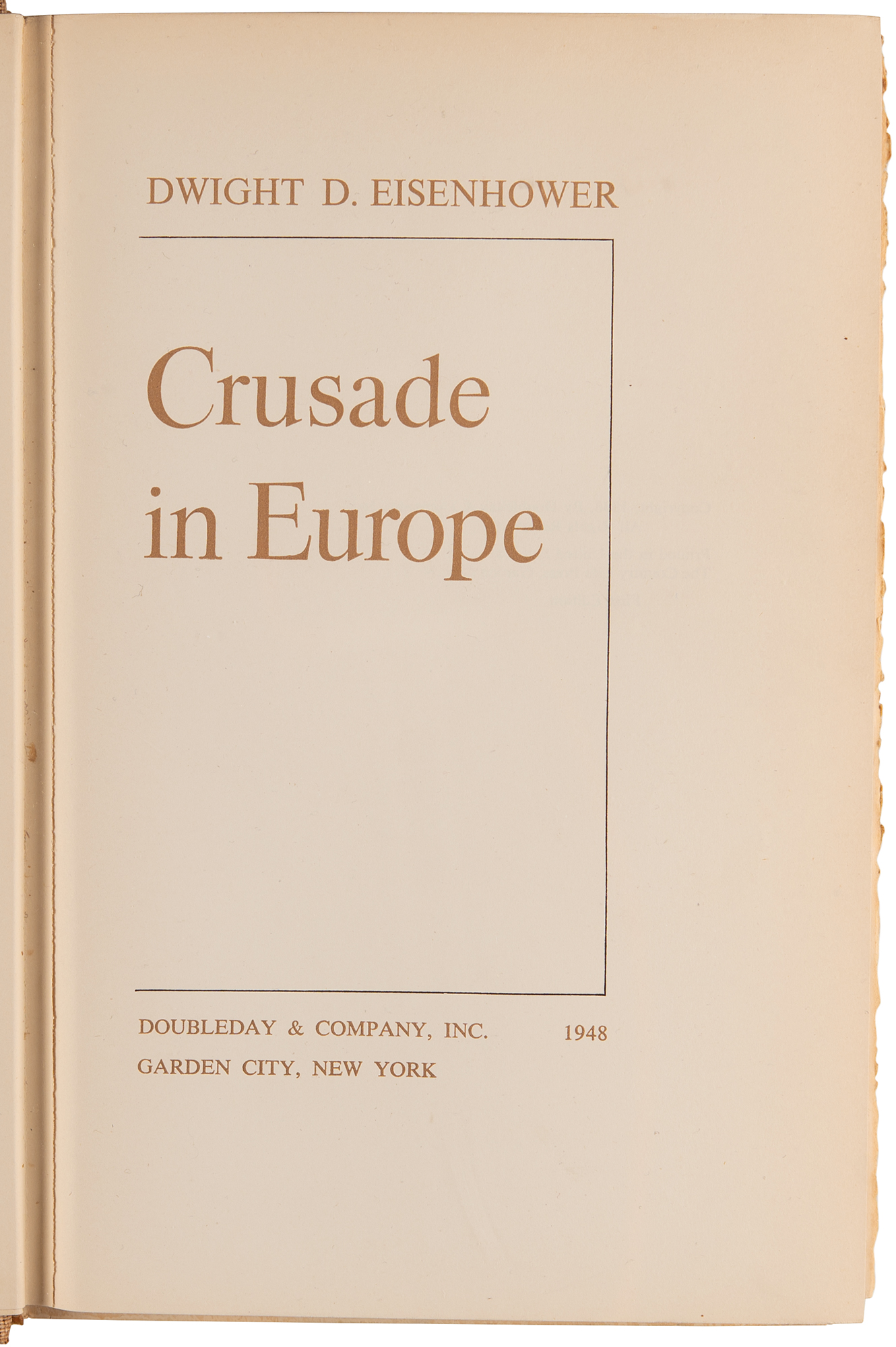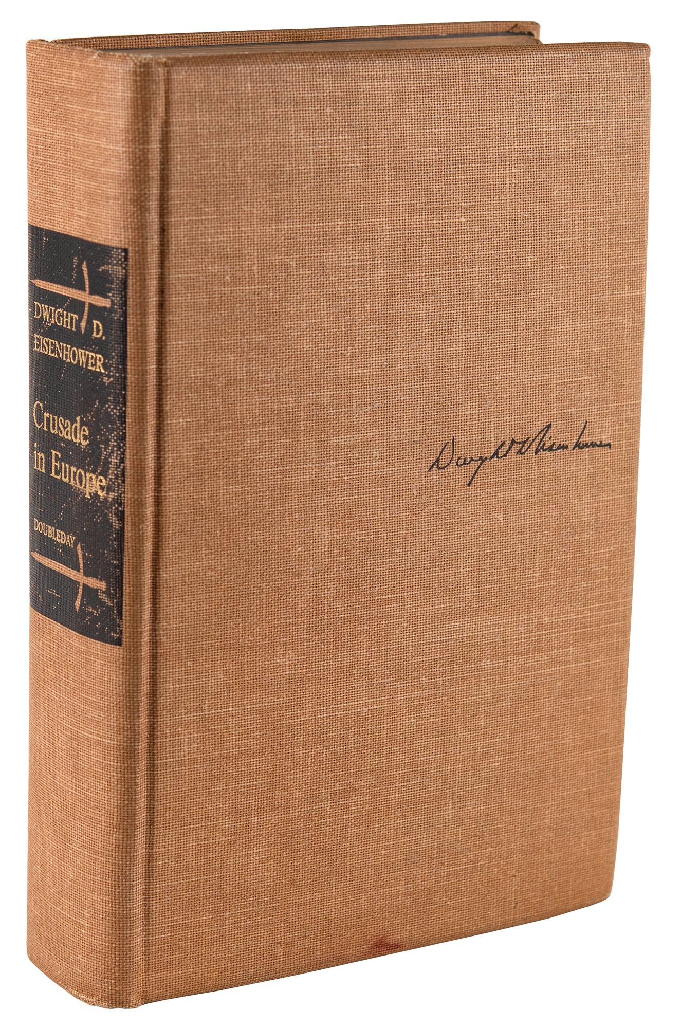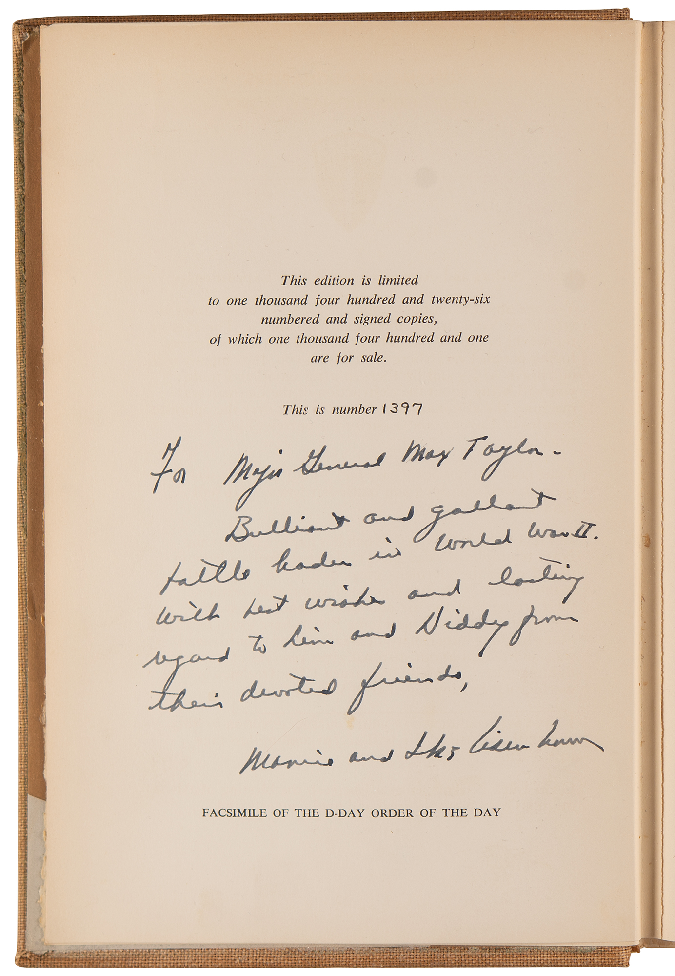 Signed book: Crusade in Europe. First edition, limited issue, numbered 1397/1426. NY: Doubleday, 1948. Hardcover, 7 x 10, 559 pages. Signed and inscribed on the colophon in fountain pen to noted senior United States Army officer Maxwell D. Taylor, “For Major General Max Taylor – Brilliant and gallant battle leader in World War II. With best wishes and lasting regard to him and Diddy from their devoted friend, Mamie and Ike Eisenhower,” who signed on behalf of his wife. Autographic condition: fine. Book condition: VG/None, with the special D-Day prefatory page excised from the volume, a small stain to the front board, and rubbing to the title on the spine.