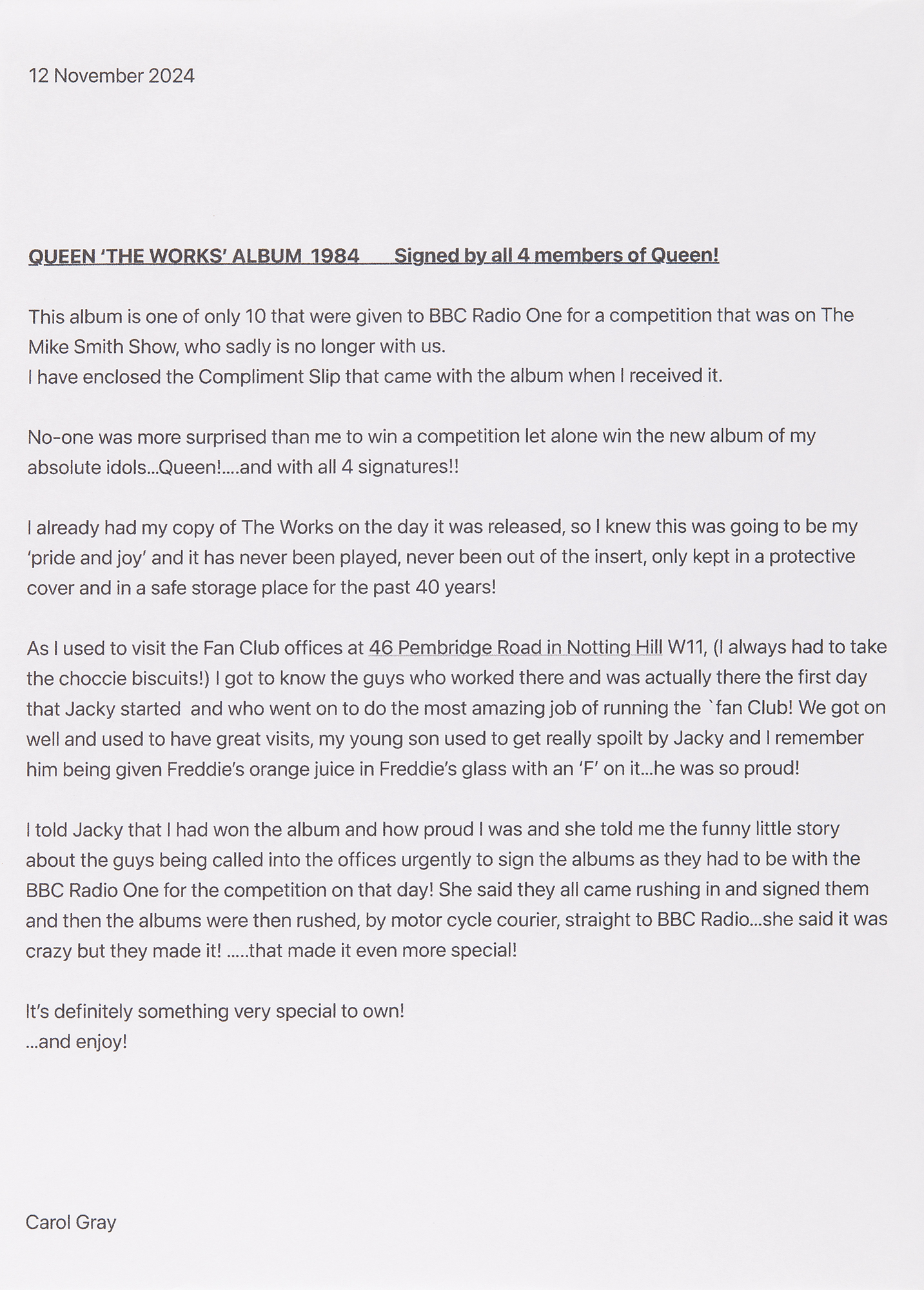 As I used to visit the Fan Club offices at 46 Pembridge Road in Notting Hill W11, (I always had to take the choccie biscuits!) I got to know the guys who worked there and was actually there the first day that Jacky started and who went on to do the most amazing job of running the Fan Club!…I told Jacky that I had won the album and how proud I was and she told me the funny little story about the guys being called into the offices urgently to sign the albums as they had to be with the BBC Radio One for the competition on that day! She said they all came rushing in and signed them and then the albums were then rushed, by motor cycle courier, straight to BBC Radio…she said it was crazy but they made it!…that made it even more special!"
