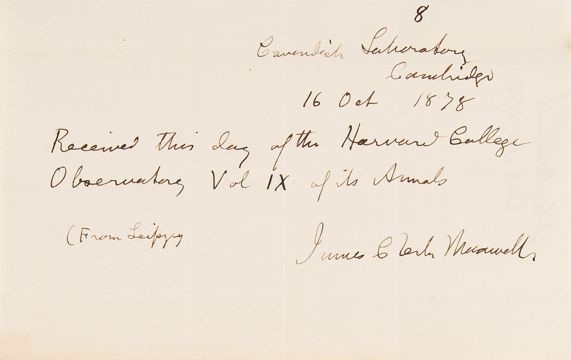 Scottish physicist and mathematician (1831-1879) who was responsible for the classical theory of electromagnetic radiation, which was the first theory to describe electricity, magnetism, and light as different manifestations of the same phenomenon. Maxwell's equations for electromagnetism achieved the second great unification in physics, whereas the first had been realized by Isaac Newton. Exceptionally rare ADS, one page, 7 x 4.5, October 16, 1878. Addressed from the legendary Cavendish Laboratory of Physics in Cambridge, a boldly penned handwritten receipt: “Received this day of the Harvard College Observatory Vol IX of its Annals.” Signed below with his rare full signature, “James Clerk Maxwell,” who has added to the left, “(From Leipzig.” The reverse is docketed by an unknown hand and not a signature. In fine condition.