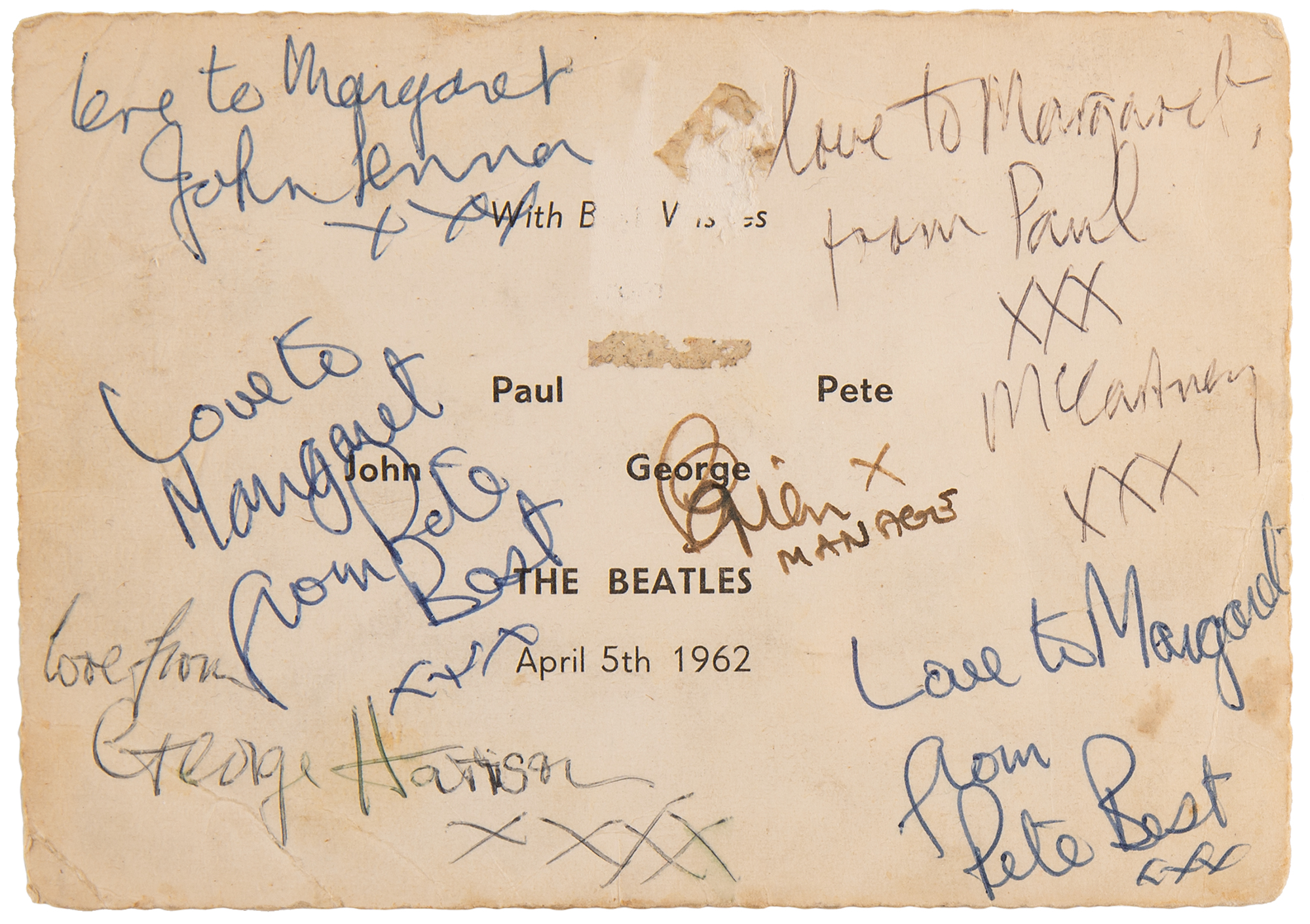 Extremely rare, early vintage glossy 5.75 x 4 promo card from the Beatles' Cavern Club 'going away' performance on April 5, 1962, signed and inscribed on the reverse in ballpoint, "Love to Margaret, John Lennon, xxx," "Love to Margaret, from Paul McCartney, xxx xxx," "Love from George Harrison, xxxx," and twice, "Love to Margaret, from Pete Best, xxx." Also signed in fountain pen by manager Brian Epstein, "Brian, x, Manager.” The front features a portrait of the band (with Pete Best as drummer) taken by Albert Marion on December 17, 1961, during the band's first professional photo shoot organized by Brian Epstein. The reverse is imprinted: "With Best Wishes from Paul, Pete, John, George, The Beatles, April 5th 1962." In very good to fine condition, with creasing and light soiling, and some minor surface loss not affecting any of the signatures.