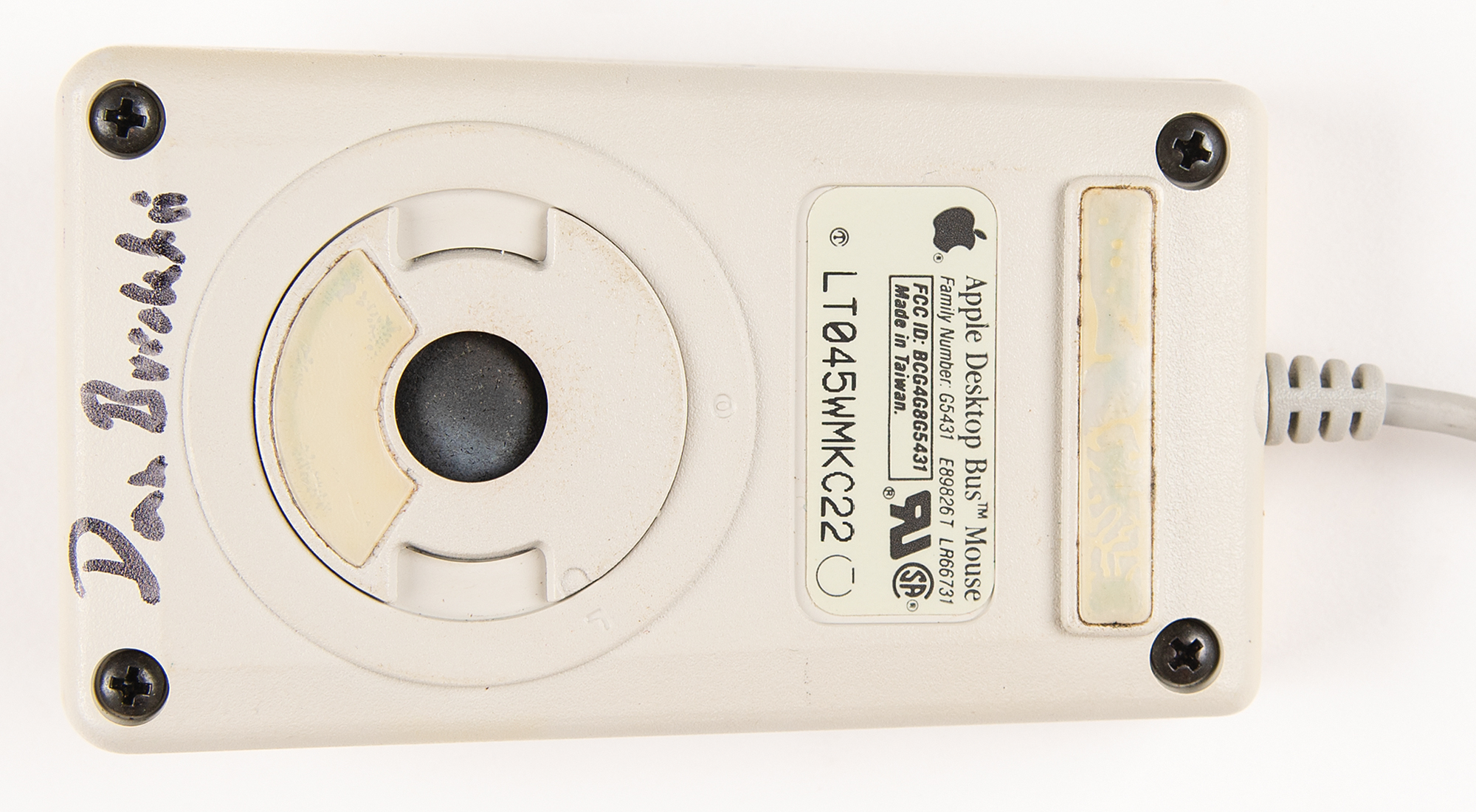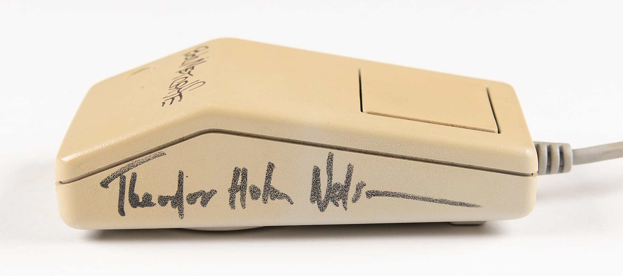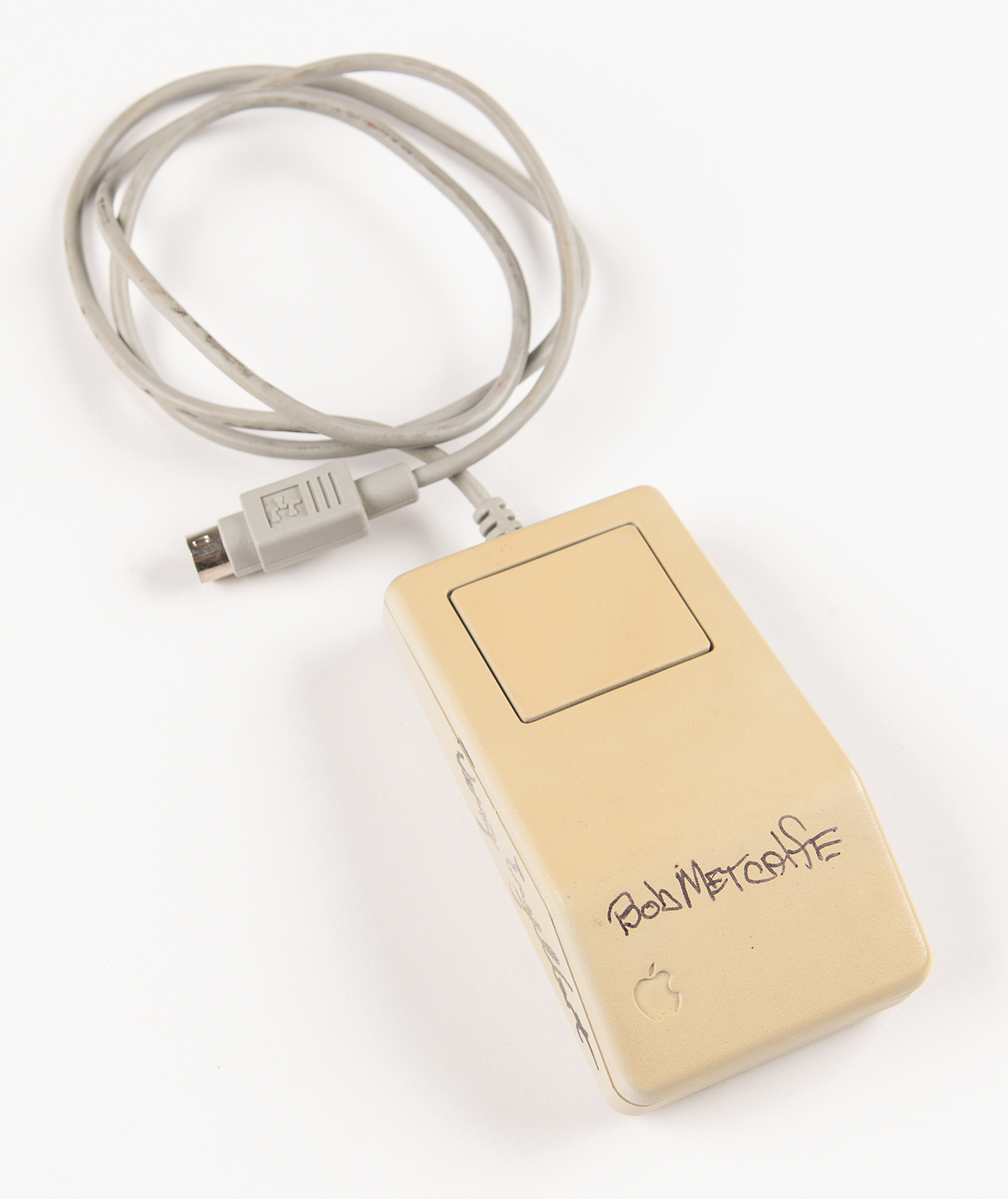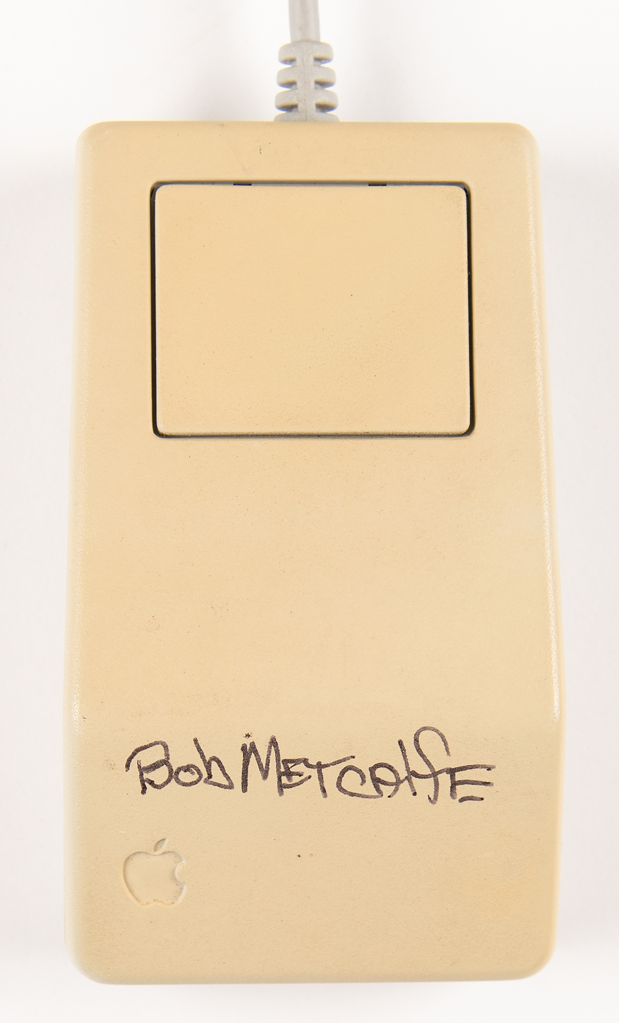 Apple Macintosh Desktop Bus Mouse signed in black felt tip by four notable innovators of the computer industry: Douglas Engelbart, the creator of the computer mouse (left side); Robert Metcalfe, the inventor of Ethernet and Metcalfe’s Law (top); Ted Nelson, who coined the terms hypertext and hypermedia (right side); and Dan Bricklin, the co-creator of VisiCalc, the first spreadsheet program (underside). In fine condition. A significant, one-of-a-kind assemblage of four tech visionaries who helped shape the foundations of modern computing, networking, and information systems.