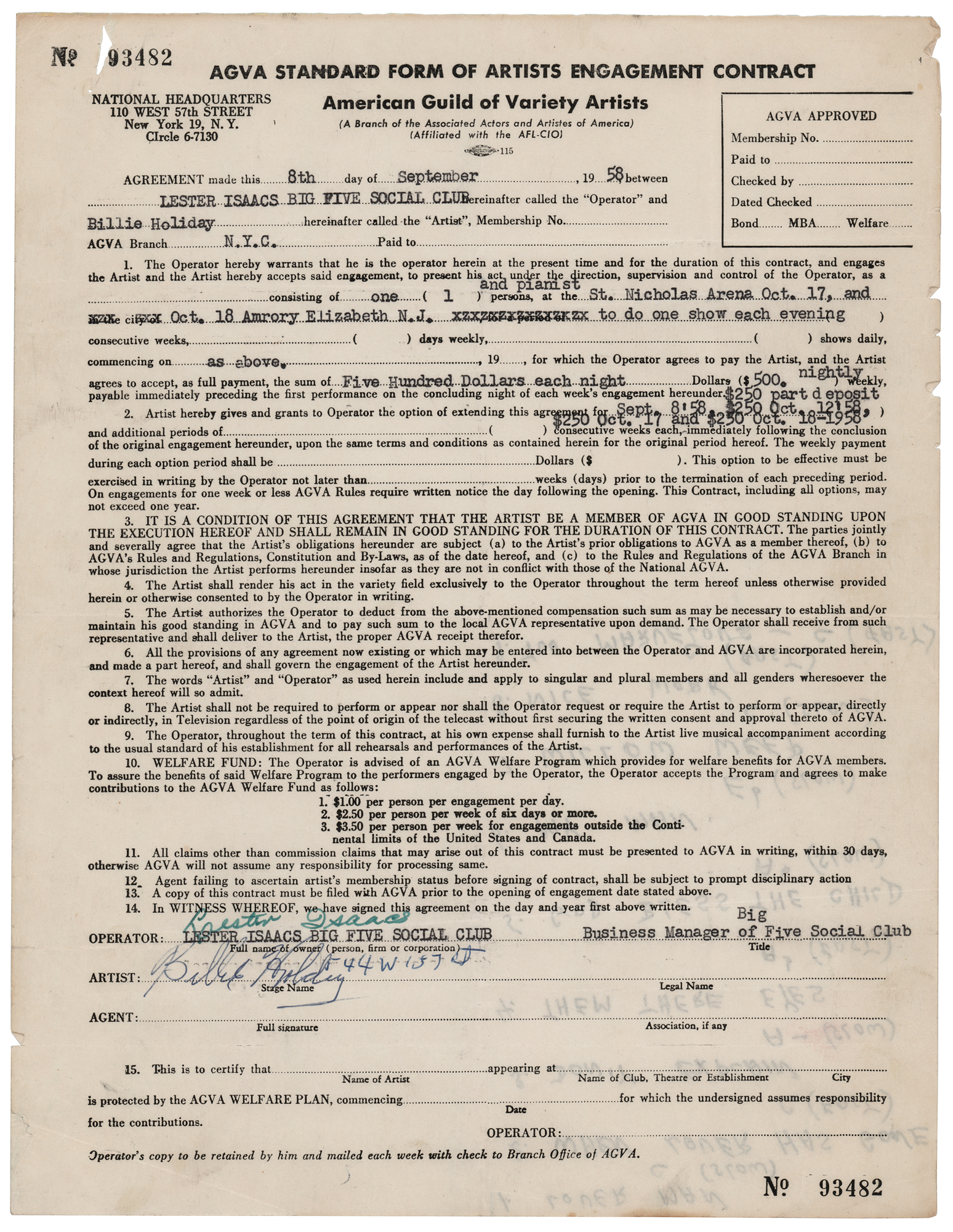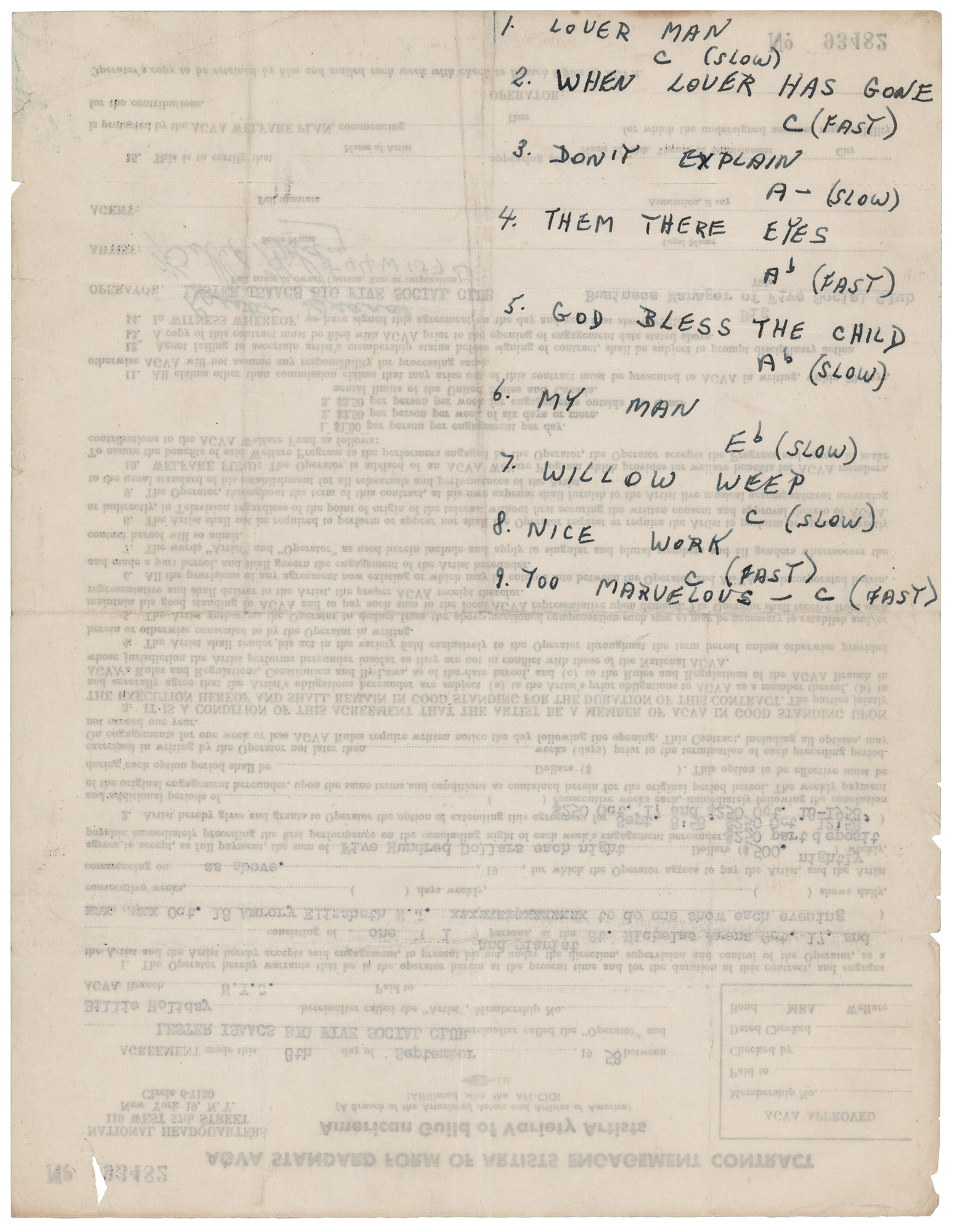 Partly-printed DS, one page, 8.5 x 11, September 8, 1958. Standard AGVA artists engagement contract by which the Lester Isaacs Big Five Social Club hires Billie Holiday, with an accompanying pianist, to perform at St. Nicholas Arena in Elizabeth, New Jersey, on October 17 and 18, 1958, at the rate of $500 per night. Signed at the conclusion in blue ballpoint by Billie Holiday. Interestingly, an eight-song set list is penned on the reverse in another hand, listing the titles, keys, and tempos for Holiday classics like 'Lover Man,' 'Them There Eyes,' and 'God Bless the Child.' In fine condition. Accompanied by an unsigned portrait of the celebrated jazz singer.