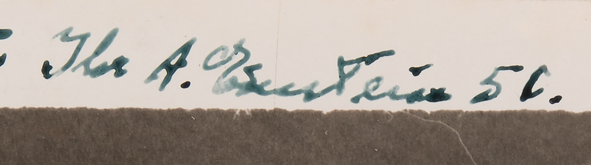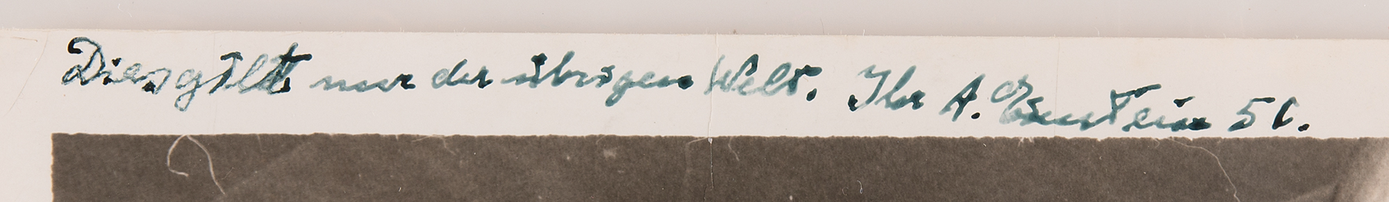 Interestingly, Otto Nathan presented the photo as a gift to Margaret Sanders, the daughter of KFC founder Col. Harland Sanders, and it has descended through the family. Margaret's close relationship with Otto Nathan, and her interest in Einstein's work, are well documented in her memoir, The Colonel's Secret: Eleven Herbs and a Spicy Daughter (pp. 186–239), published in 1996. This signed photograph might have been presented as a 'thank-you' for her gift of a bust of Einstein (see lots 4101 and 4102); she had also received several photographs of Einstein from Otto Nathan to use as reference material for her creation of the bust.