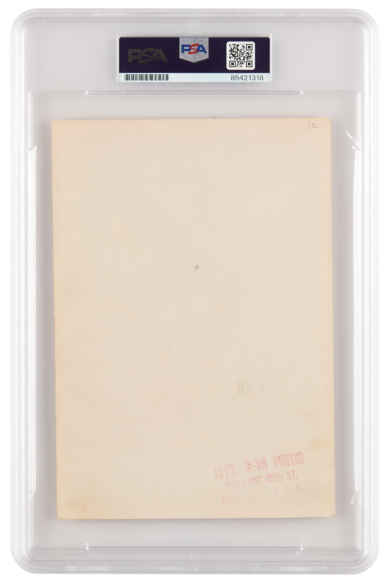 Iconic vintage glossy 5 x 7 photo of Albert Einstein famously sticking his tongue out on his 72nd birthday, signed in the thin upper border in fountain pen in German (translated): "This gesture applies only to the rest of the world. Yours, A. Einstein 51." Reverse bears an International News Photos credit stamp: "Int'l News Photos, 235 East 45th St., New York." In very good to fine condition, with scattered creasing, including a thin vertical crease descending to his forehead, visible at an angle. Encapsulated in a PSA/DNA authentication holder.