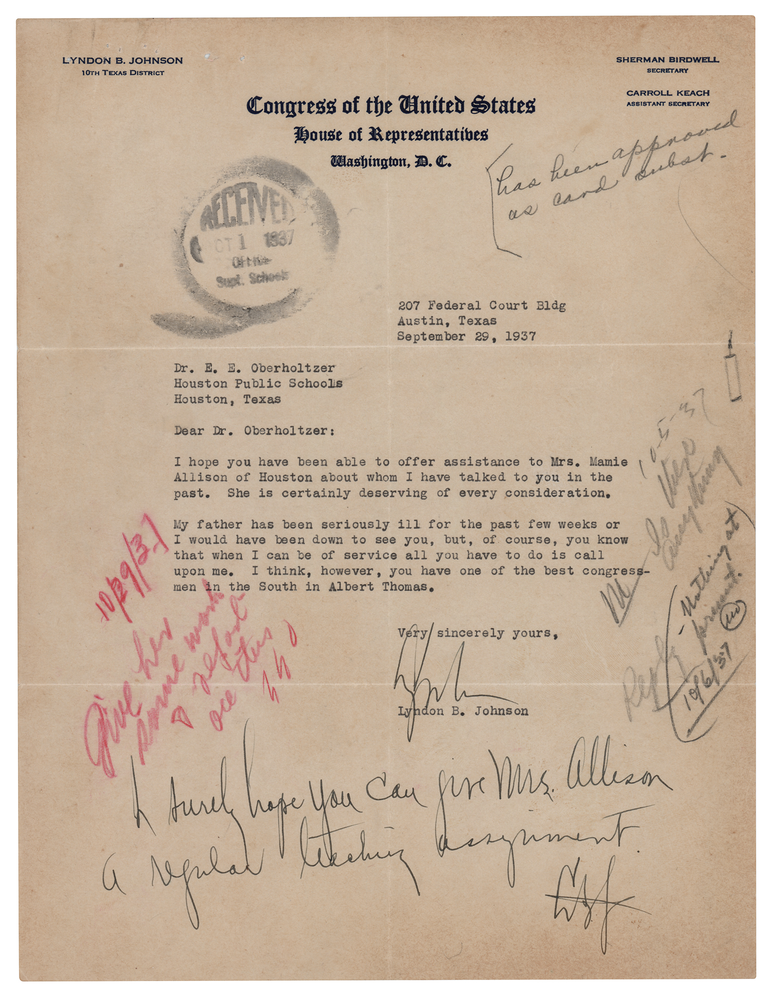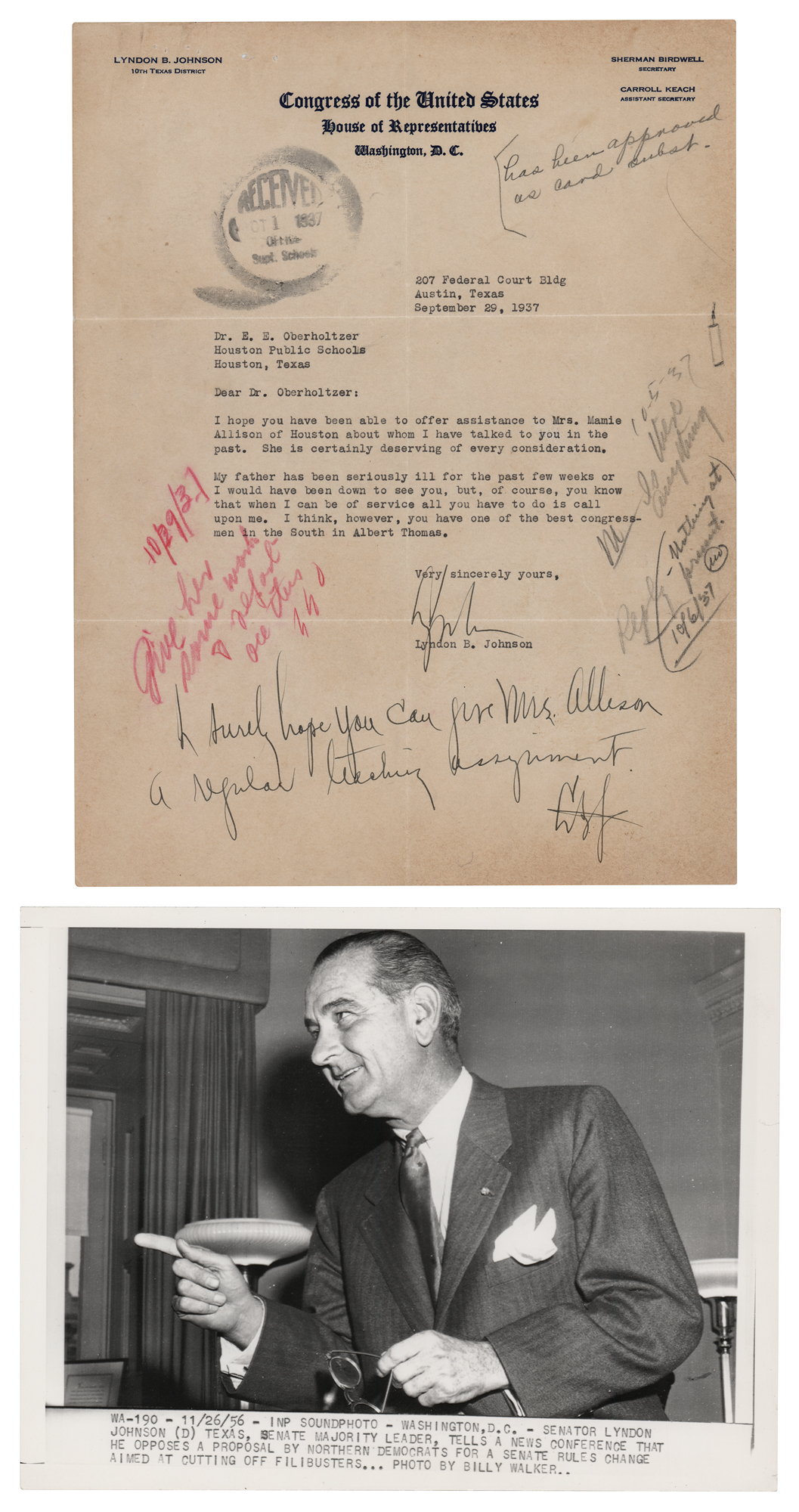 TLS signed “Lyndon,” one page, 8 x 10.5, Congress of the United States, House of Representatives letterhead, September 29, 1937. Letter to E. E. Oberholtzer of Houston Public Schools, in full: "I hope you have been able to offer assistance to Mrs. Mamie Allison of Houston about whom I have talked to you in the past. She is certainly deserving of every consideration. My father has been seriously ill for the past few weeks or I would have been down to see you, but, of course, you know that when I can be of service all you have to do is call upon me. I think, however, you have one of the best congressmen in the South in Albert Thomas." He adds a handwritten postscript, signed "L.B.J.," in full: "I surely hope you can give Mrs. Allison a regular teaching assignment." In fine condition, with light edge toning and several clerical notations to the margins. Accompanied by a later wirephoto of Johnson as Senate Majority Leader.