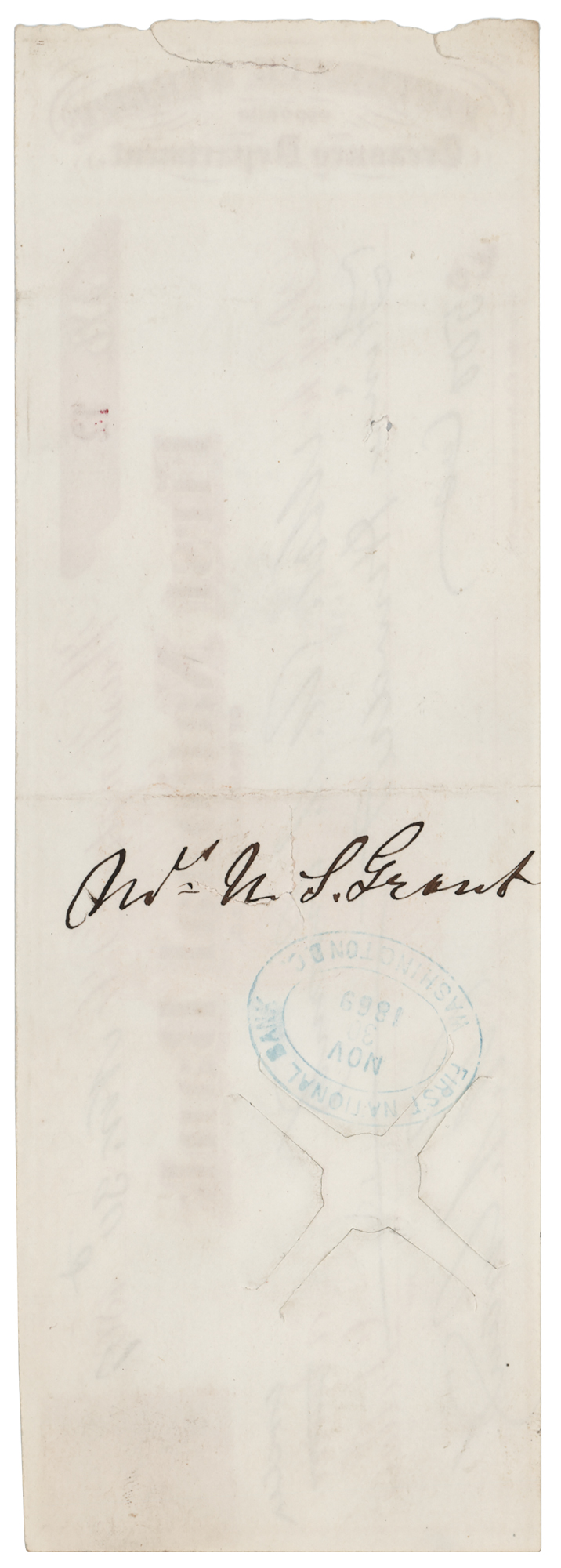 First National Bank check, 8 x 2.75, filled out and signed by Grant as president, "U. S. Grant," payable to "Mrs. U. S. Grant" for $500, November 30, 1869, and endorsed on the reverse by his wife, First Lady Julia Dent Grant, "Mrs. U. S. Grant." In fine condition. A remarkable combination of signatures on a scarce presidential check—a superlative, highly desirable piece.