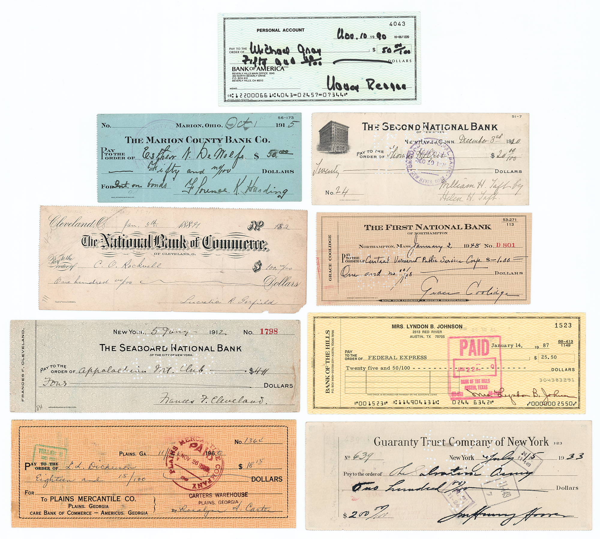 Group of nine checks, each signed by a former first lady of the United States, ranging in size from 6 x 2.75 to 8.5 x 3.25, dated between 1891 and 1990, all but one filled out in that first lady's hand. Signers include: Lucretia Garfield, Frances Cleveland, Helen Taft, Florence Harding, Grace Coolidge, Lou Henry Hoover, Lady Bird Johnson (filled out in type, signed "Mrs. Lyndon B. Johnson"), Rosalynn Carter, and Nancy Reagan. In overall fine condition.