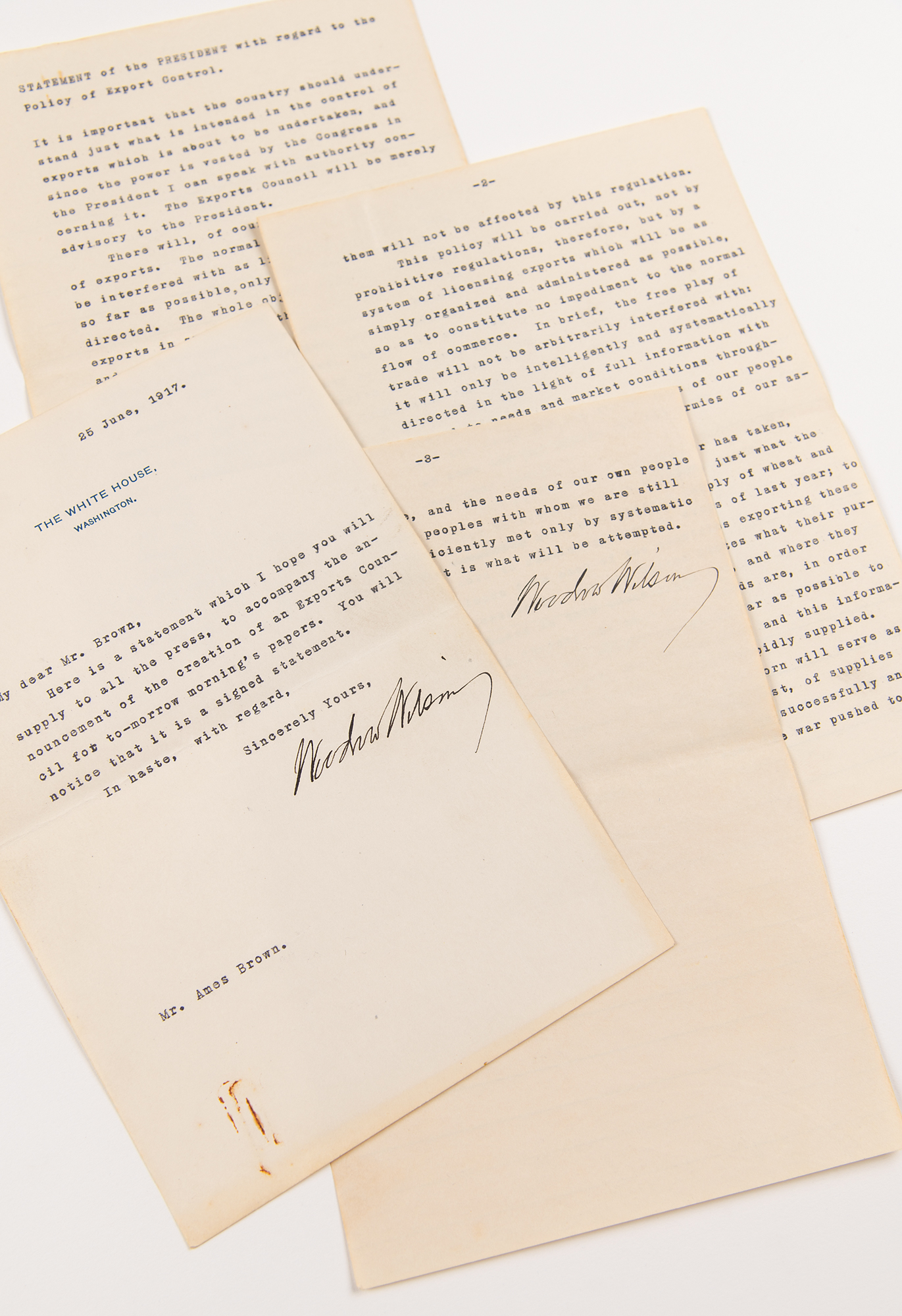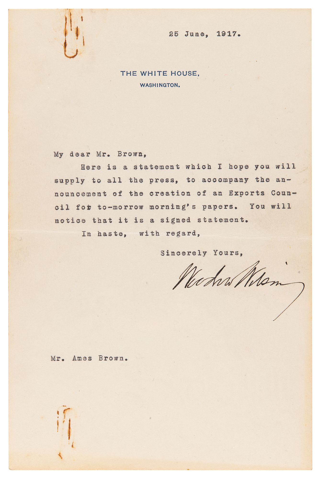 Includes President Wilson's cover letter to news reporter Ames Brown: a TLS as president, signed "Woodrow Wilson," one page, 5.25 x 8, White House letterhead, June 25, 1917, in full: "Here is a statement which I hope you will supply to all the press, to accompany the announcement of the creation of an Exports Council for to-morrow morning's papers. You will notice that it is a signed statement." In fine condition, with a rusty paperclip impression to the transmittal letter.