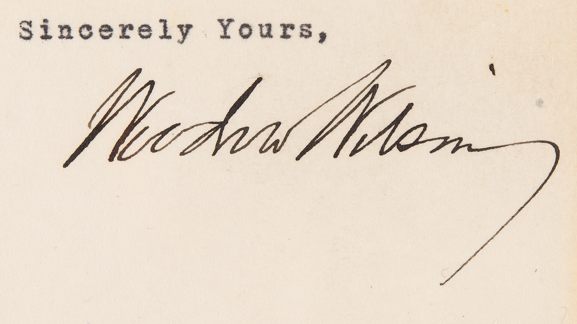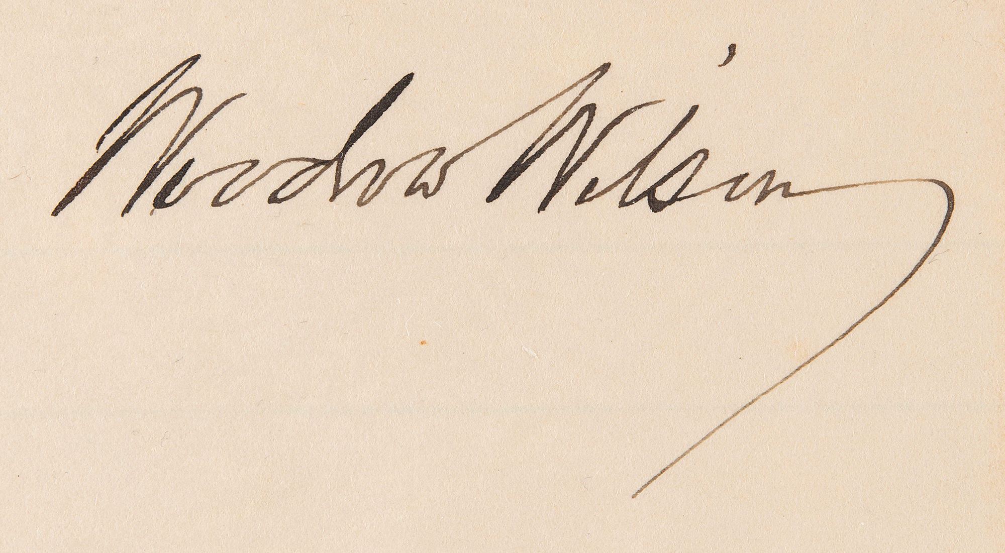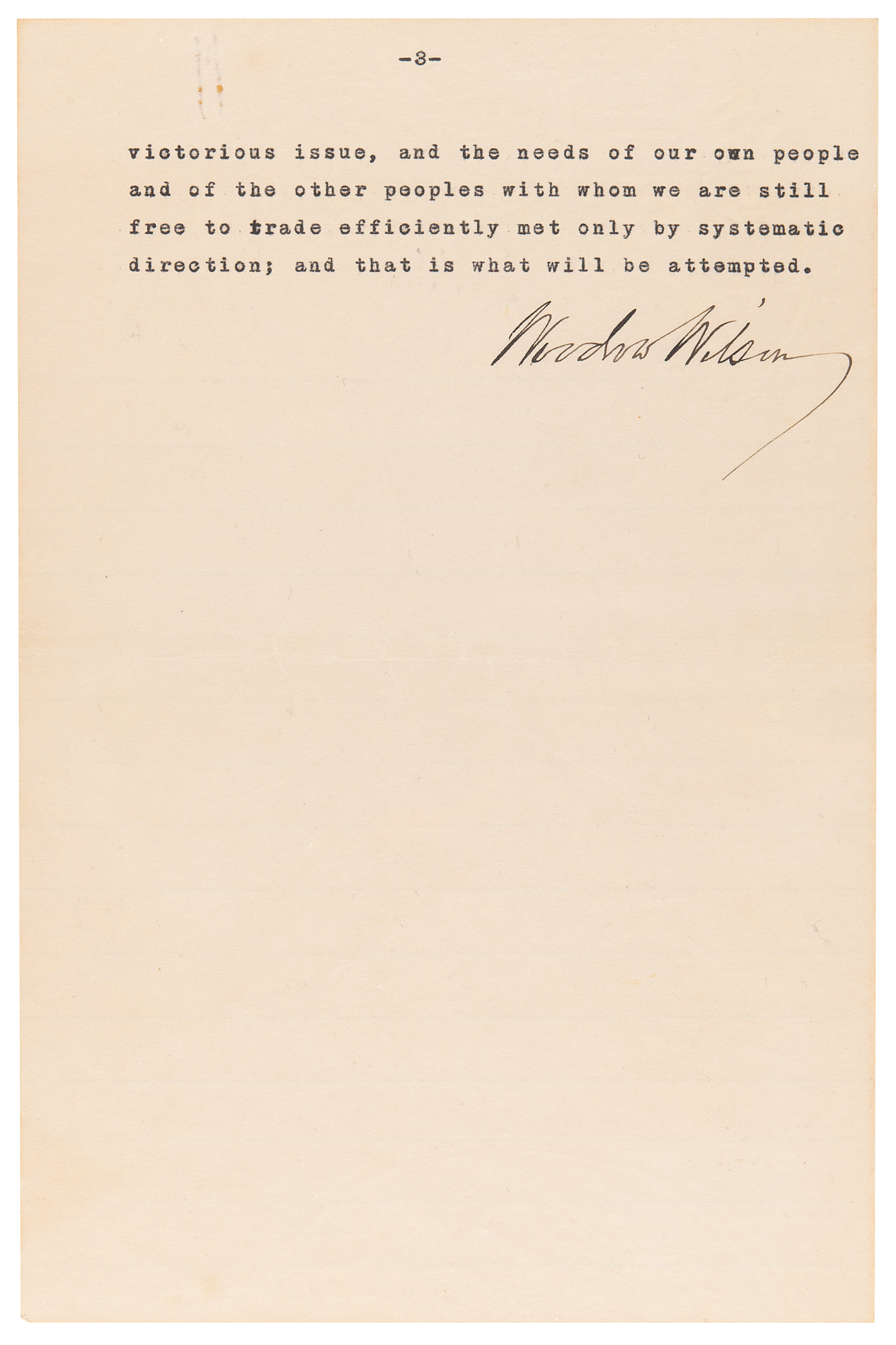 Typed statement signed as president, "Woodrow Wilson," three pages, 5.25 x 8, June 25, 1917. An official typescript of President Wilson's public declaration of economic warfare against Germany, headed: "Statement of the President with regard to the Policy of Export Control." In part: "It is important that the country should understand just what is intended in the control of exports which is about to be undertaken, and since the power is vested by the Congress in the President I can speak with authority concerning it. The Exports Council will be merely advisory to the President.