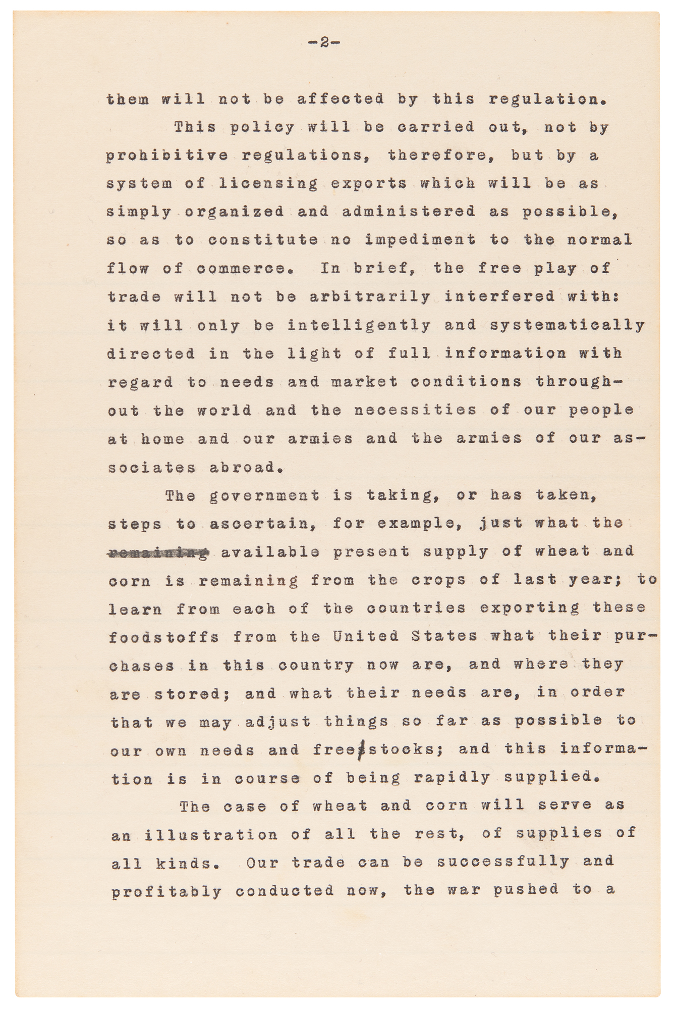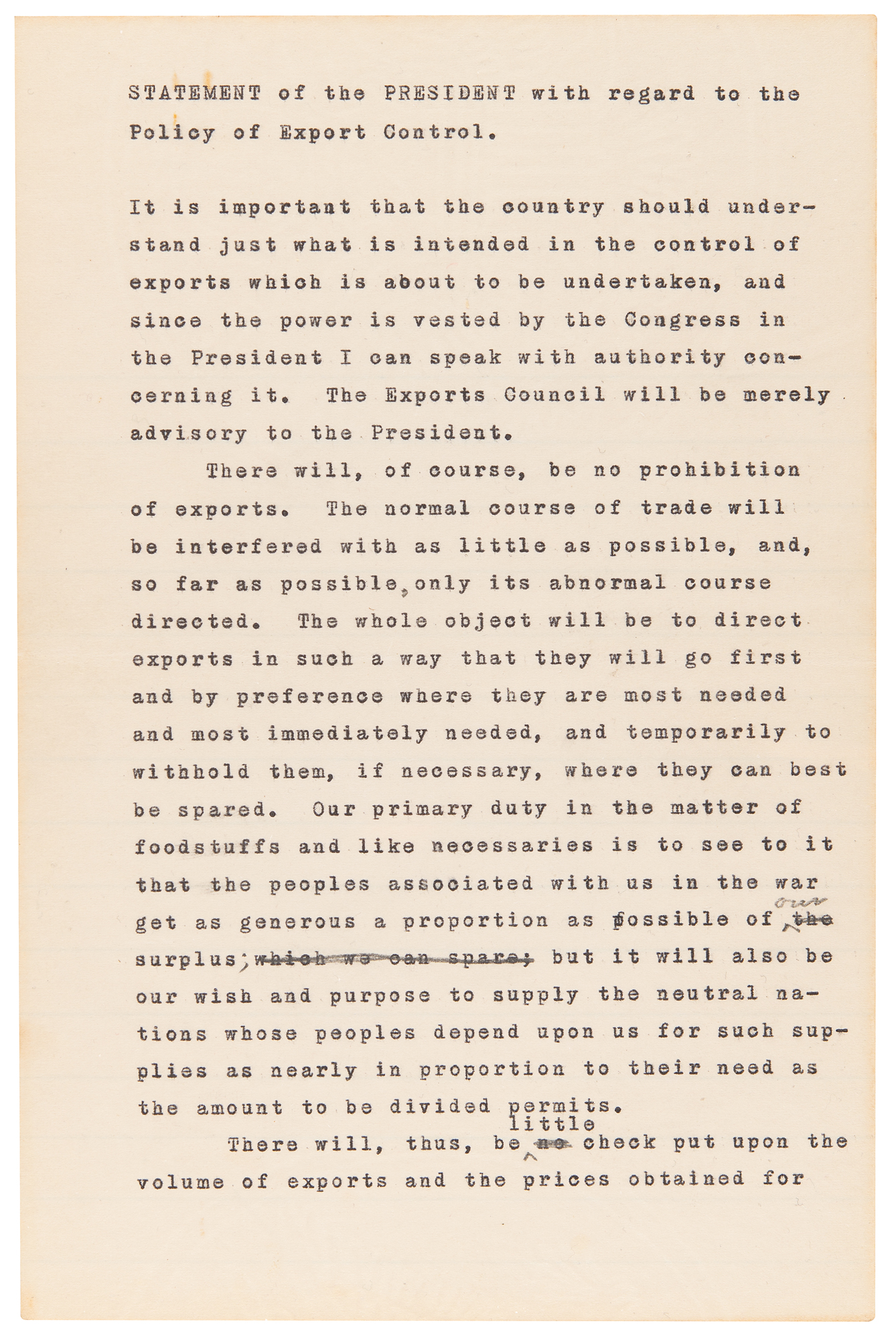 There will, of course, be no prohibition of exports. The normal course of trade will be interfered with as little as possible, and, so far as possible, only its abnormal course directed. The whole object will be to direct exports in such as way that they will go first and by preference where they are most needed and most immediately needed, and temporarily to withhold them, if necessary, where they can best be spared. Our primary duty in the matter of foodstuffs and like necessaries is to see to it that the peoples associated with us in the war get as generous a proportion as possible of [our] surplus; [which we can spare;] but it will also be our wish and purpose to supply the neutral nations whose peoples depend upon us for such supplies as nearly in proportion to their need as the amount to be divided permits.