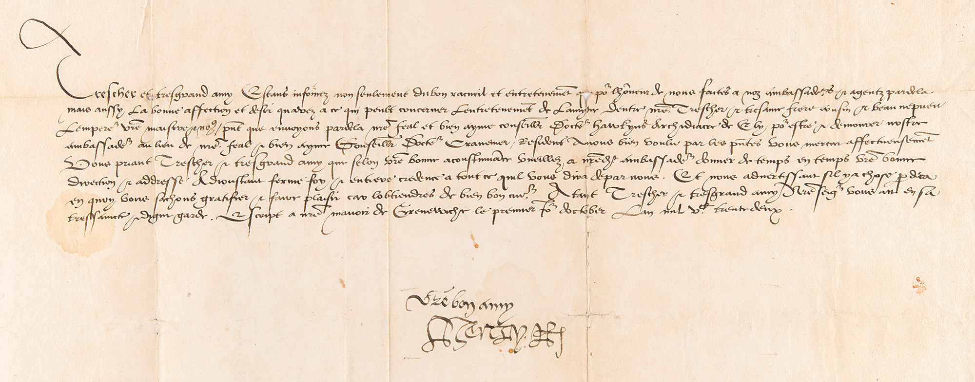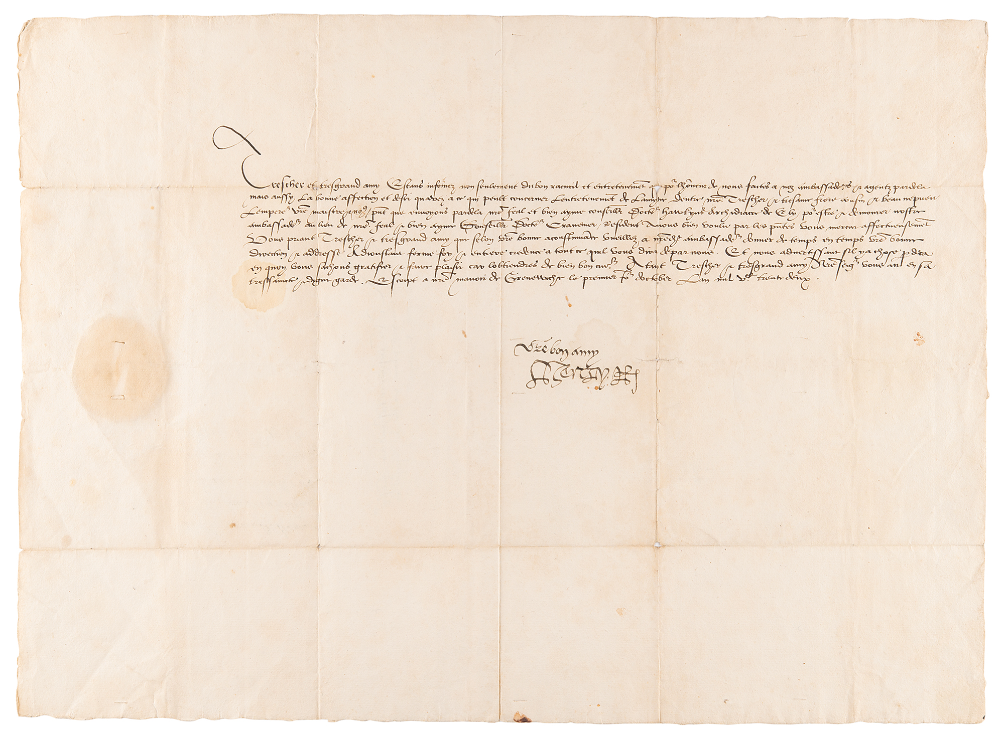 LS in French, signed “V[ot]re bon amy, Henry R,” one page, 17 x 12.25, October 1, 1532. Important letter to the "trescher et tresgrand amy Le seig[eu]r de Granvele premier maistre des Requestes et Conseill[e]r de L'emperor," the master of requests for the Emperor, thanking him for welcoming his earlier ambassadors and agents and for helping to maintain good relations between England and the Empire. He announces that he is sending Nicholas Hawkins, Archdeacon of Ely, as ambassador in place of Thomas Cranmer. King Henry VIII thanks him affectionately and asks him to give credence to everything that Dr. Hawkins would say on Henry's behalf. Addressed on the reverse, which retains its papered seal embossed with royal arms. In fine condition, with a faint stain touching the signature.