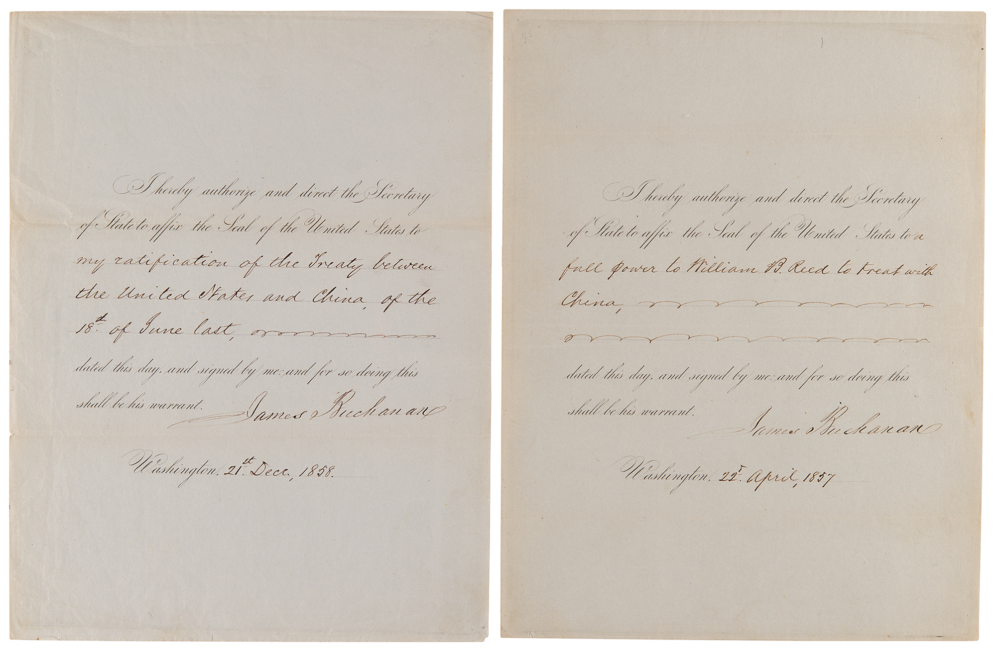 Significant pairing of two presidential documents: a DS as president, signed "James Buchanan," one page, 8 x 10.5, April 22, 1857, directing the Secretary of State to "affix the Seal of the United States to a full power to William B. Reed to treat with China"; and a DS as president, signed "James Buchanan," one page, 8 x 10.5, December 21, 1858, directing the Secretary of State to "affix the Seal of the United States to my ratification of the Treaty between the United States and China, of the 18th of June last." In overall fine to very fine condition.