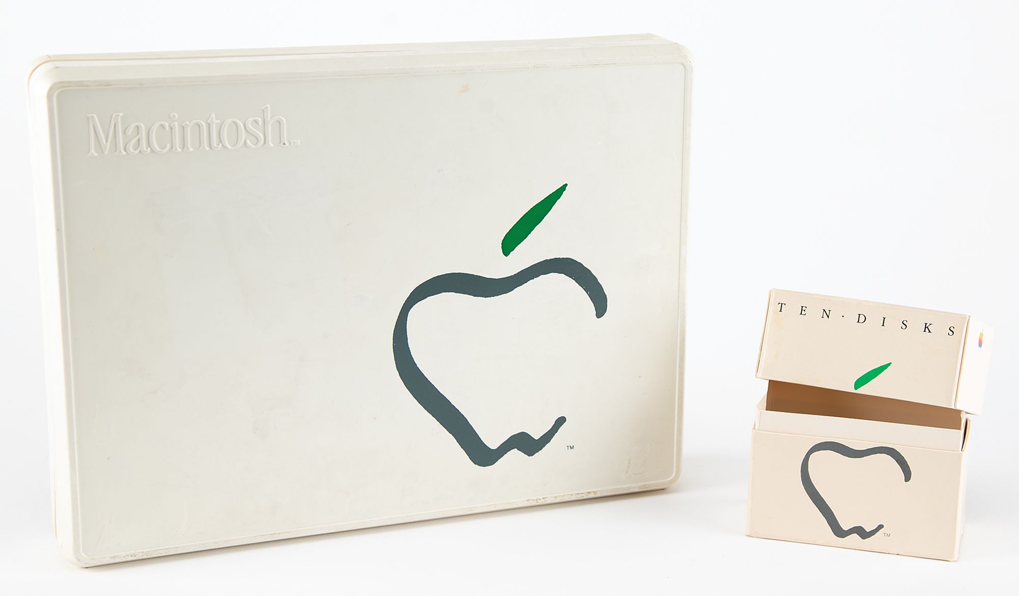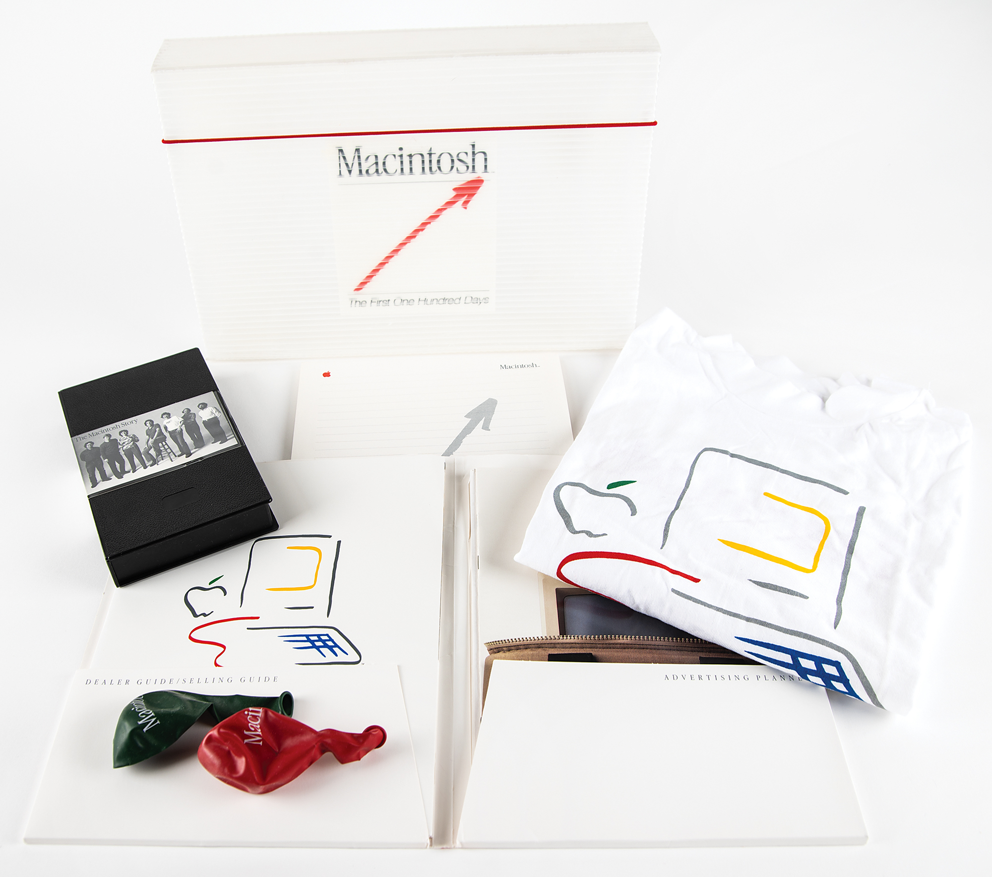 Also includes Mok’s personally embossed Macintosh computer backplate, an empty “Ten Disks” floppy disk holder, and a rare Macintosh ‘The First One Hundred Days’ Launch Kit for Apple dealers, which contains a ‘Macintosh Dealer Material’ folder with selling and dealing guides, an introductory booklet, order sheets, marketing material, a white medium-sized Apple ‘Picasso’ logo t-shirt, a VHS tape of “The Macintosh Story,” a pad of 8.5 x 11 Macintosh stationery, and two Macintosh balloons. In overall fine condition, with a small chip to the mouse, and trivial scuffs to the computer, accessory case, and keyboard, the latter of which bears some cracking near the connection port and the letter ‘N’ key detached but present.