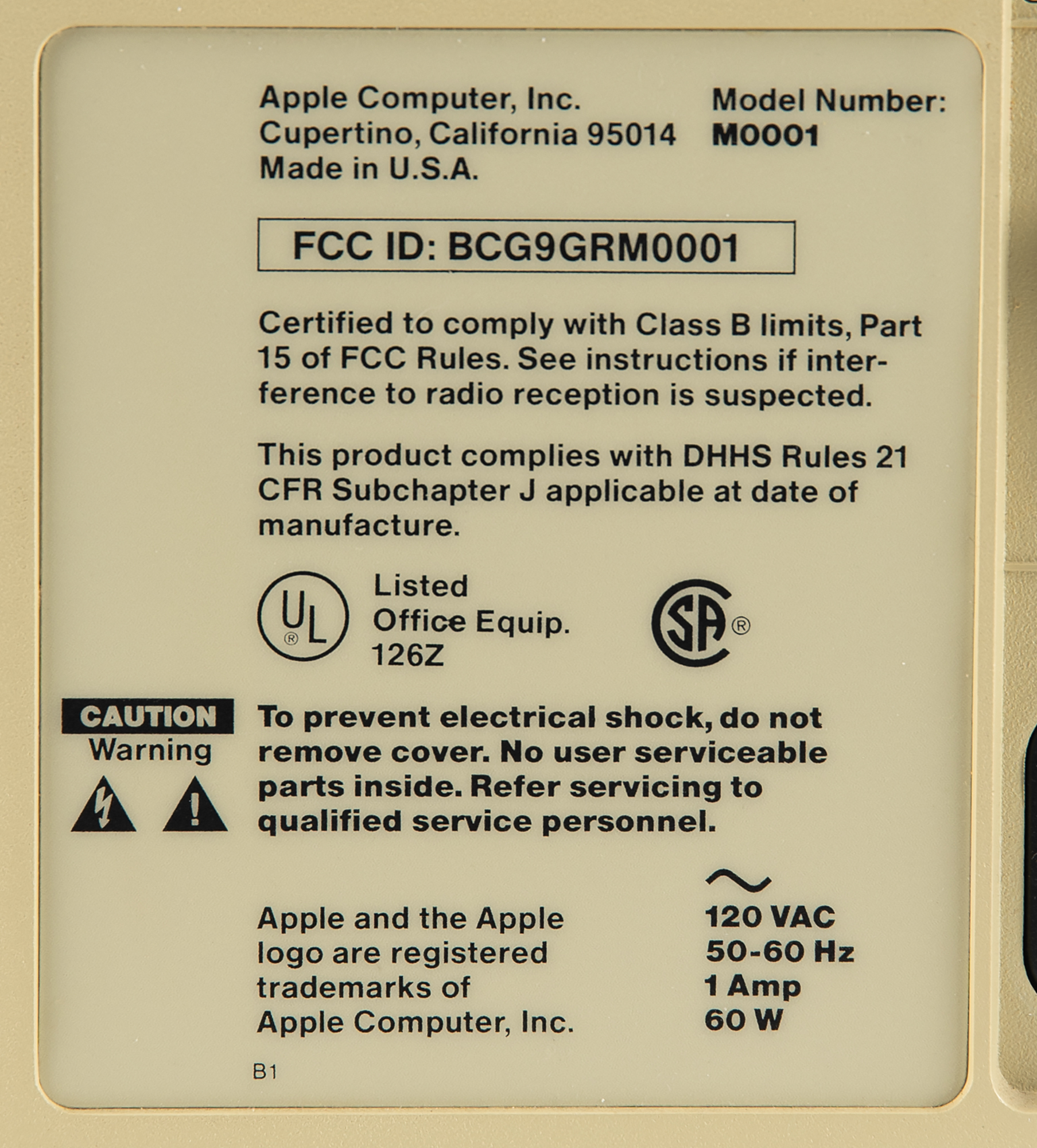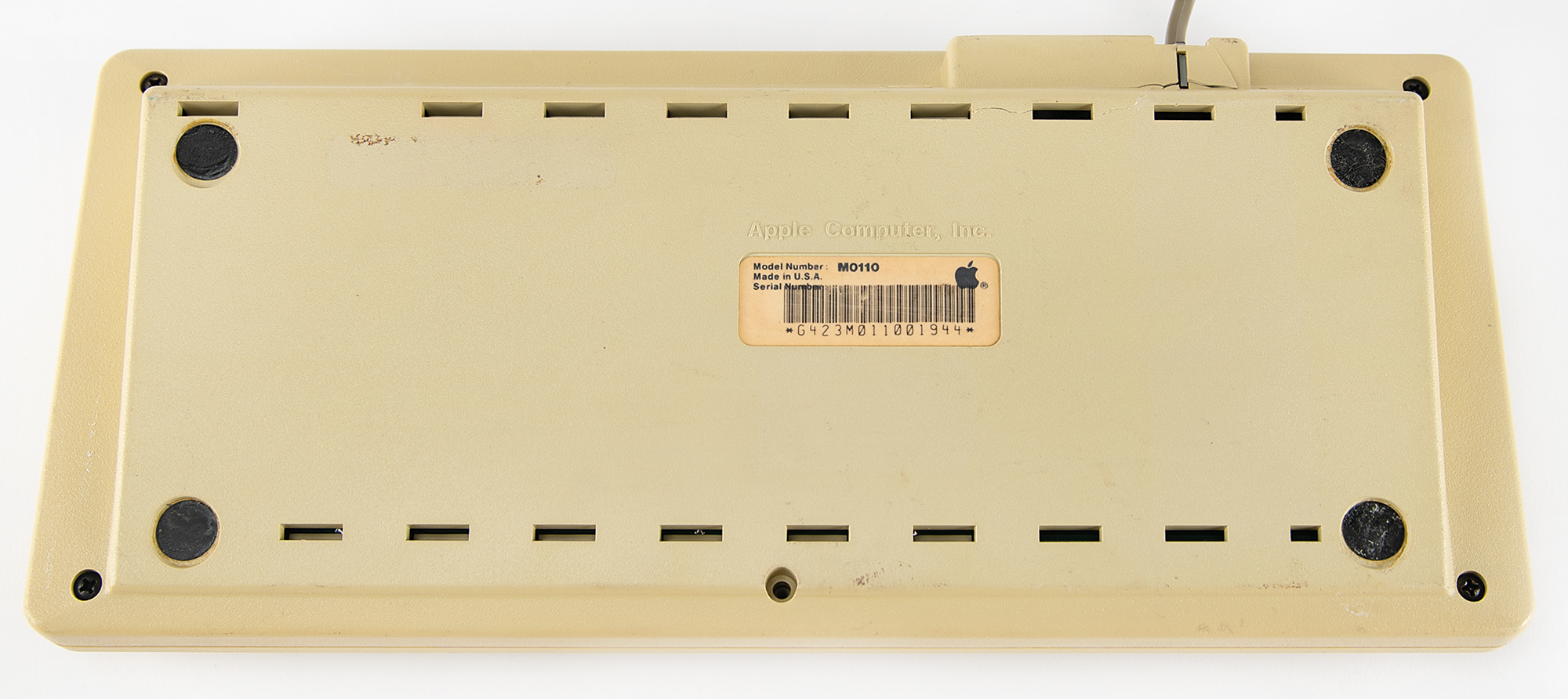 Original Apple Macintosh 128K computer from 1984, originating from the personal collection of former Apple creative director Clement Mok. Model No. M0001, Serial No. F4241LVM0001, with the FCC ID plate on the back and the serial number label affixed below the front bezel. The serial number indicates that this Macintosh was manufactured in Fremont, California during the 24th week of 1984. Includes its power cable (with sleeve), Macintosh Mouse (M0100), Macintosh Keyboard (M0110), and its original plastic accessory case, which ‘A Guided Tour of Macintosh and MacWrite-MacPaint’ cassette tape, a brochure, a spiral-bound manual, and two floppy disks for “Macintosh: MacWrite-MacPaint, A Guided Tour” and “Macintosh: System and MacWrite-MacPaint.” The underside of the case bears Mok's hand-addressed ownership plate.
