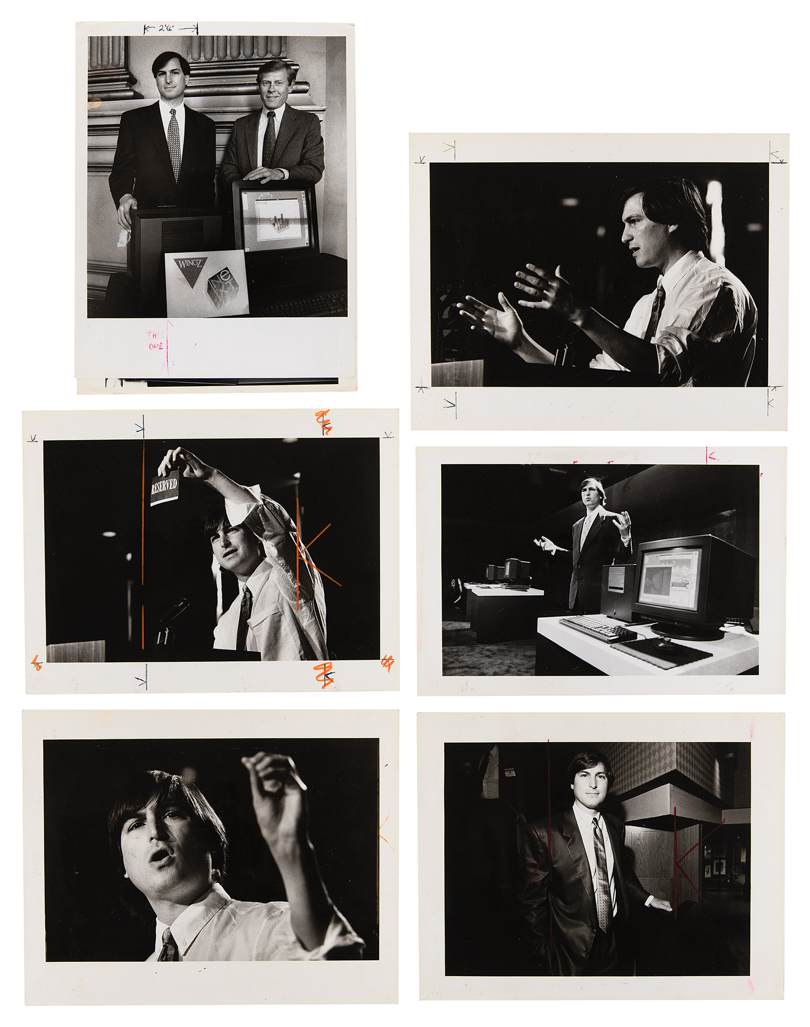 Group lot of six glossy silver gelatin press photos of Steve Jobs taken by various photographers of the San Francisco Examiner between 1987 and 1990, during Jobs’s tenure as founder and CEO of NeXT, Inc. The photos, which range in size from 14 x 9.5 to 11 x 14, either show Jobs posing for the camera or delivering a speech. The reverse of each bears affixed newspaper clippings from the Examiner and ‘Examiner Photo’ labels, three of which read: “3/29/88, Steven Jobs, Chairman of NeXT, Inc., speaks at luncheon…Claremont Hotel, Berkeley.” The others read: “10-26-87, Steve Jobs at the Cathedral Hill Hotel” and “9/18/90, Next Inc. Chairman Steve Jobs unveils the latest in computer software programming which is compatible with nearly all computer systems. Jobs made the announcement during a news conference at Davies Symphony Hall.” The sixth photo, which depicts Jobs standing behind a NeXT computer with another gentleman during a NeXT and Wingz presentation, is permanently affixed to the front of a seventh press photo of Jobs from 1989; as such, the reverse of the sixth photo and the front of the seventh are unable to be viewed. All of the photos bear editorial marks in felt tip or grease pencil. In overall very good to fine condition, with scattered marks and slight edgewear.