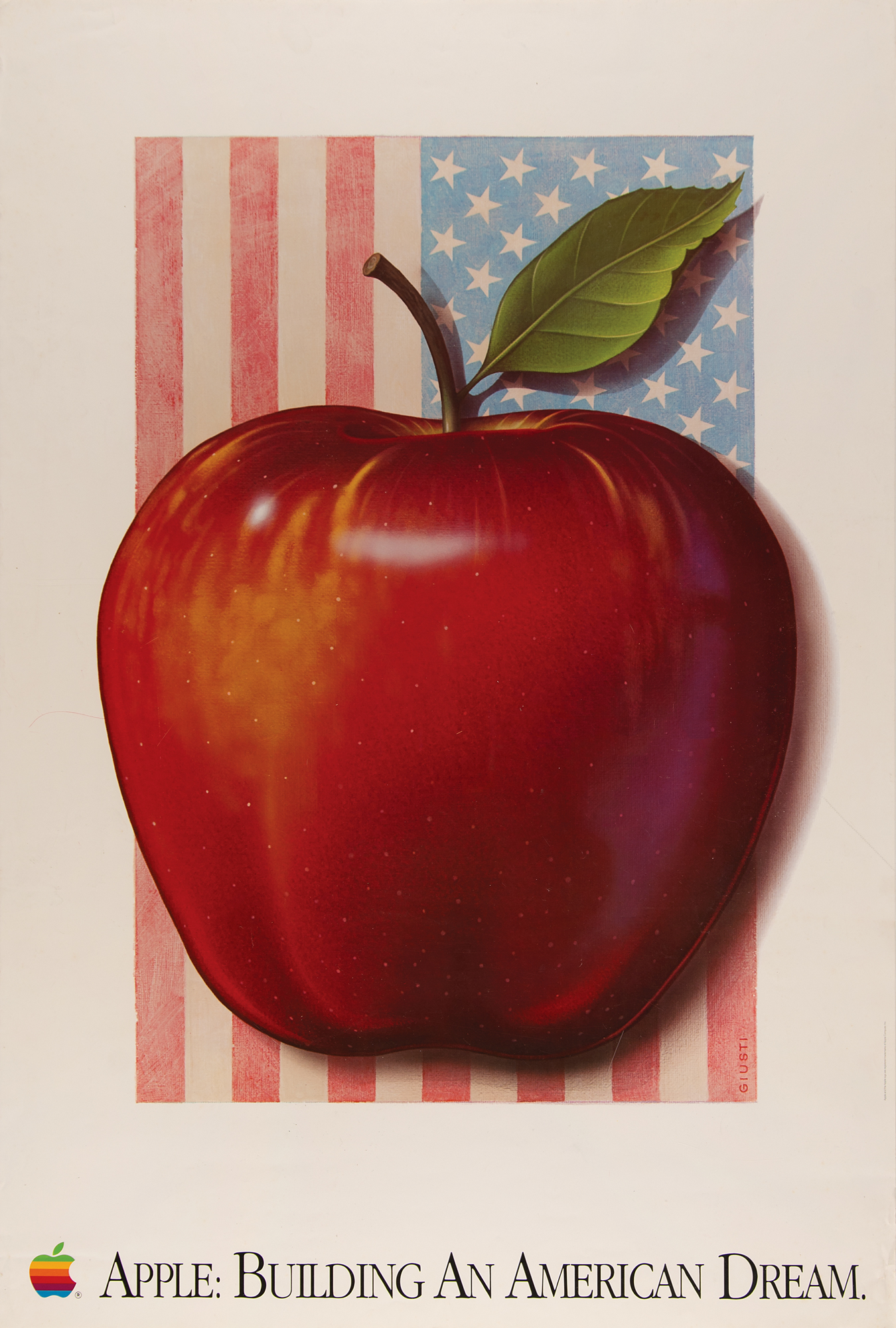 Appealing group lot of Apple Computer print collateral produced between 1984 and 1987, which includes: a color 24 x 36 poster with an artistic image of an apple over the American flag, with lower text: “Apple: Building an American Dream”; a color semi-glossy 5 x 7 postcard with the ‘American Dream’ design; a group of seven 3.75 x 4.5 Apple ‘rainbow’ logo decals; an accordion-style six-fold greeting card, measuring 31.5 x 7 open, containing six images of apple-inspired artwork and printed text: “Apple Computer Wishes You Many Happy Visions of the Season”; a Christmas card from 1987, 5.25 x 7.25, featuring a line drawing of an apple-decorated Christmas tree on the front and the inside with printed text: “Thank you for making 1987 the brightest year ever. Happy Holidays”; and a circa 1984 booklet for the ‘Apple Computer Supplier Relations Program,’ eight pages, 8.5 x 11, with a printed letter from CEO John Sculley (featuring a facsimile signature) reading, in part: “This brochure provides an introduction to our company and an overview of our Supplier Relations Program. We hope it will help us work together effectively toward a long-term, mutually profitable relationship.” In overall fine condition, with some marks and edgewear to the rolled poster.