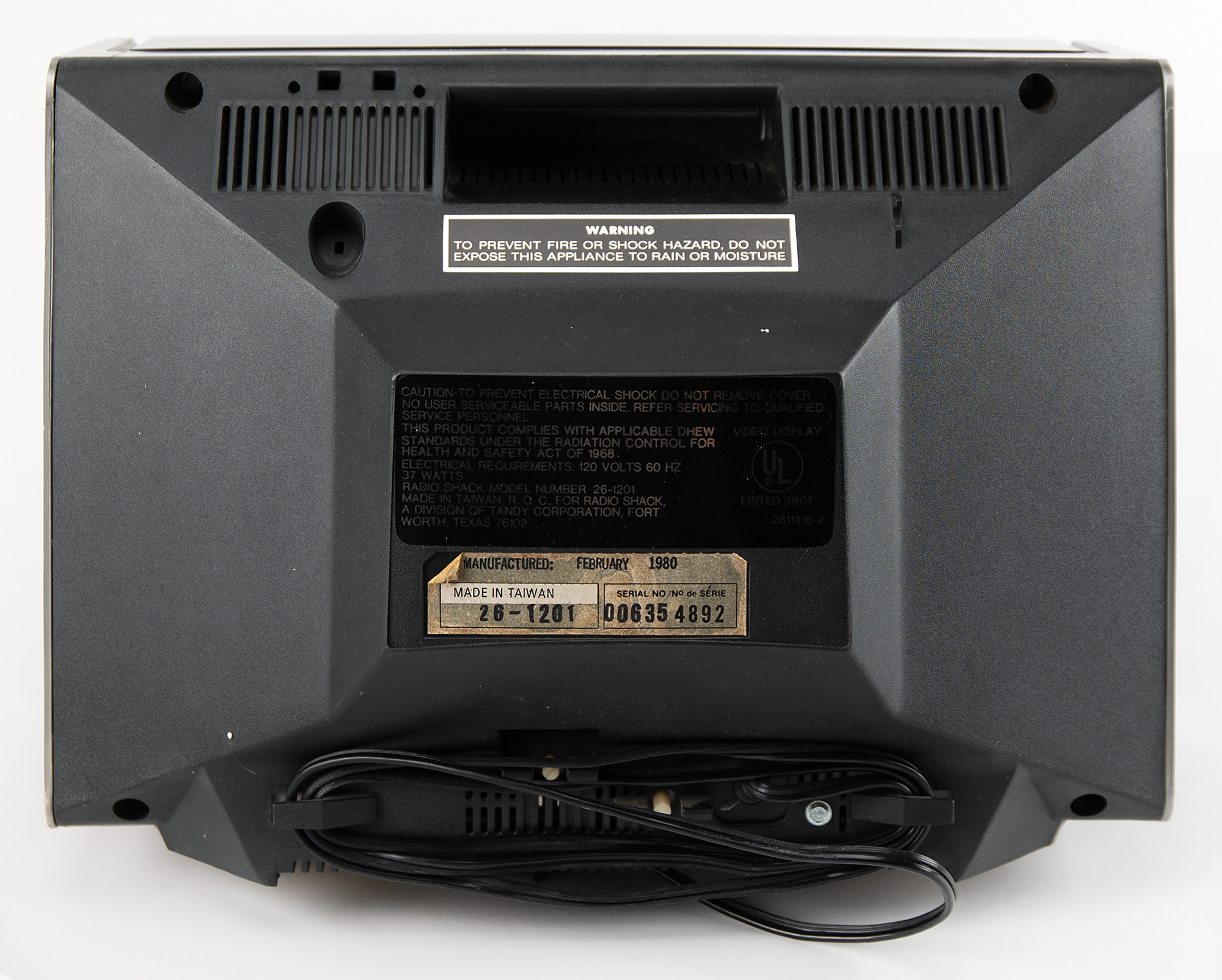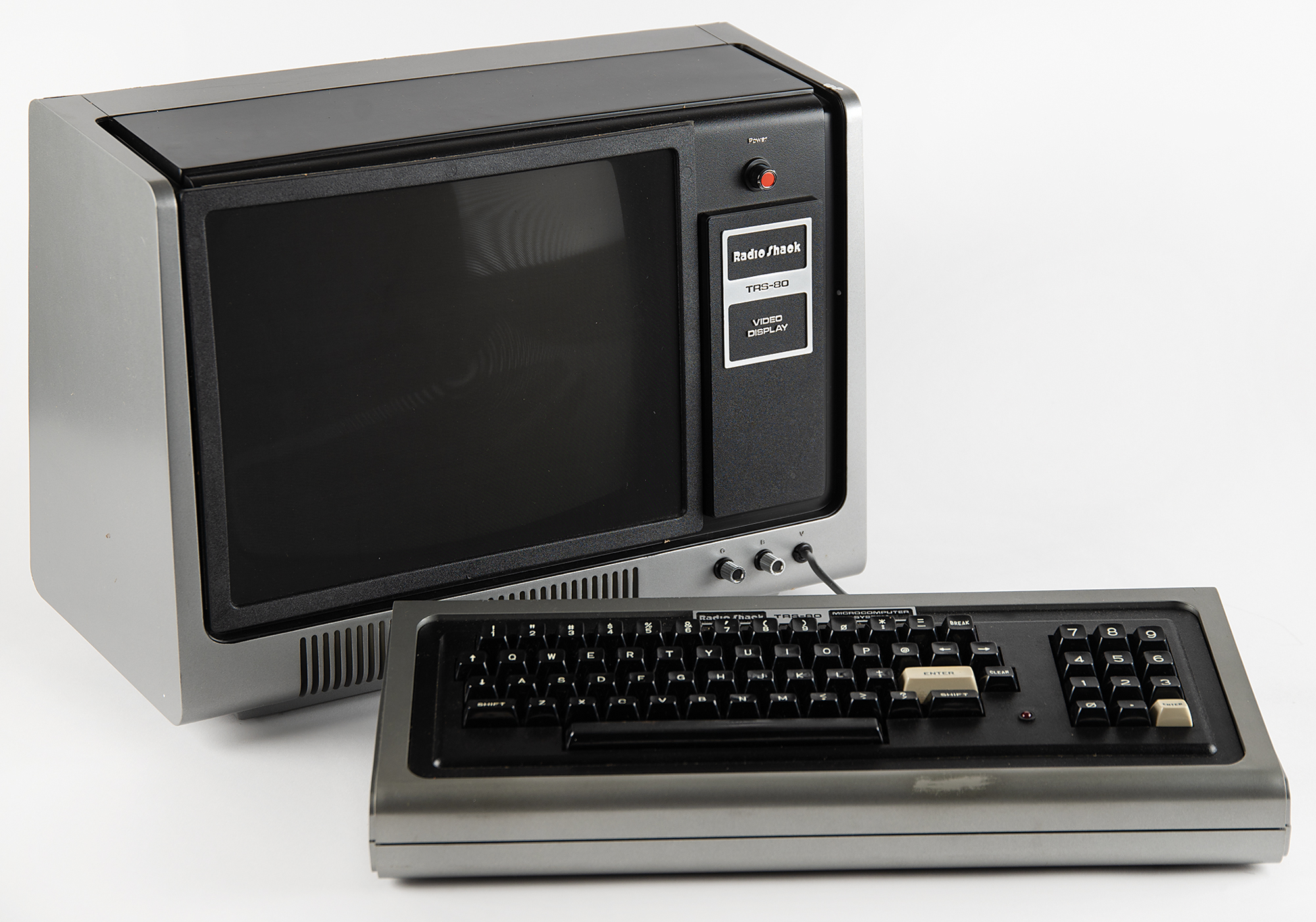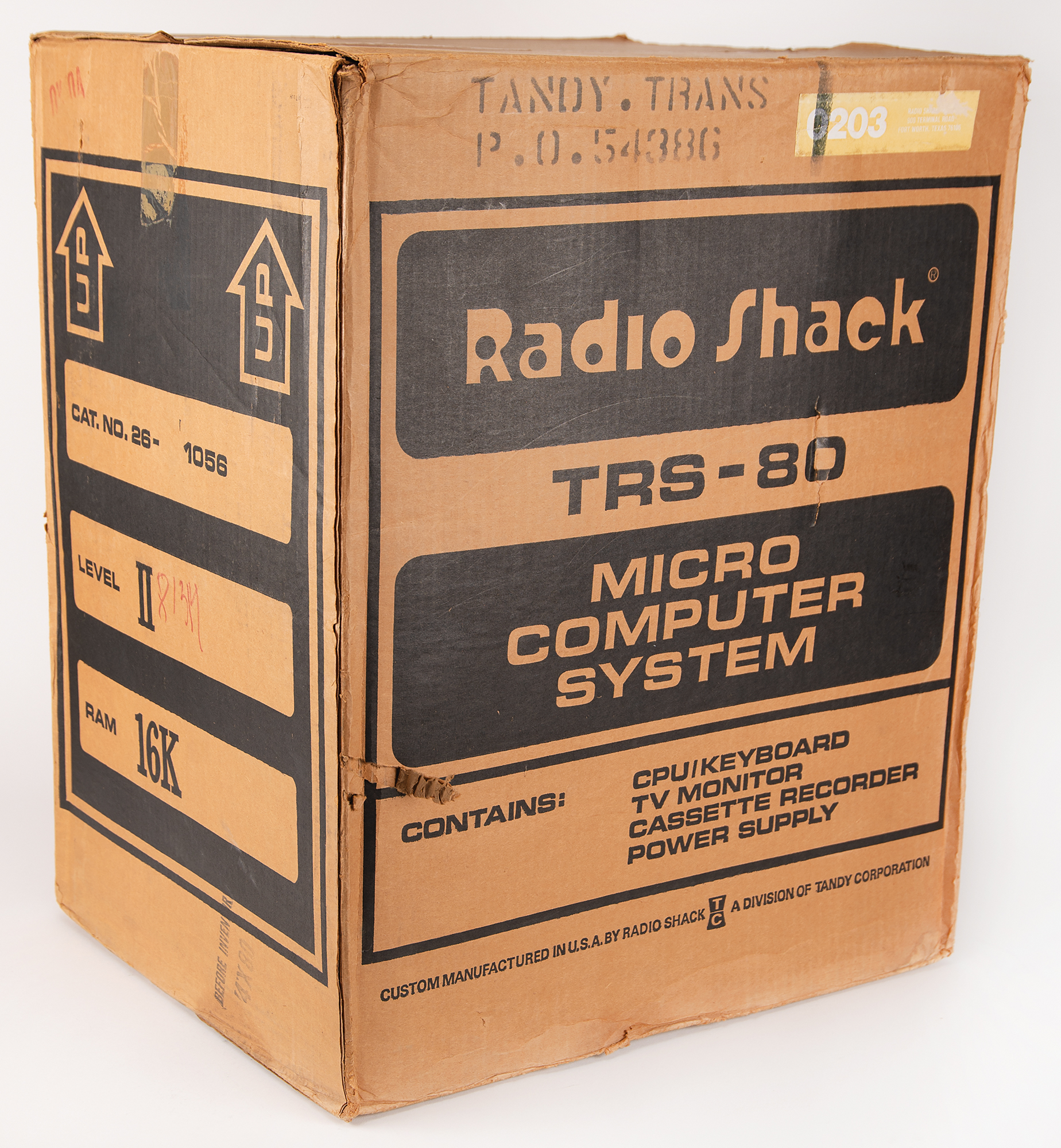 RadioShack TRS-80 Micro Computer System, complete with its original box and accessories. This TRS-80 Model I is a 16K, Level II System, with the manufacturer's label on the bottom identifying it as "Catalog Number 26-1006, Serial Number 081314." RadioShack's marketing material from the period explains: 'Level II is an advanced version of BASIC that offers vastly increased computing power and advanced programming features for greater versatility. The 16K, Level II system is the 'standard' Model I configuration and ideally suited to many small business and professional jobs.'