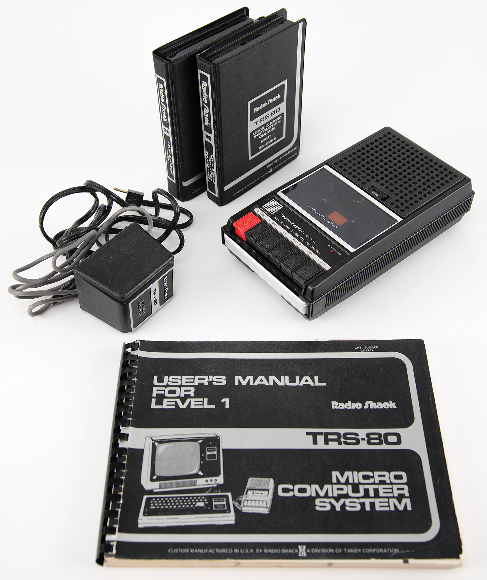 Includes its original box, containing the TRS-80 Video Display (manufactured February 1980, Cat. No. 26-1201, Serial No. 006354892), TRS-80 power supply, Realistic CTR-80 Battery/AC Cassette Recorder, eight cassette tapes for the two-part "Level II Basic Instruction Course," and "User's Manual for Level 1" guide. Untested and in fine cosmetic condition.