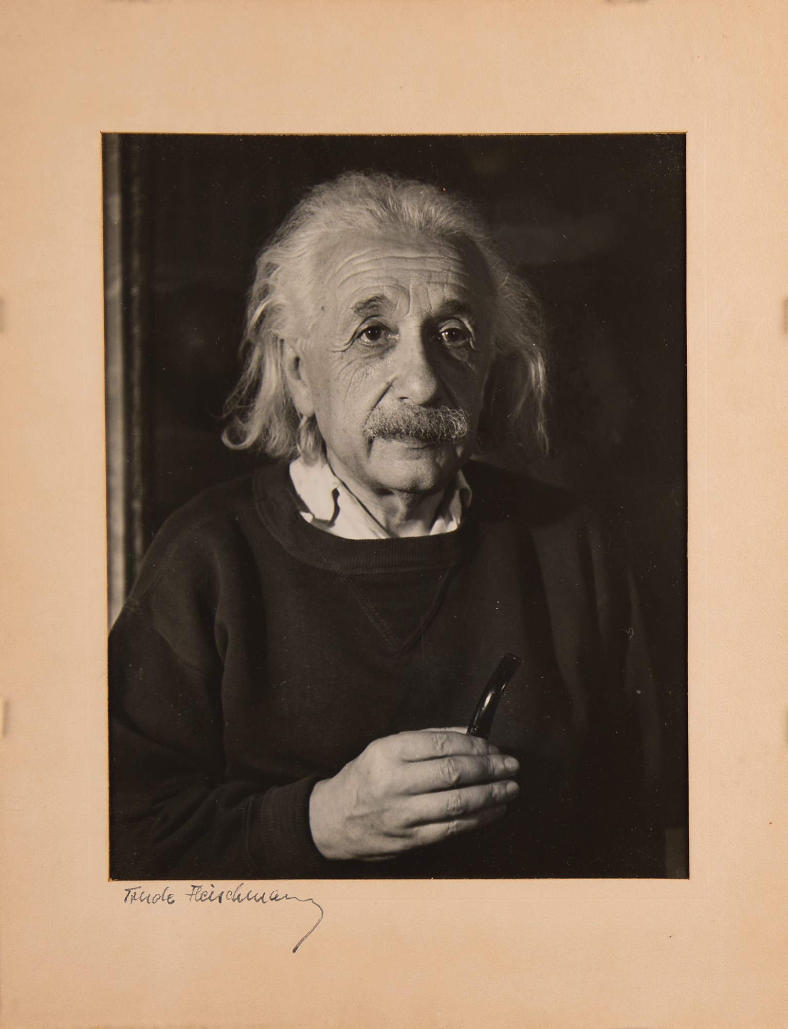 Original vintage semi-glossy 7 x 9 silver gelatin photograph of Albert Einstein, pipe in hand, taken by Trude Fleischmann circa 1946, showing the genius in a handsome half-length pose, holding his beloved smoking pipe in his right hand. Displayed in its original 10 x 12.75 mat, signed on the mount in fountain pen by the photographer, "Trude Fleischmann," with Fleischmann's credit stamp on the backing. In fine condition.