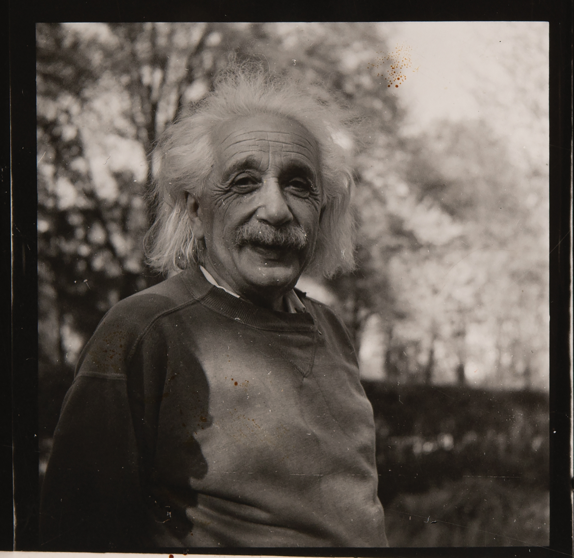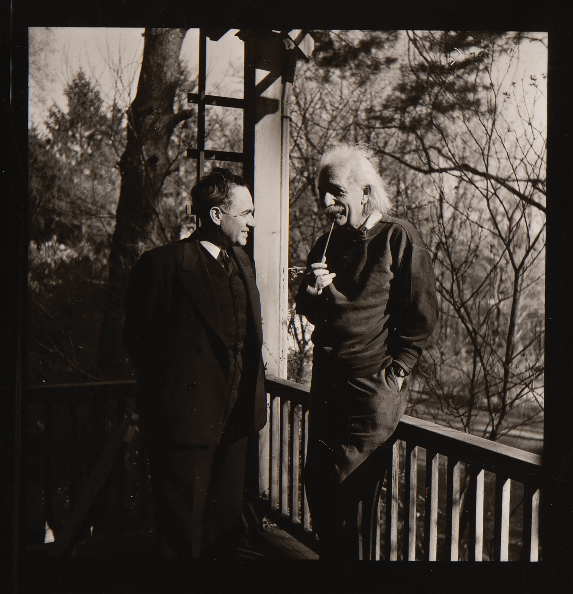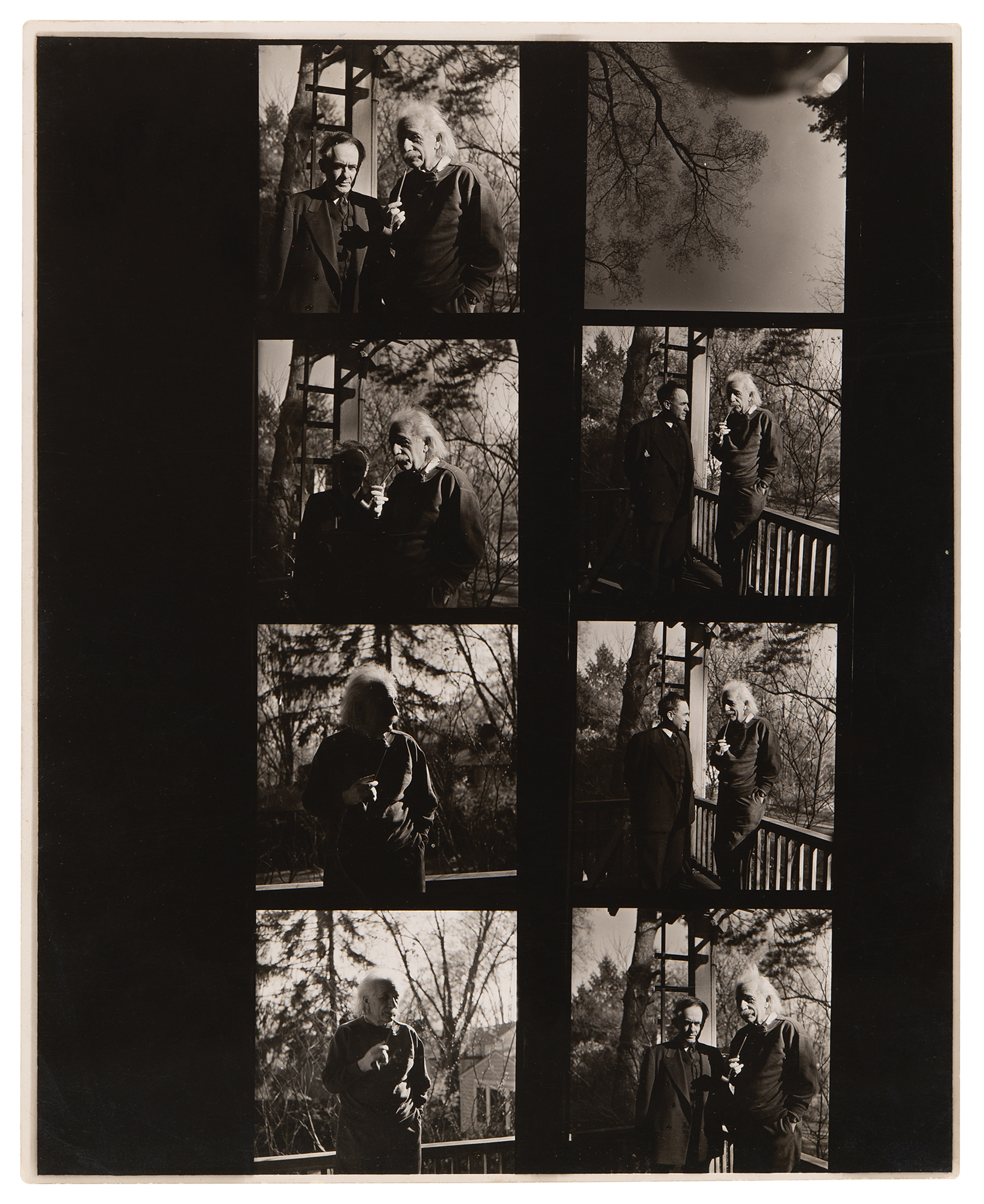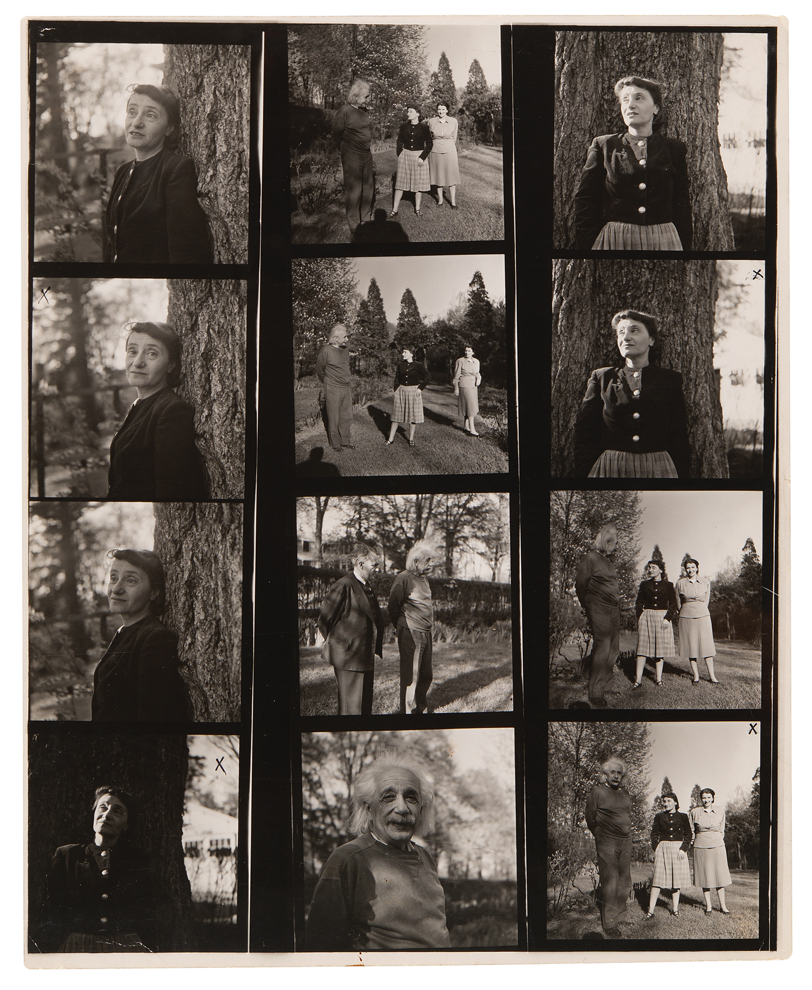 Two original vintage glossy 8 x 10 silver gelatin contact print photographs of Albert Einstein at ease with his friends and family: one features eight images, seven of which show the genius, showing him smoking his pipe on a porch with his close friend Otto Nathan; the other features twelve images, six showing Einstein, along with his stepdaughter, Margot Einstein, and his secretary, Helen Dukas. Both sheets include excellent portraits of Albert Einstein, showing him in wonderful half-length and full-length poses. In overall fine condition.