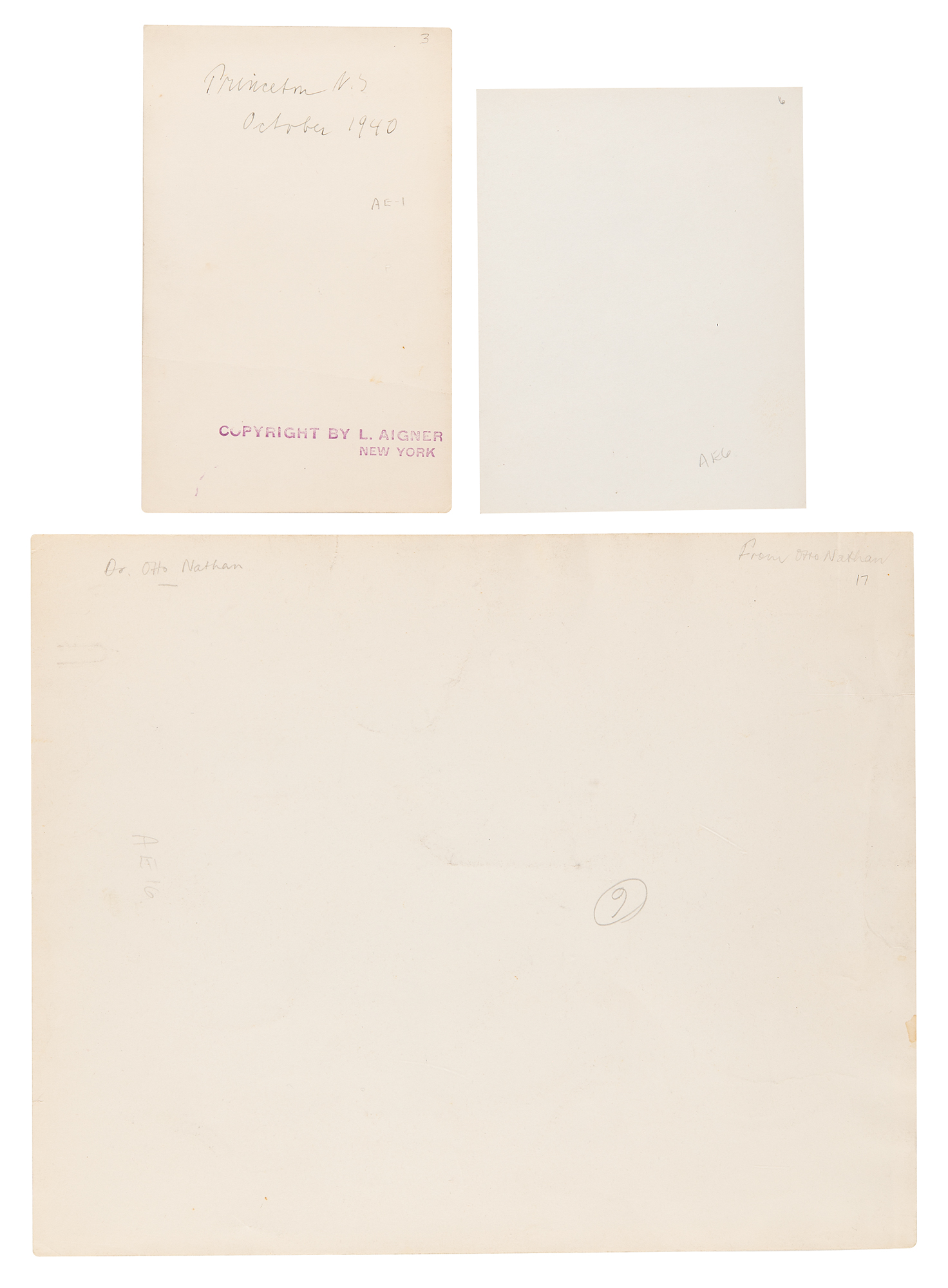 Outstanding grouping of three original vintage glossy silver gelatin photographs: a 10 x 8 photo of Albert Einstein walking down a long park pathway in winter, wearing a long coat and winter cap (marked "From Otto Nathan" on the reverse); a 3.75 x 4.75 photograph of Einstein walking in a garden with Otto Nathan; and a 3.5 x 5.5 photo of Einstein in his Princeton study with his secretary, Helen Dukas, taken in October 1940, with a "Copyright by L. Aigner, New York" stamp on the reverse. In very good to fine condition, with scattered creasing and a tiny edge tear to the larger photo, and a horizontal crease to the lower part of the Princeton office photo.