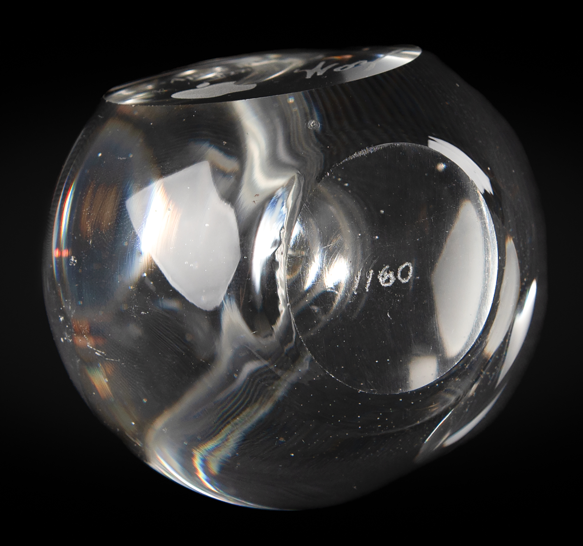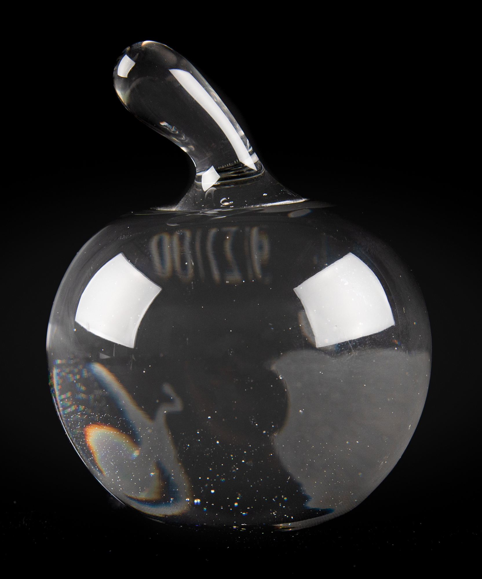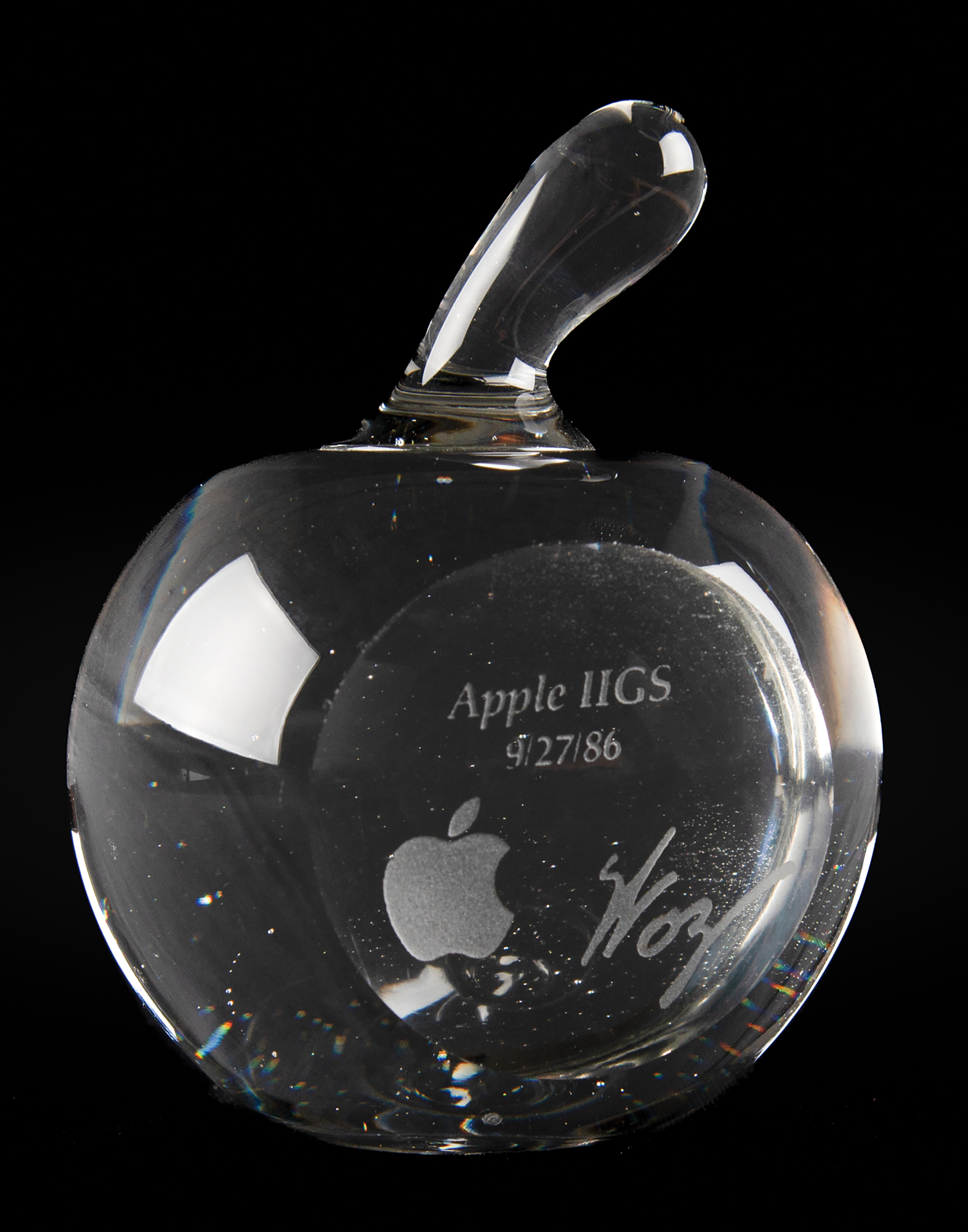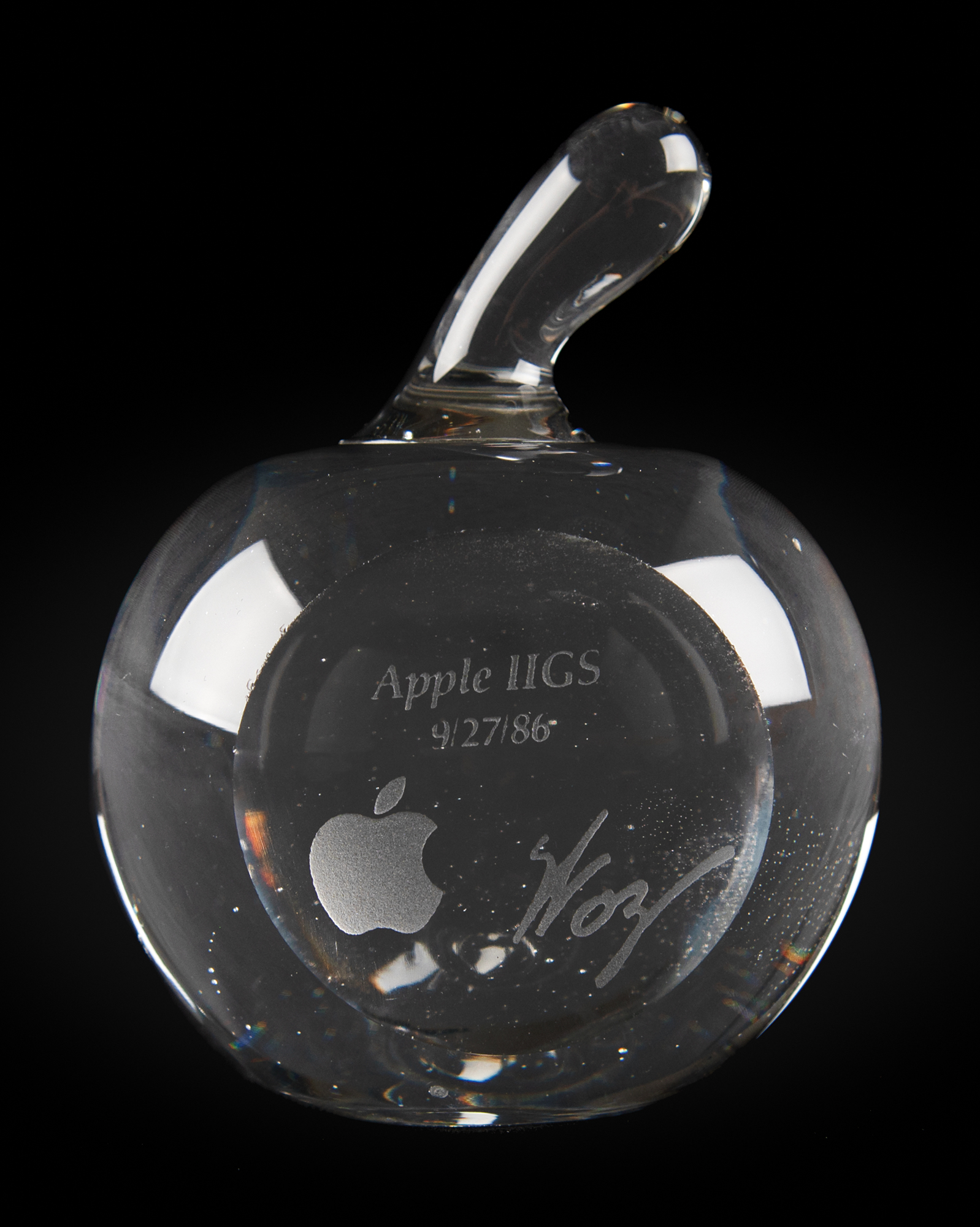 Limited edition ‘crystal apple’ paperweight award issued to developers of the Apple IIGS personal computer in 1986, measuring 3″ x 3.75″ x 2.75″, with the front laser etched with the Apple logo, the signature of Steve Wozniak, and “Apple IIGS, 9/27/86.” The base of the award is engraved with the edition number, “1160.” In fine condition. September 27, 1986, marked the first day that Apple dealers were allowed to sponsor public demonstrations of the Apple IIGS.