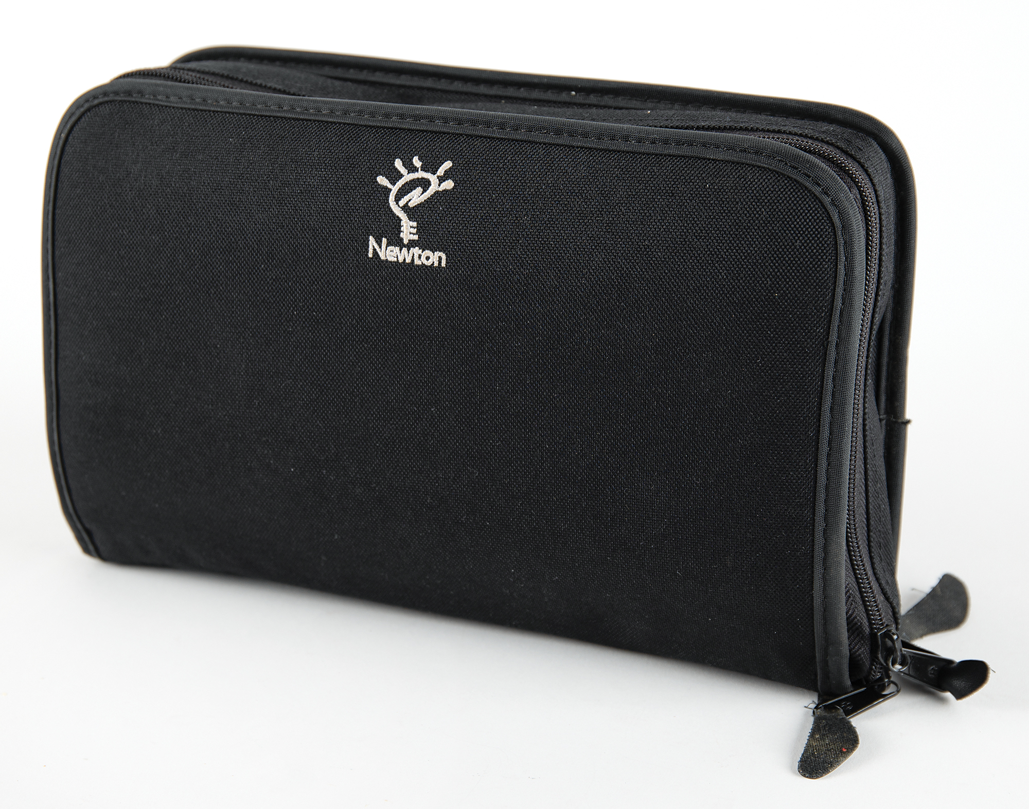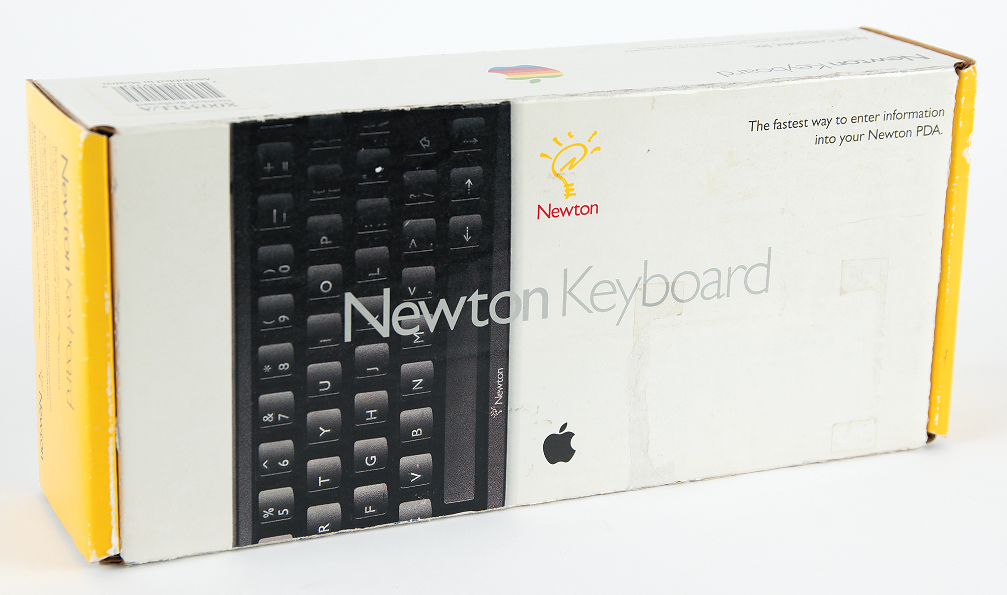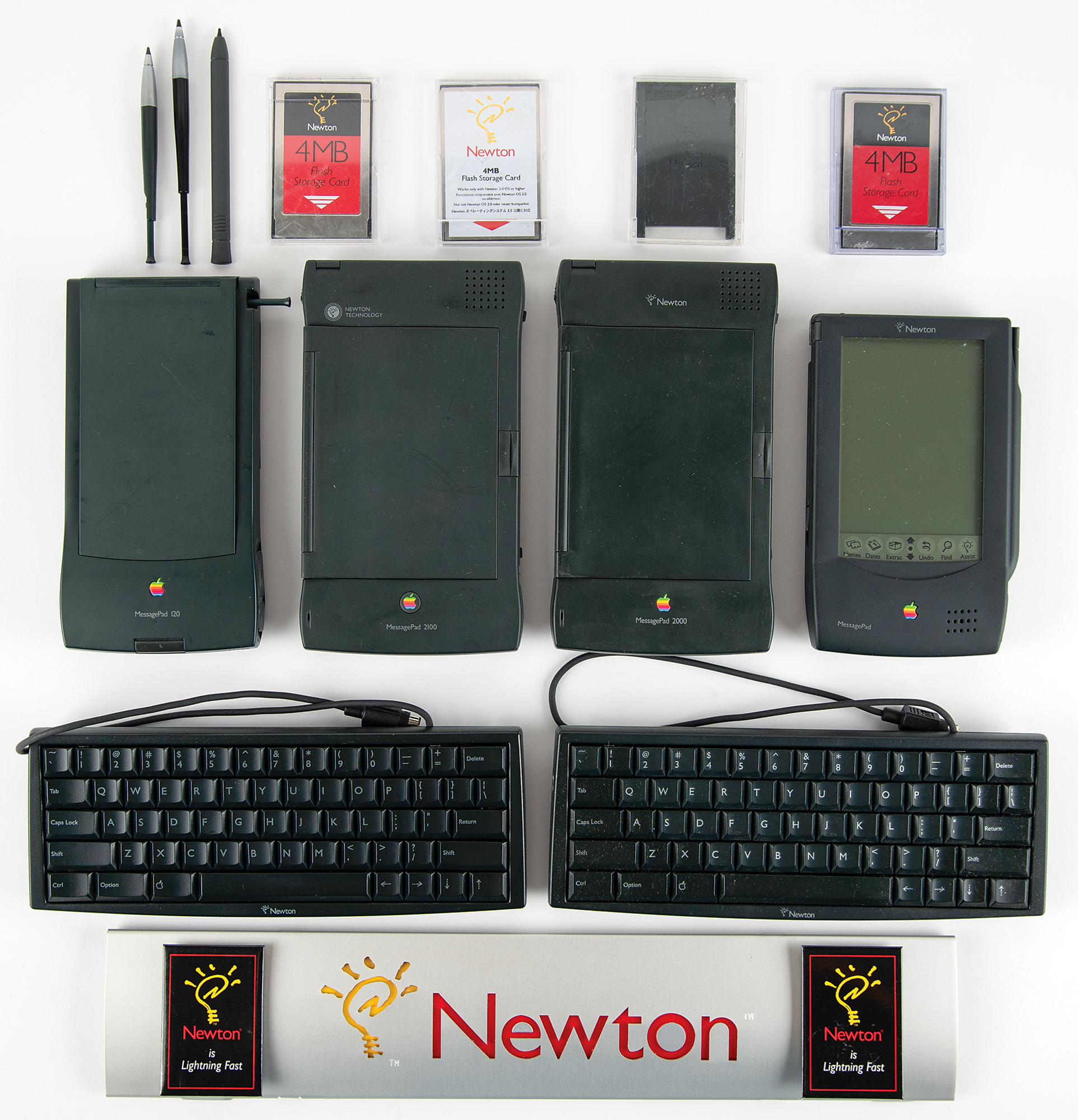 Group lot of seven Apple Newton items from Apple Computer, including: a rare 18˝x 3.5˝ store display sign for the Newton, with the ‘light bulb’ logo and both ends bearing Velcro-affixed logo cards with tagline: “Newton is Lightning Fast”; a non-working Newton MessagePad 100 with protective case; a functional Newton MessagePad 120; a functional Newton MessagePad 2000 with protective case; a Newton MessagePad 2100 with Newton carrying case and power cord; a Newton carrying case containing a Newton keyboard, power cord, adapter cable, and four storage cards; and a Newton keyboard with its original box. In overall fine condition.