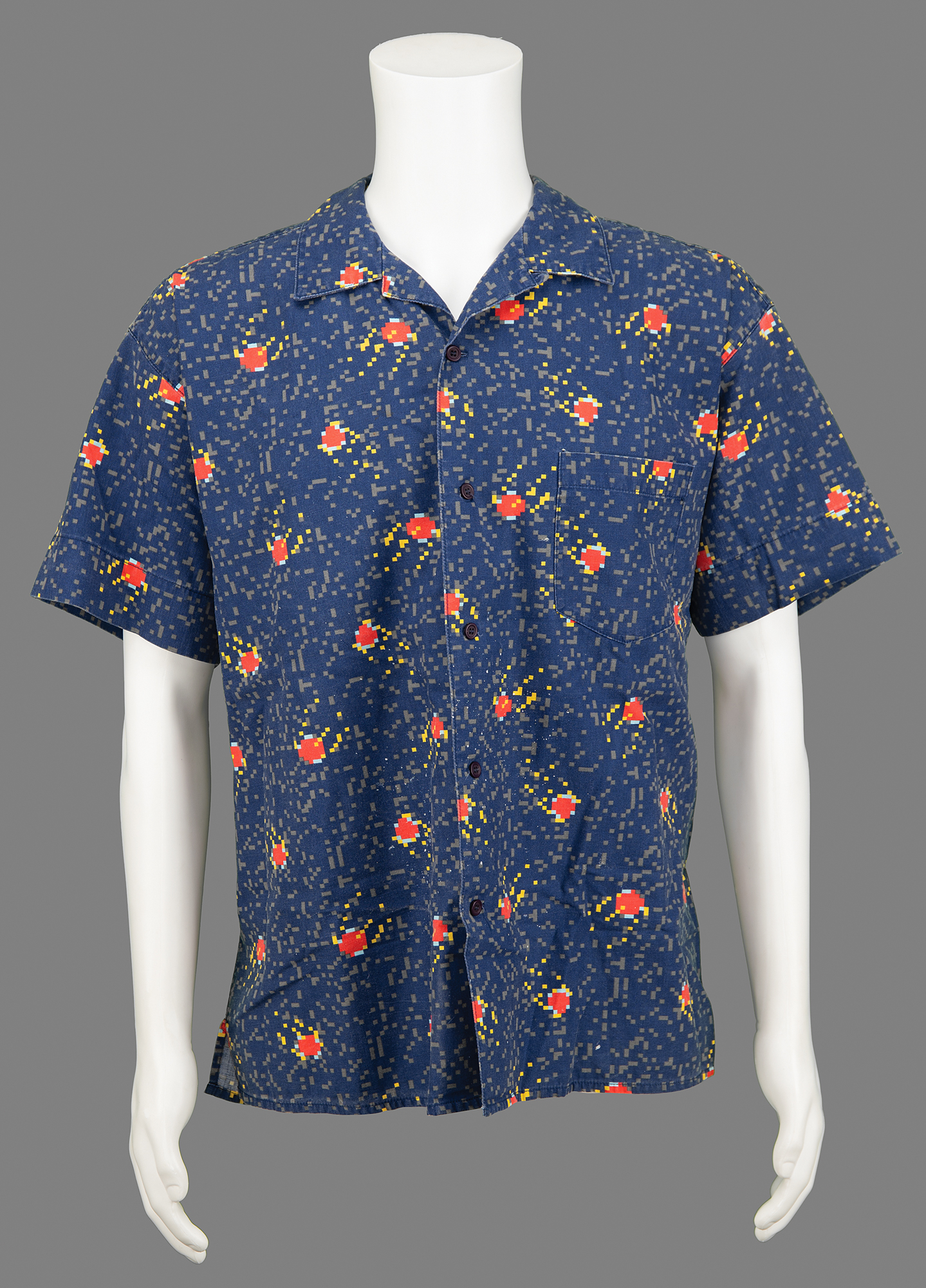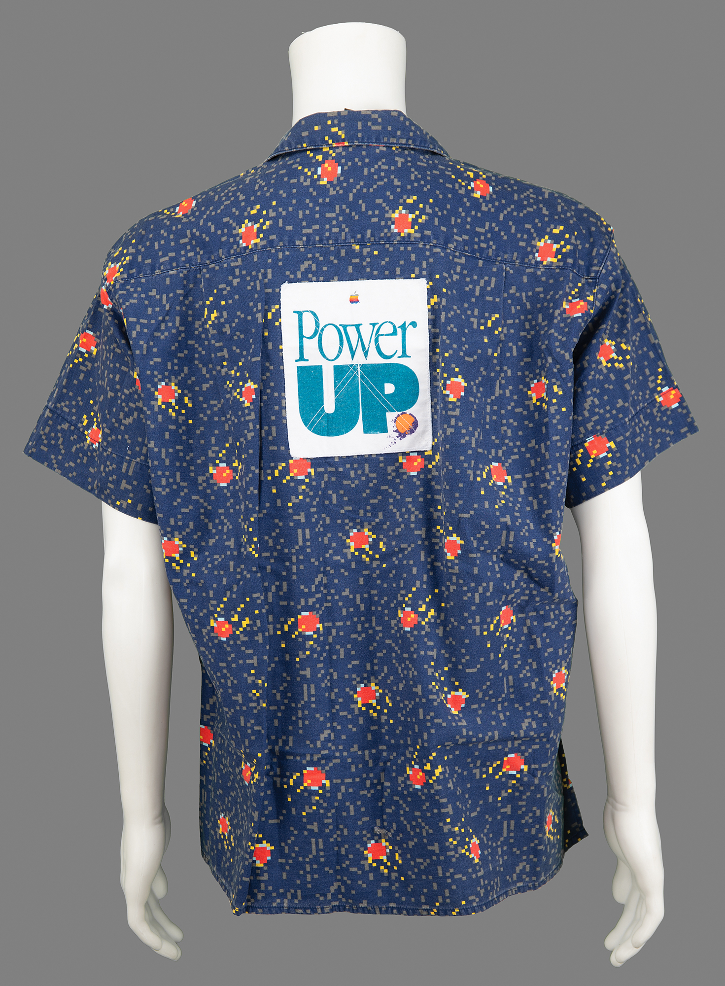 Navy blue Apple Computer Hawaiian-style shirt by Esprit, no size (likely large), issued at a 1989 Apple sales conference. The shirt features a repeating ‘fireball’ or ‘shooting star’ pattern and the back bears a large “Power UP” slogan patch. In fine condition, with apparent paint splatter to the front.
