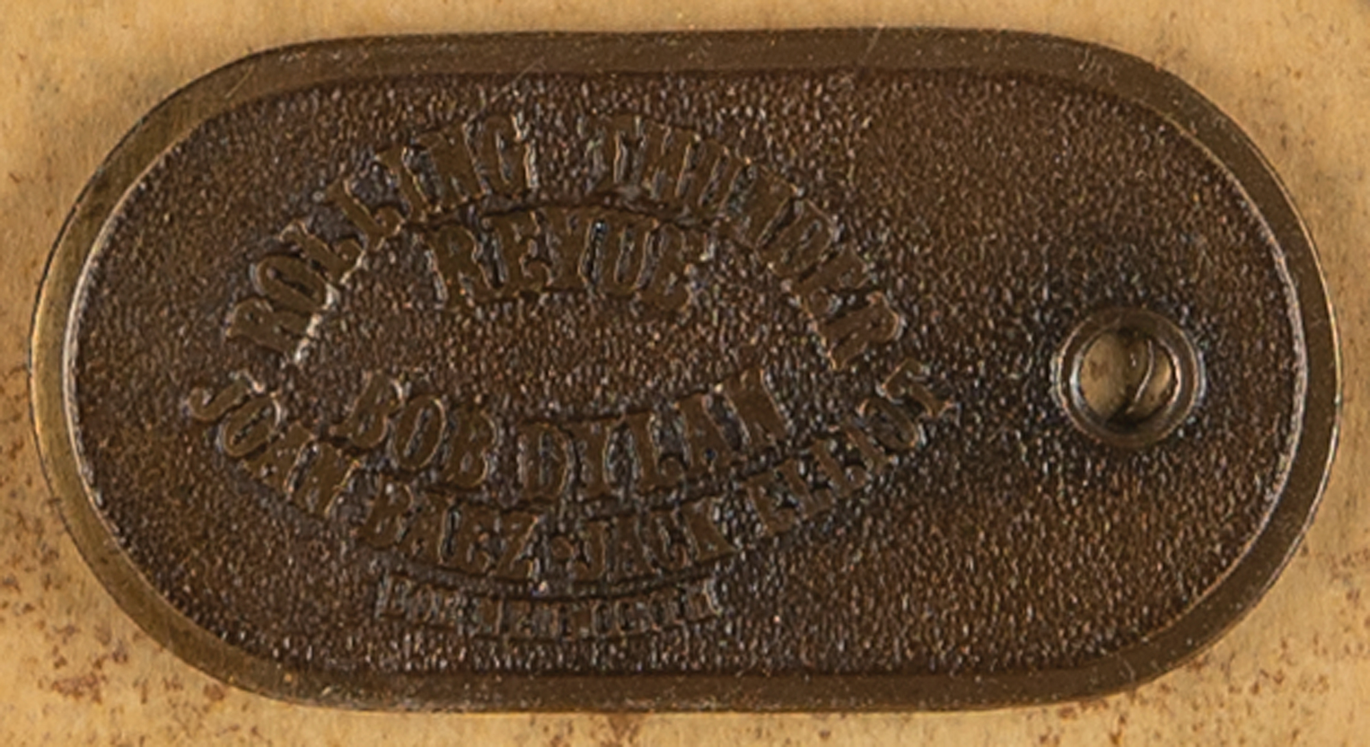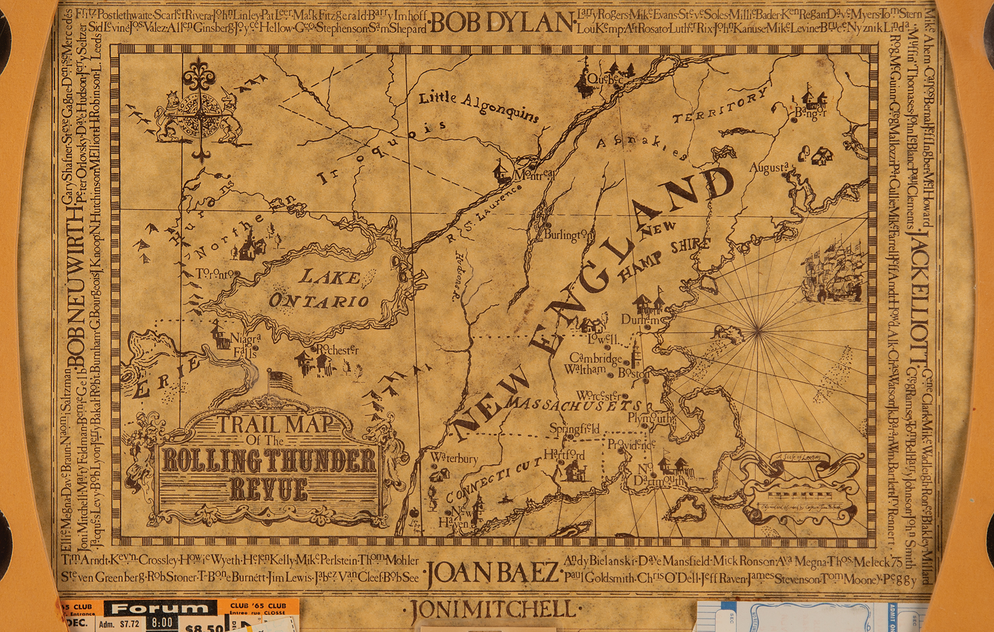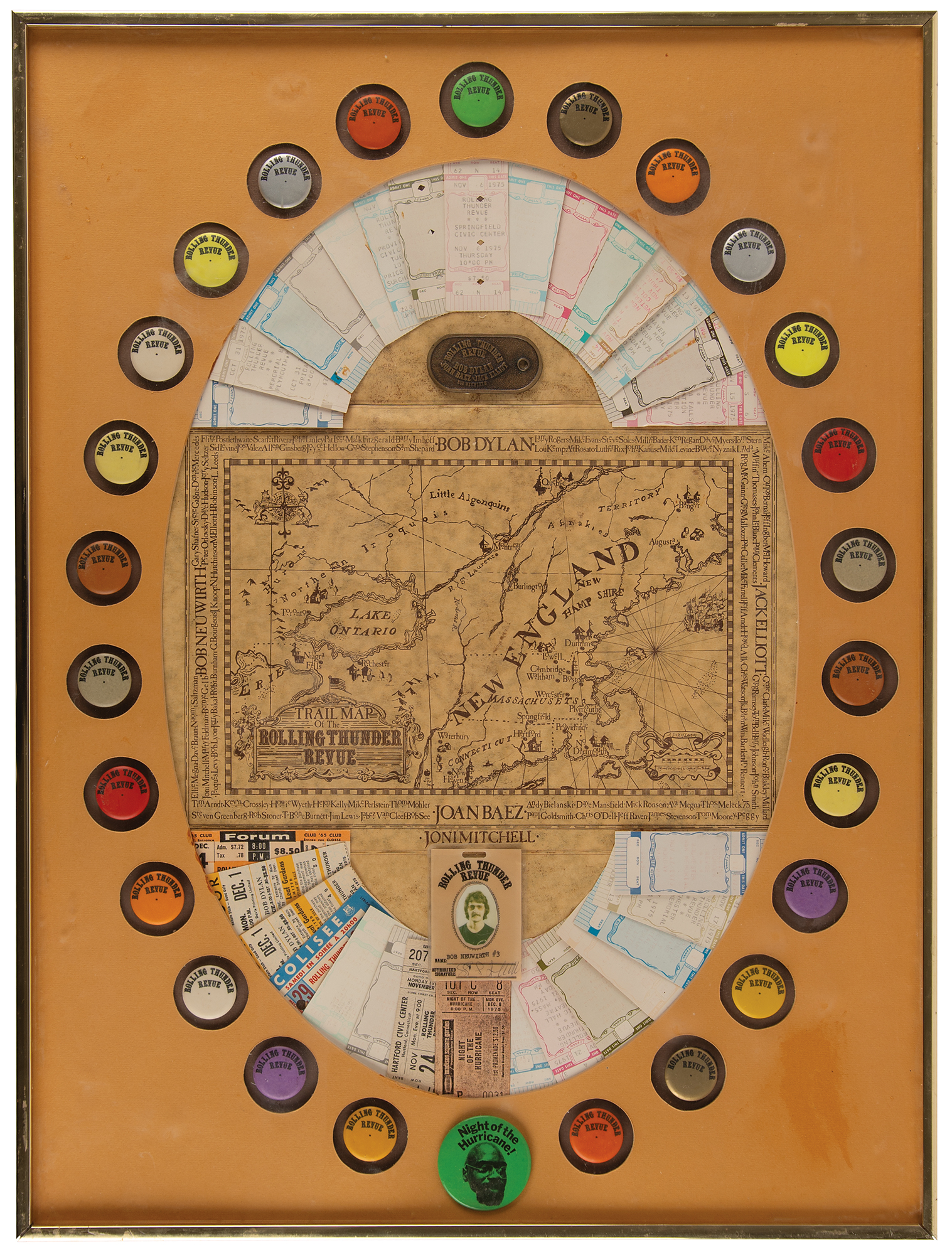 These items are thoughtfully arranged around a "Trail Map of the Rolling Thunder Revue" and a "Rolling Thunder Revue" brass luggage tag, and framed to an overall size of 21 x 28.5. Of particular note are the following: