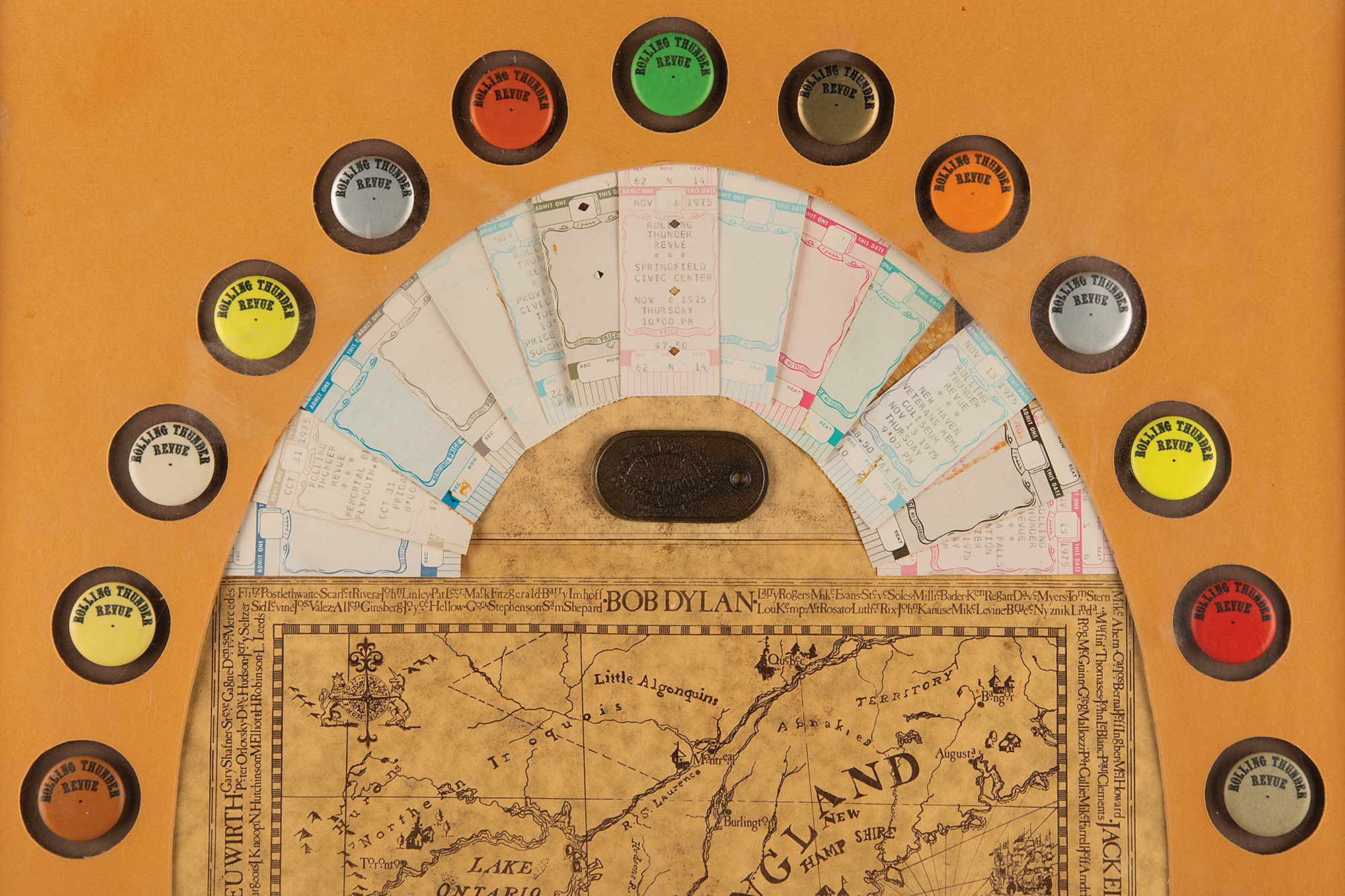 - the border of 25 rare, colorful "Rolling Thunder Revue" buttons which served as color-coded backstage guest passes for varying stops on the tour.