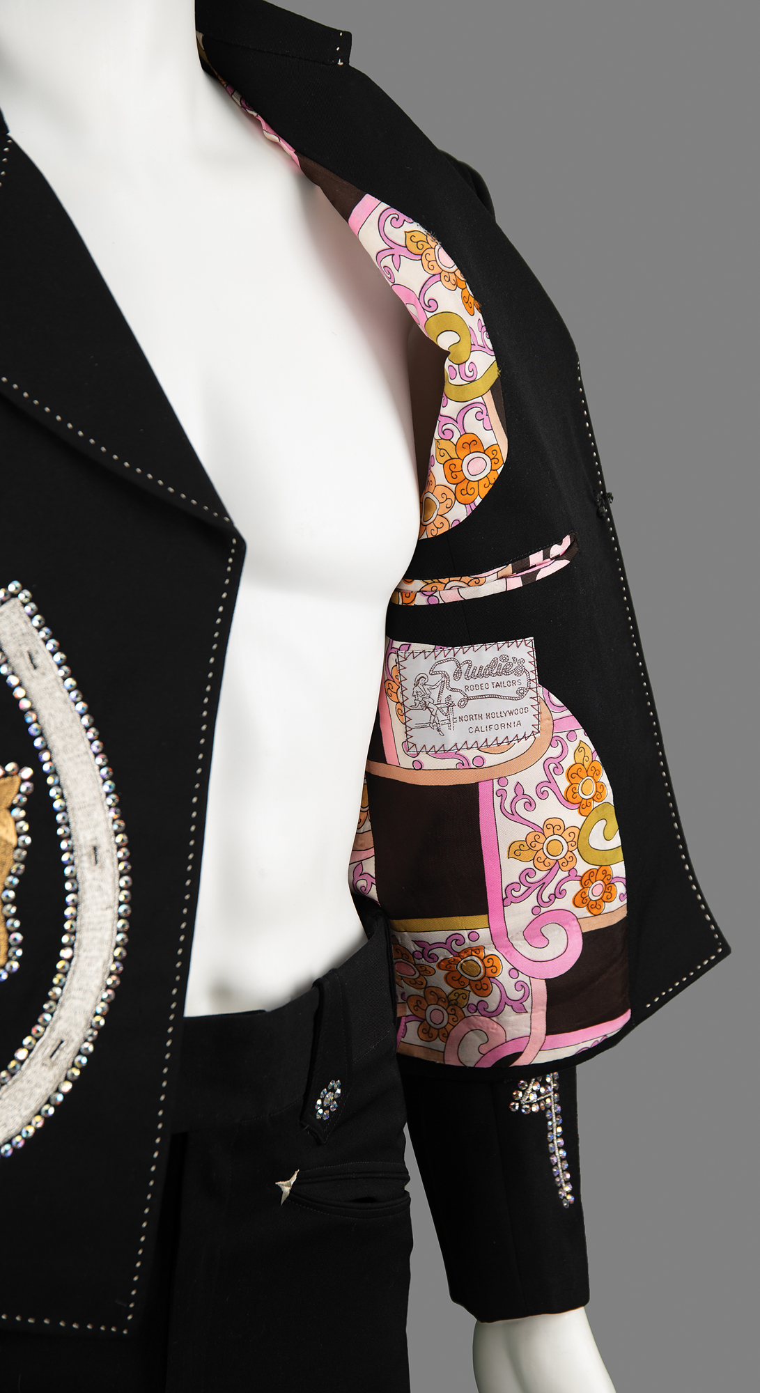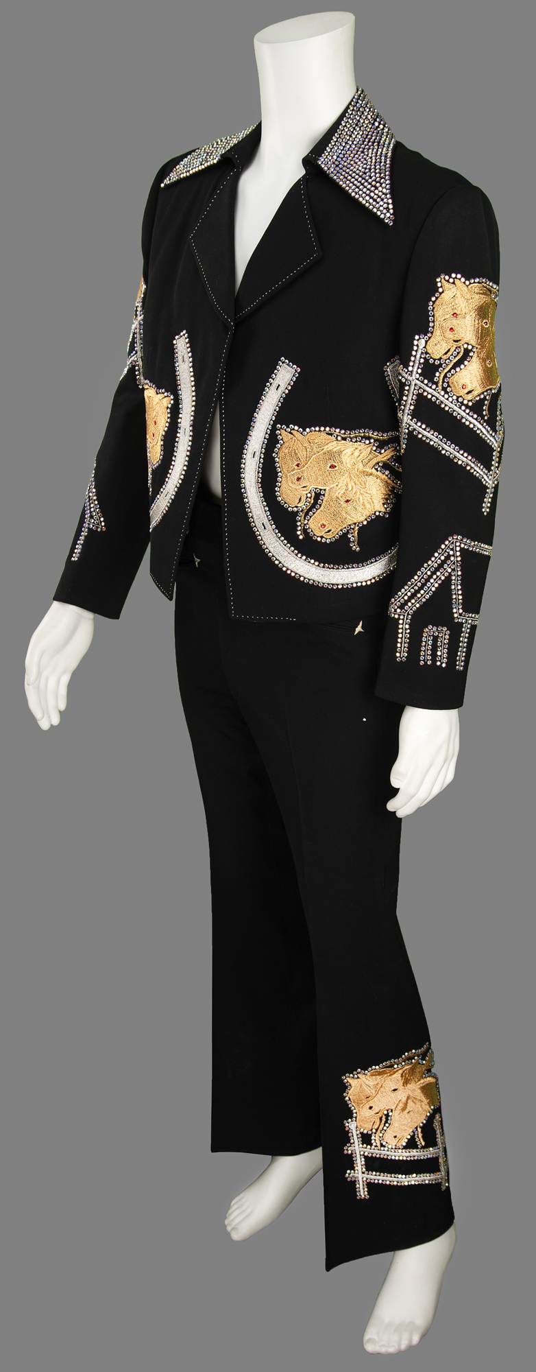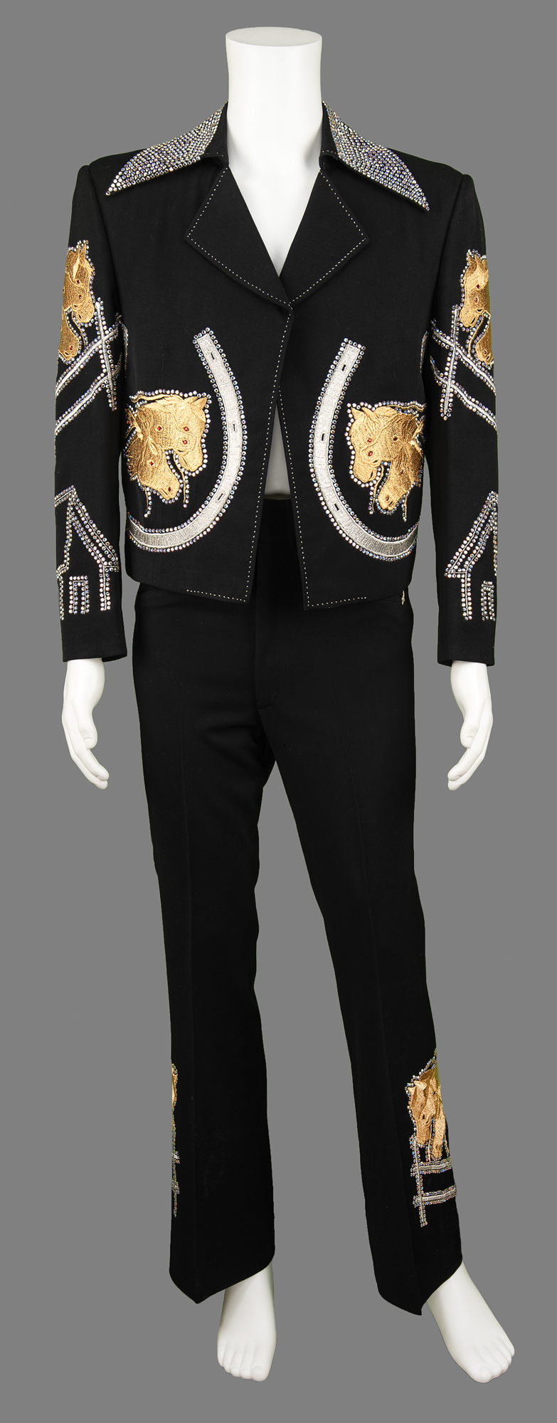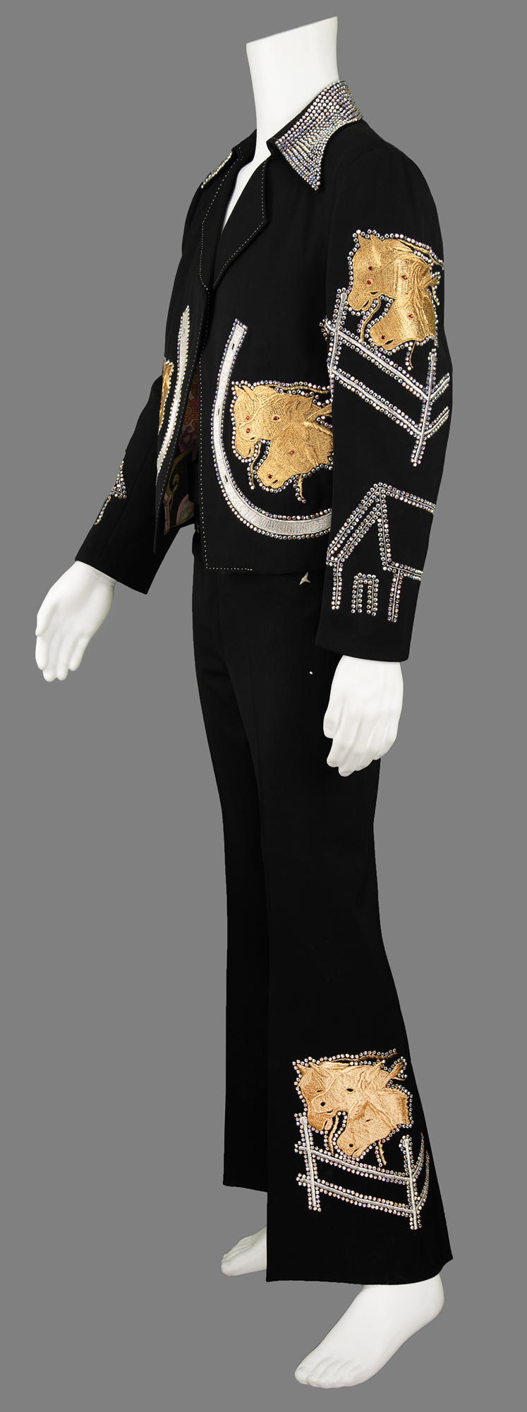 The dazzling all-black suit features a jacket with a rhinestone-studded collar, rhinestone-lined silver-embroidered horseshoes on the front, and shimmering gold-embroidered horse designs on the back, front, and sleeves, their eyes and nostrils dotted with red rhinestones. The sleeves boast further rhinestone designs, with the outline of a house on each wrist. The jacket is lined in colorful psychedelic paisley-patterned silk, with the "Nudie's Rodeo Tailors" label sewn to an inner pocket. The matching bootcut pants are similarly decorated, with decorative rhinestones on each belt loop and the same golden horse motif embroidered at the ankles. The handsome suit remains in fine to very fine condition.