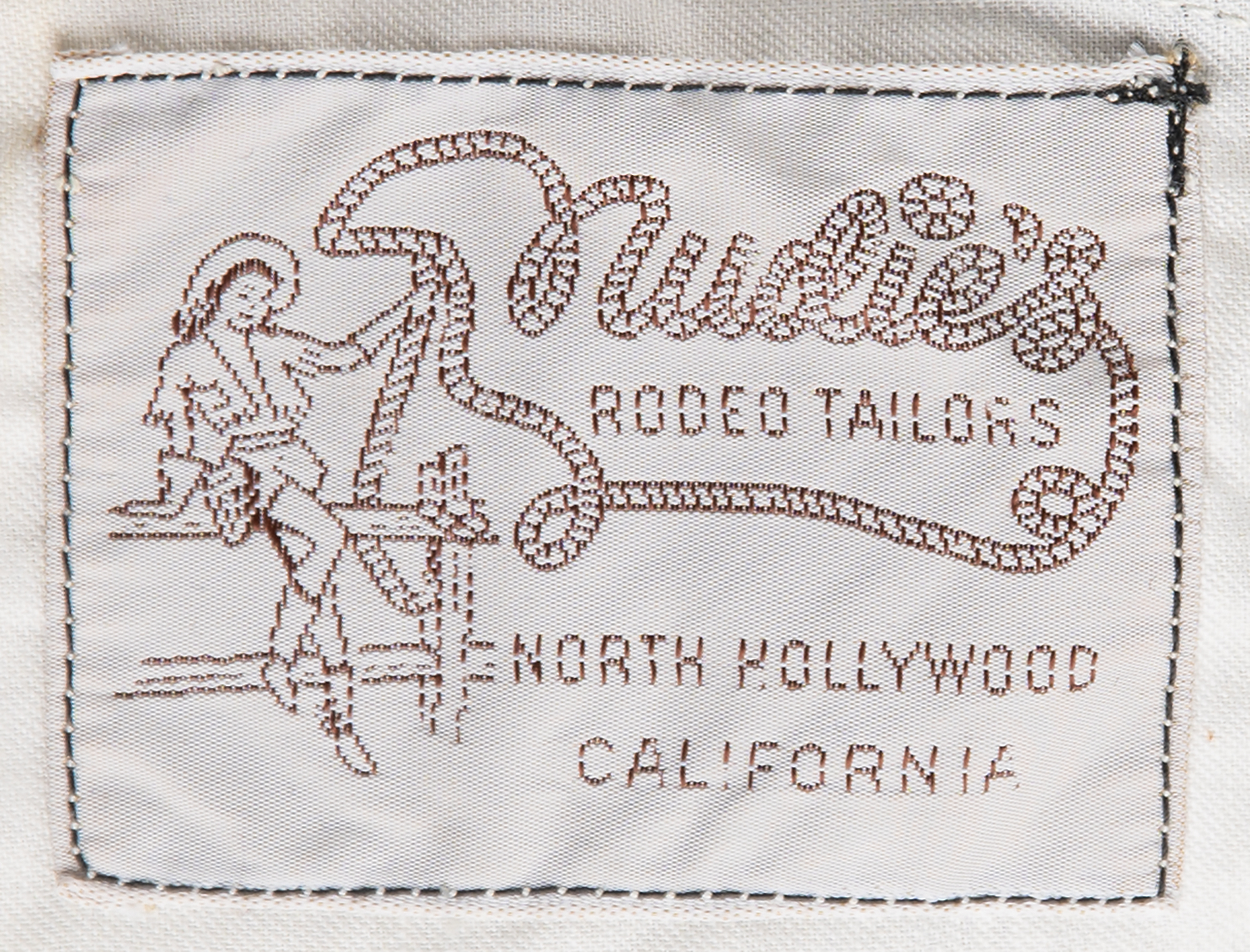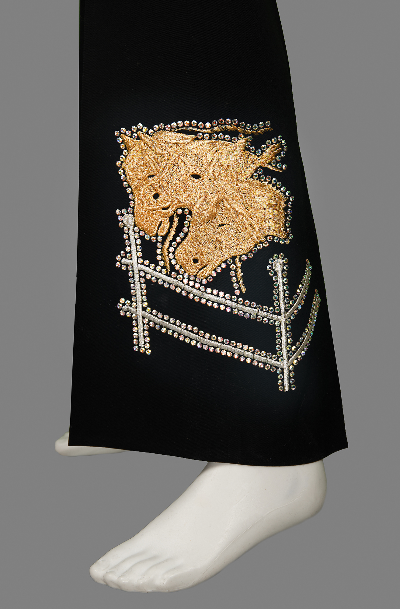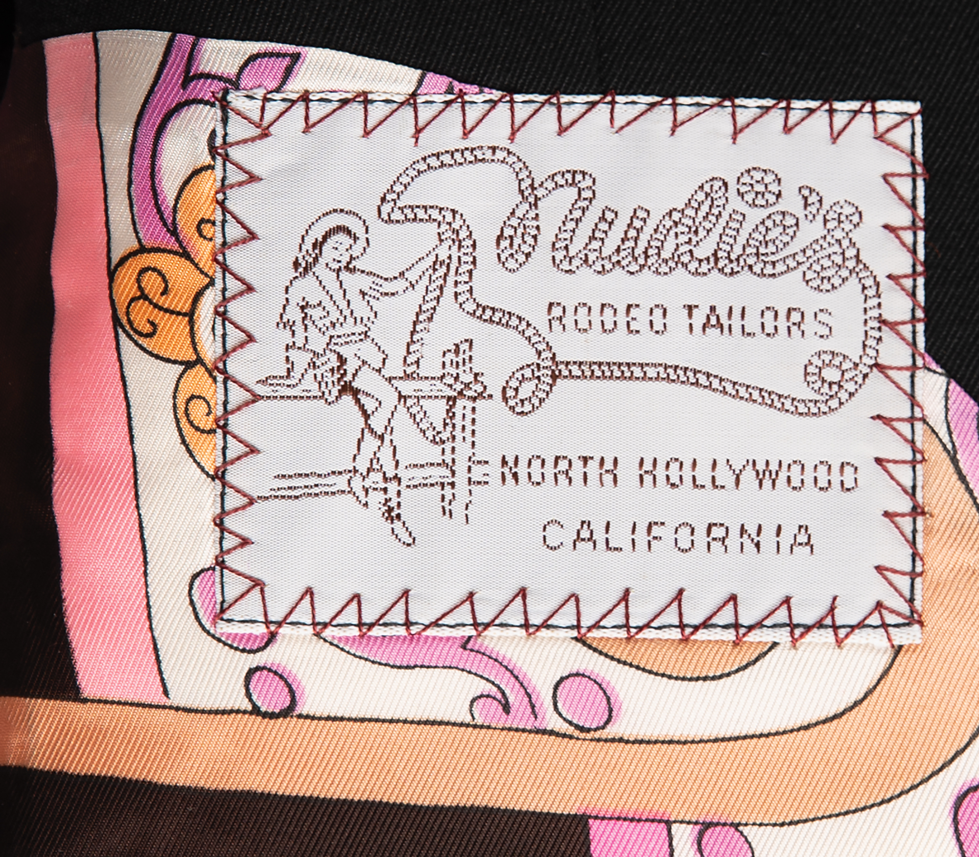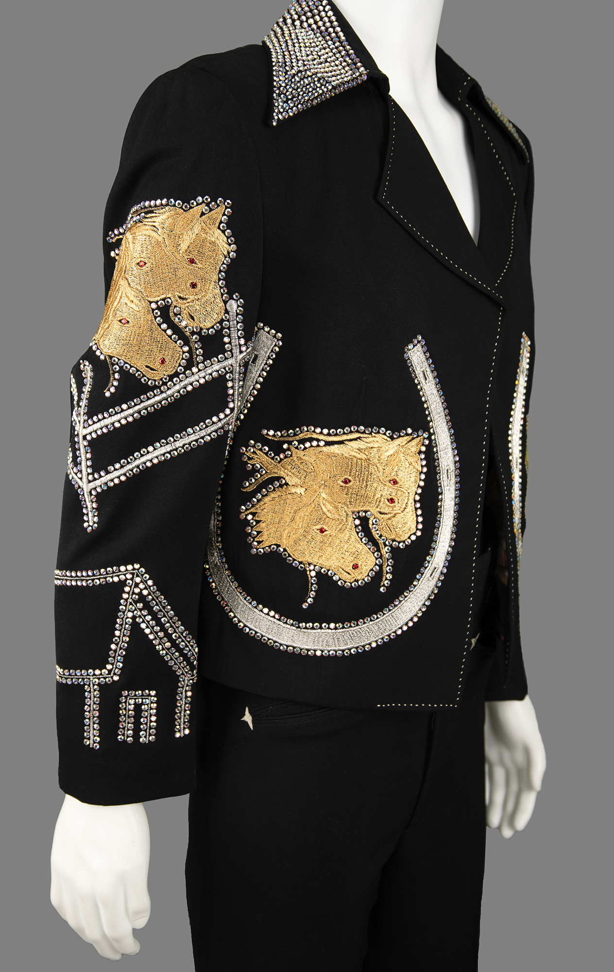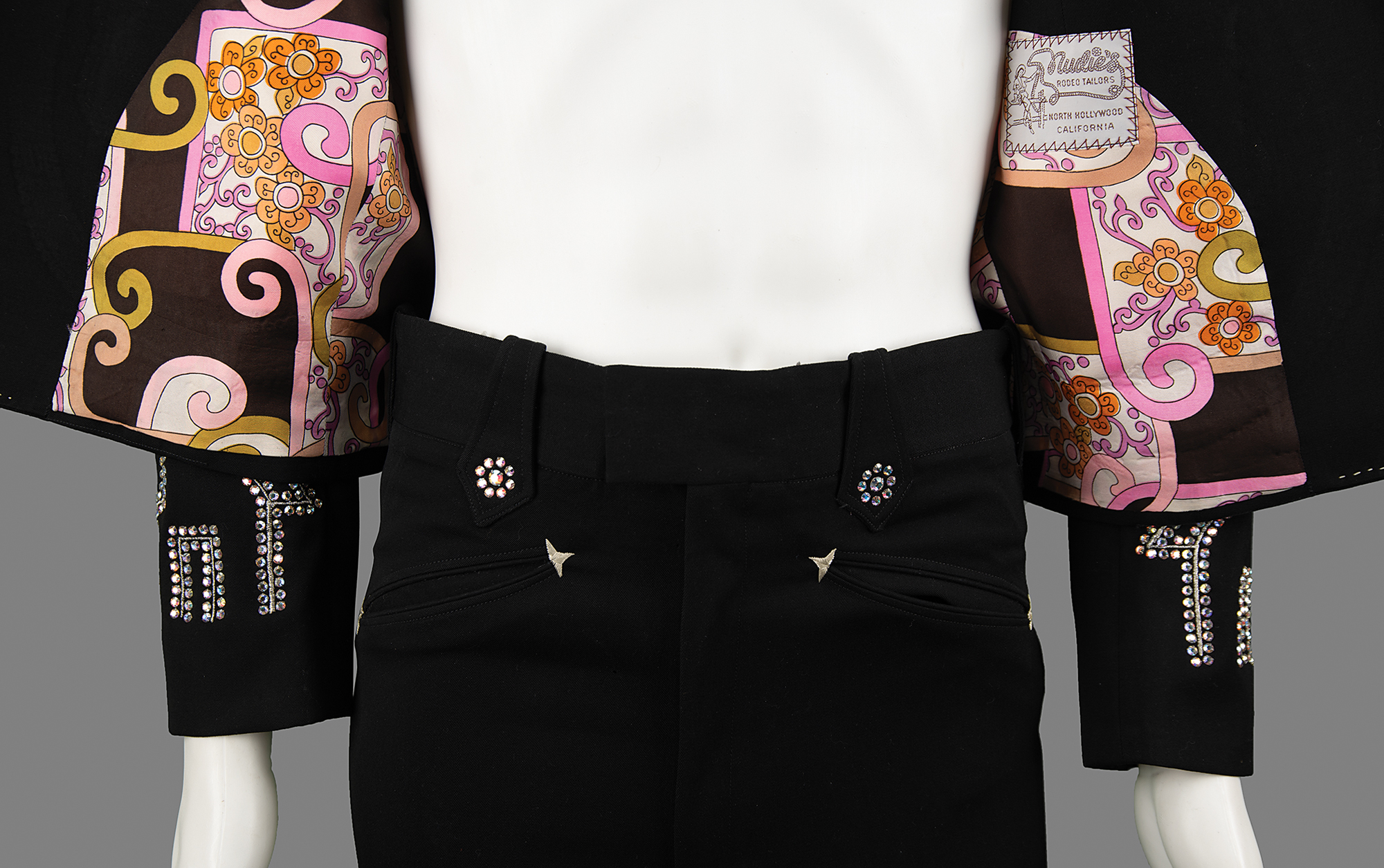 The dazzling all-black suit features a jacket with a rhinestone-studded collar, rhinestone-lined silver-embroidered horseshoes on the front, and shimmering gold-embroidered horse designs on the back, front, and sleeves, their eyes and nostrils dotted with red rhinestones. The sleeves boast further rhinestone designs, with the outline of a house on each wrist. The jacket is lined in colorful psychedelic paisley-patterned silk, with the "Nudie's Rodeo Tailors" label sewn to an inner pocket. The matching bootcut pants are similarly decorated, with decorative rhinestones on each belt loop and the same golden horse motif embroidered at the ankles. The handsome suit remains in fine to very fine condition.