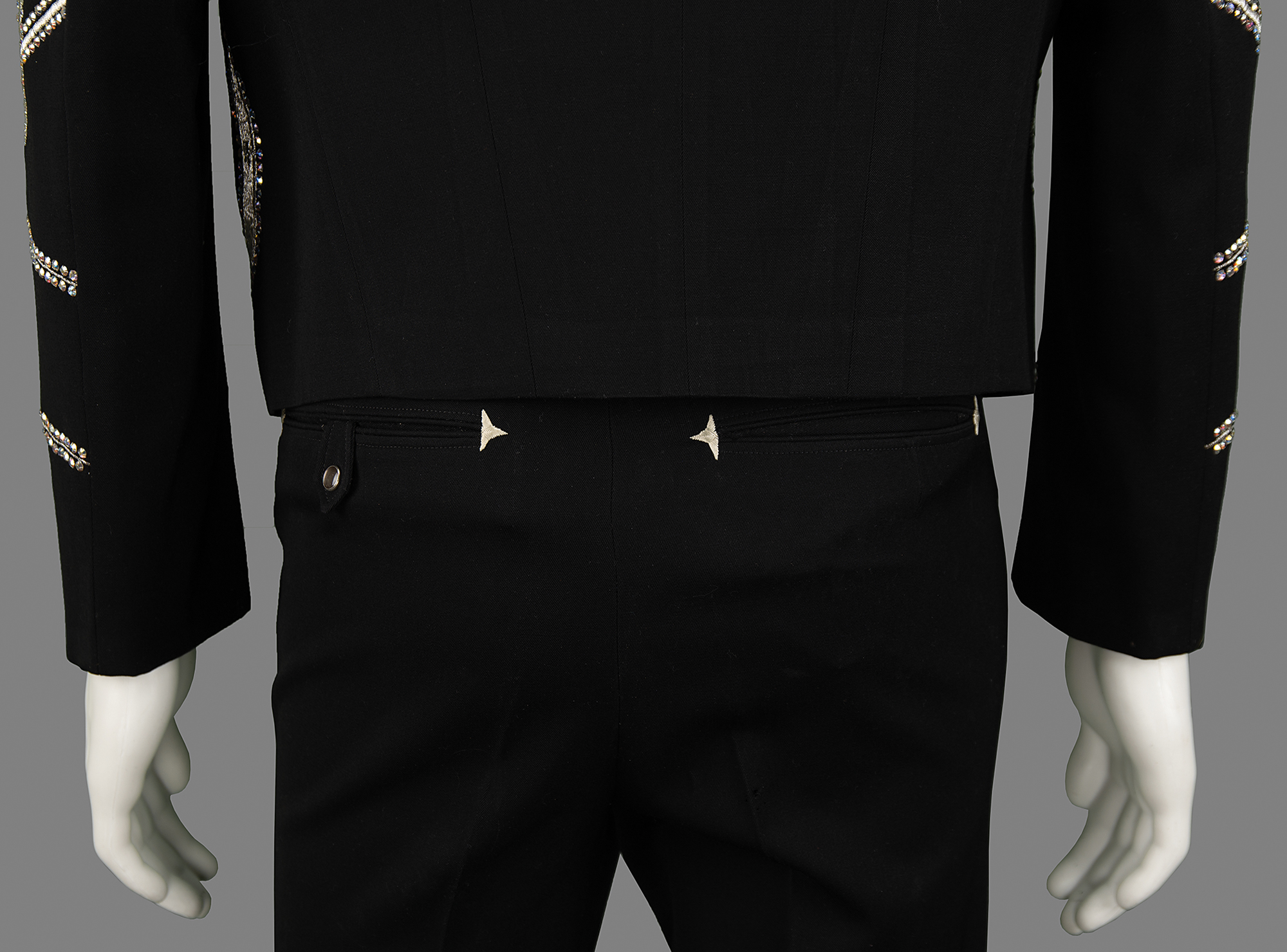 Bob Neuwirth's personally-owned custom outfit by Nudie's Rodeo Tailors of North Hollywood, California, worn on stage for the 'Night of the Hurricane II' benefit concert at the Houston Astrodome on January 25, 1976, bridging the two legs of Bob Dylan's iconic Rolling Thunder Revue concert tour. Dylan purchased these unique suits for his band prior to the show; a 1977 Rolling Stone article remarked: 'The revue got outfitted in country-glitter suits at Nudie’s; Dylan picked up that $15,000 bill.'