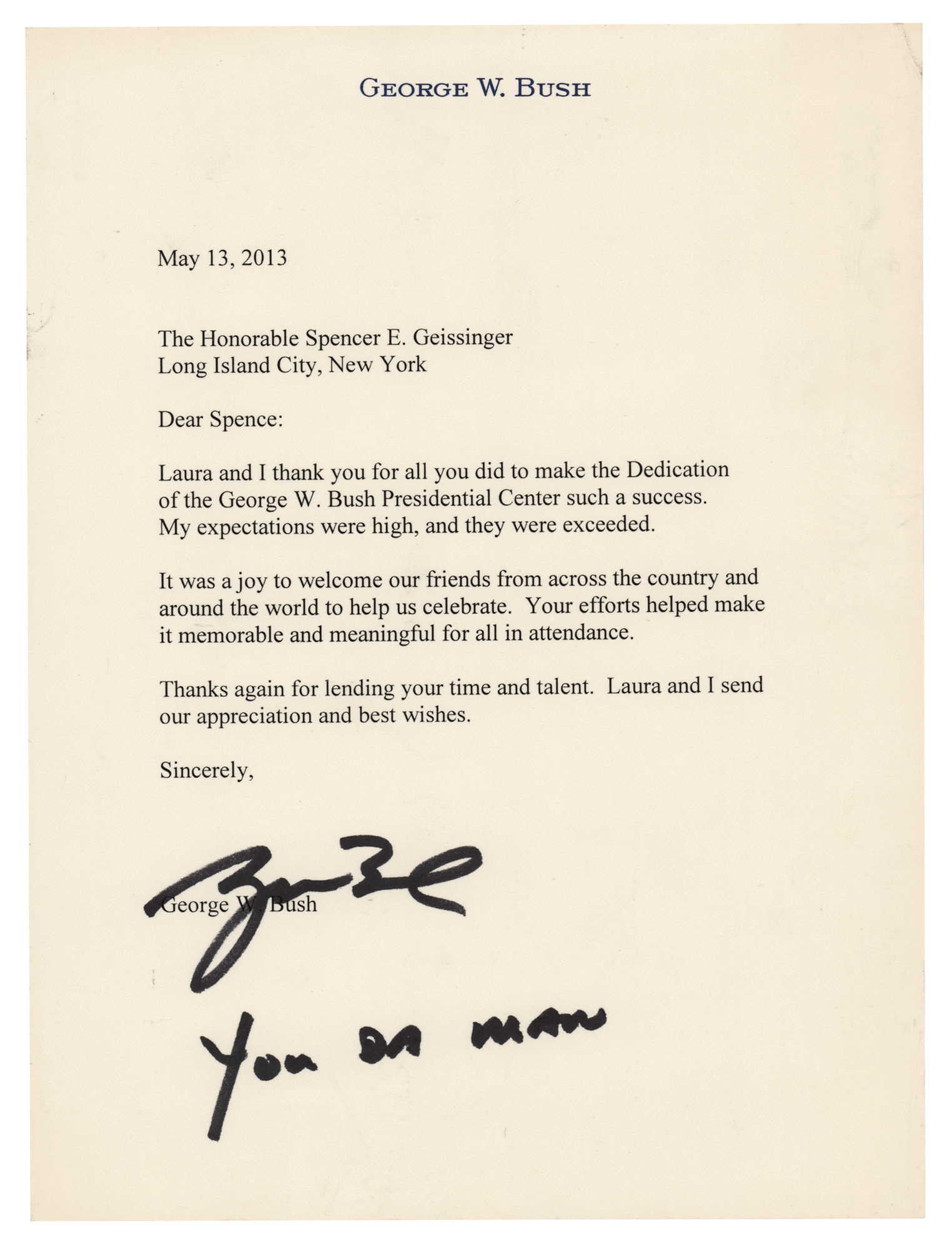 TLS, one page, 6.25 x 8.5, personal letterhead, May 13, 2013. Letter to Spencer E. Geissinger, in part: "Laura and I thank you for all you did to make the Dedication of the George W. Bush Presidential Center such a success. My expectations were high, and they were exceeded. It was a joy to welcome our friends from across the country and around the world to help us celebrate. Your efforts helped make it memorable and meaningful for all in attendance. Thanks again for lending your time and talent." After signing, Bush adds: "You da man." In fine condition.