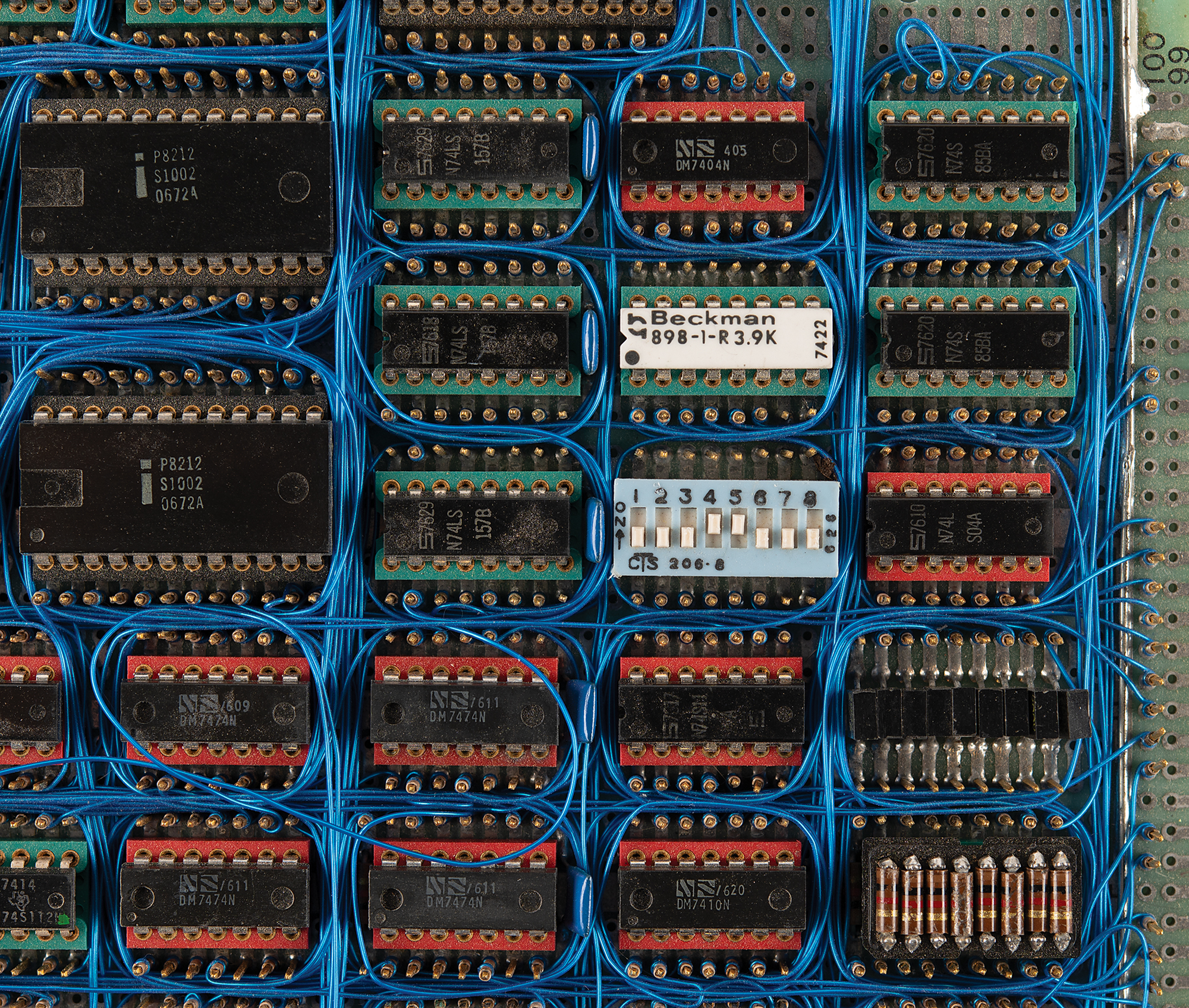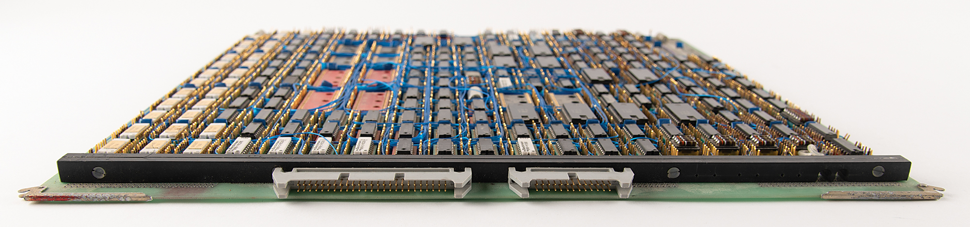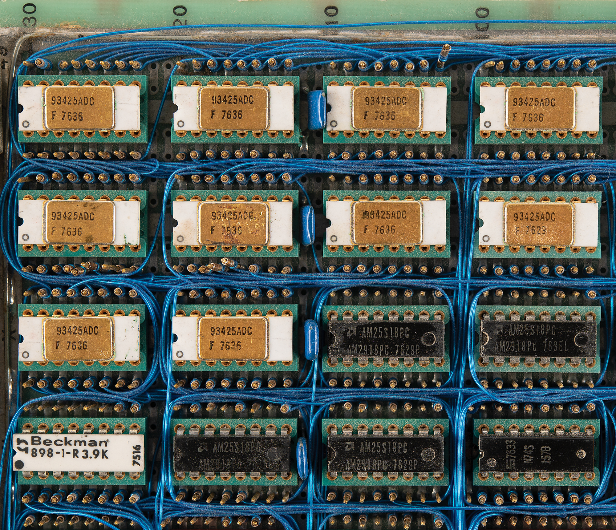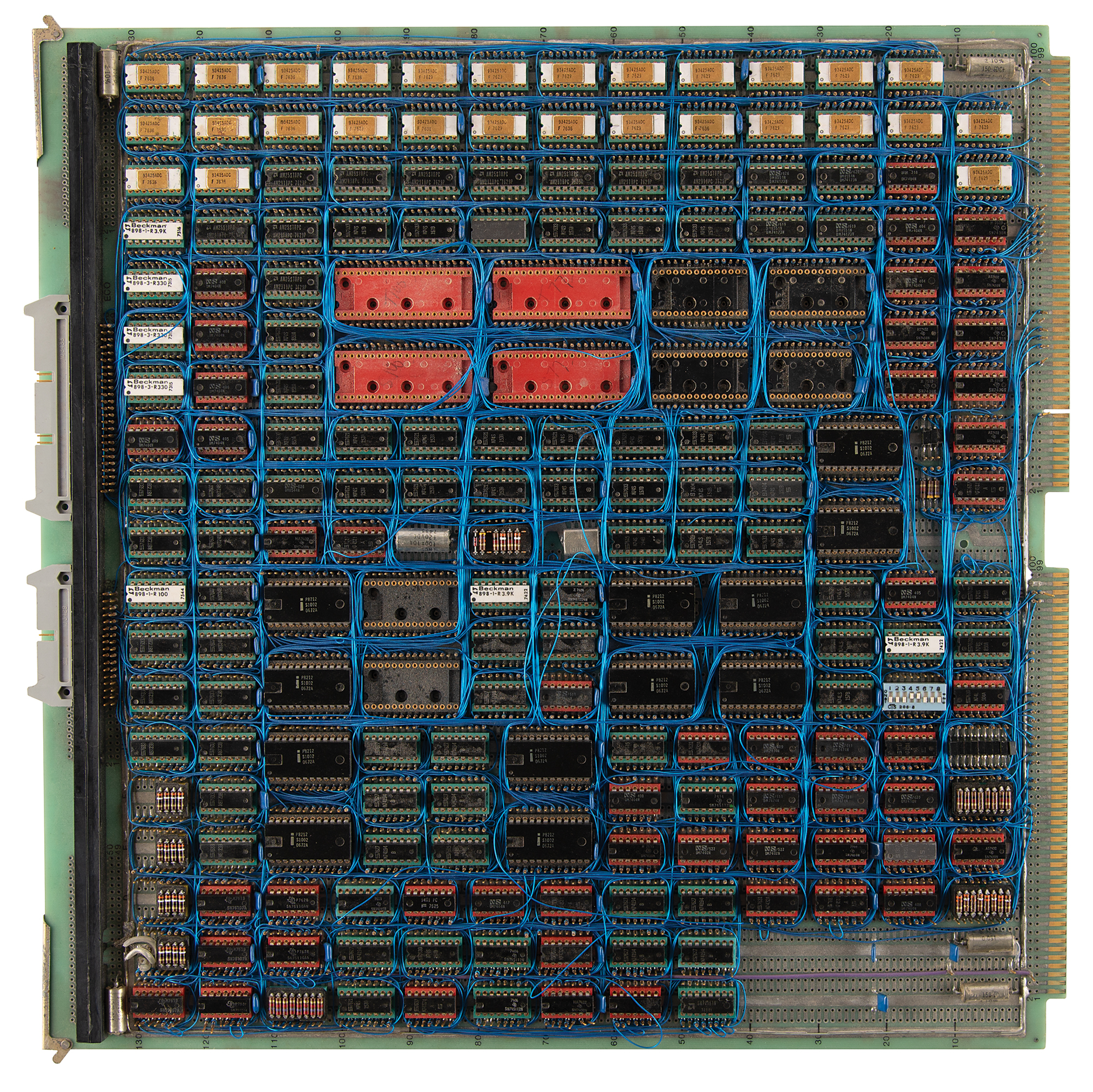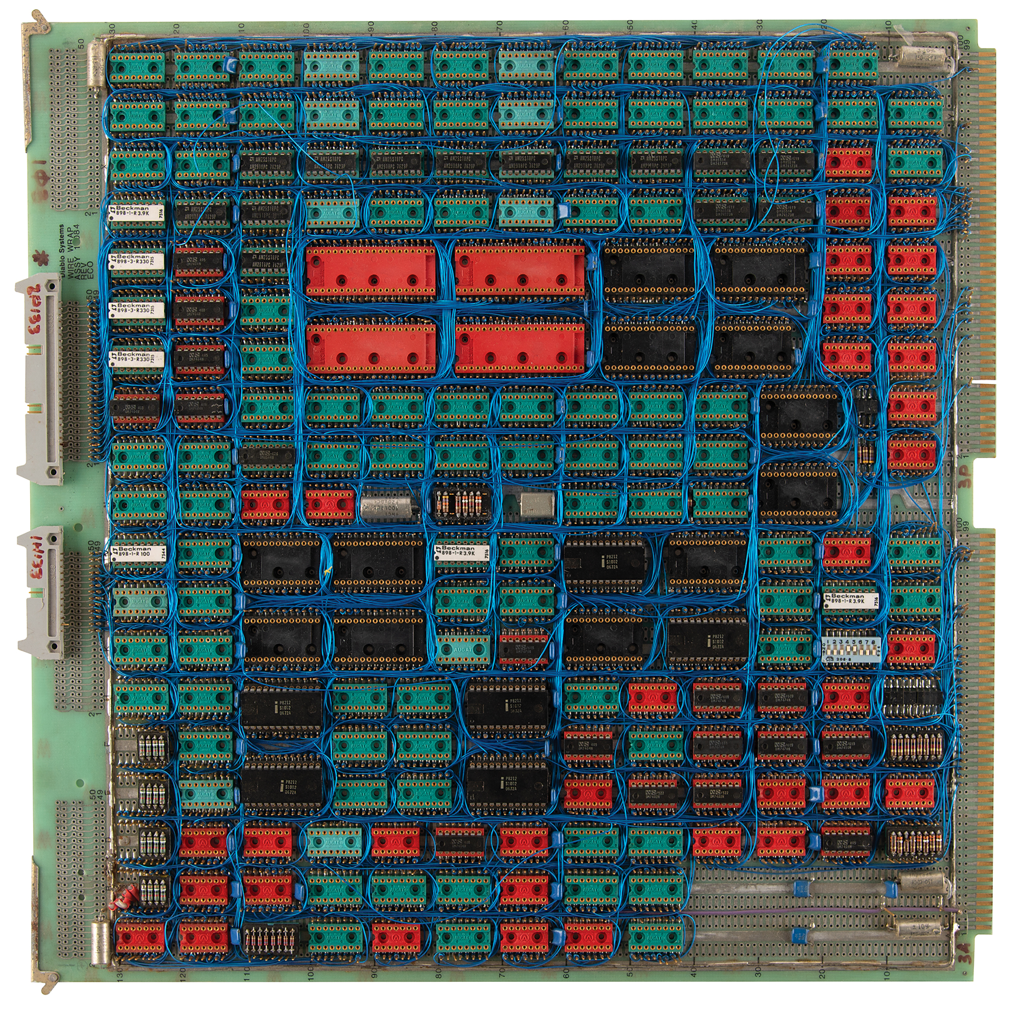 Two hand-soldered wire wrap boards by Diablo Systems, a hardware supplier for Xerox, known for its pioneering work on early printers and disk drives, such as those used in the Xerox Alto, a precursor to modern personal computers. Both circuit boards measure 15˝ x 15˝ and are marked “Diablo Systems, Wire Wrap Assy” along their respective upper borders. These boards, which contain 93425 static RAM, are based on the AMD2901 and AMD2909 series chips, which were used on legendary historical computers like the Apollo Guidance Computer, DEC PDP systems, and Xerox STAR. In overall fine condition. A rare artifact that showcases the pioneering hands-on engineering techniques of the 1970s and 1980s.