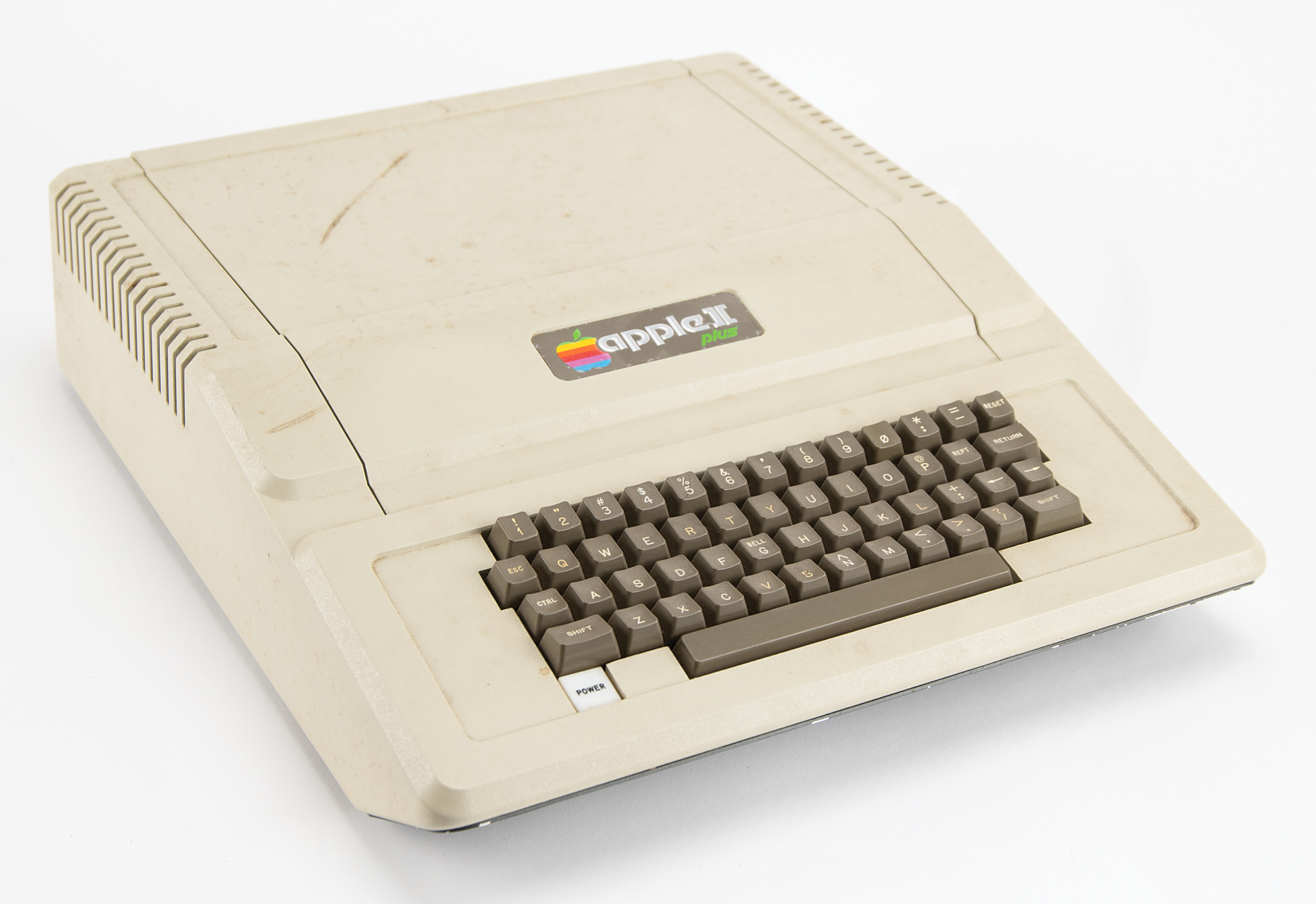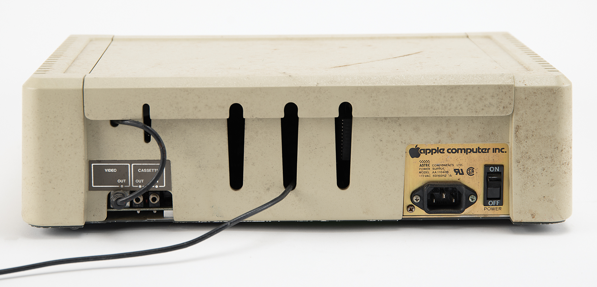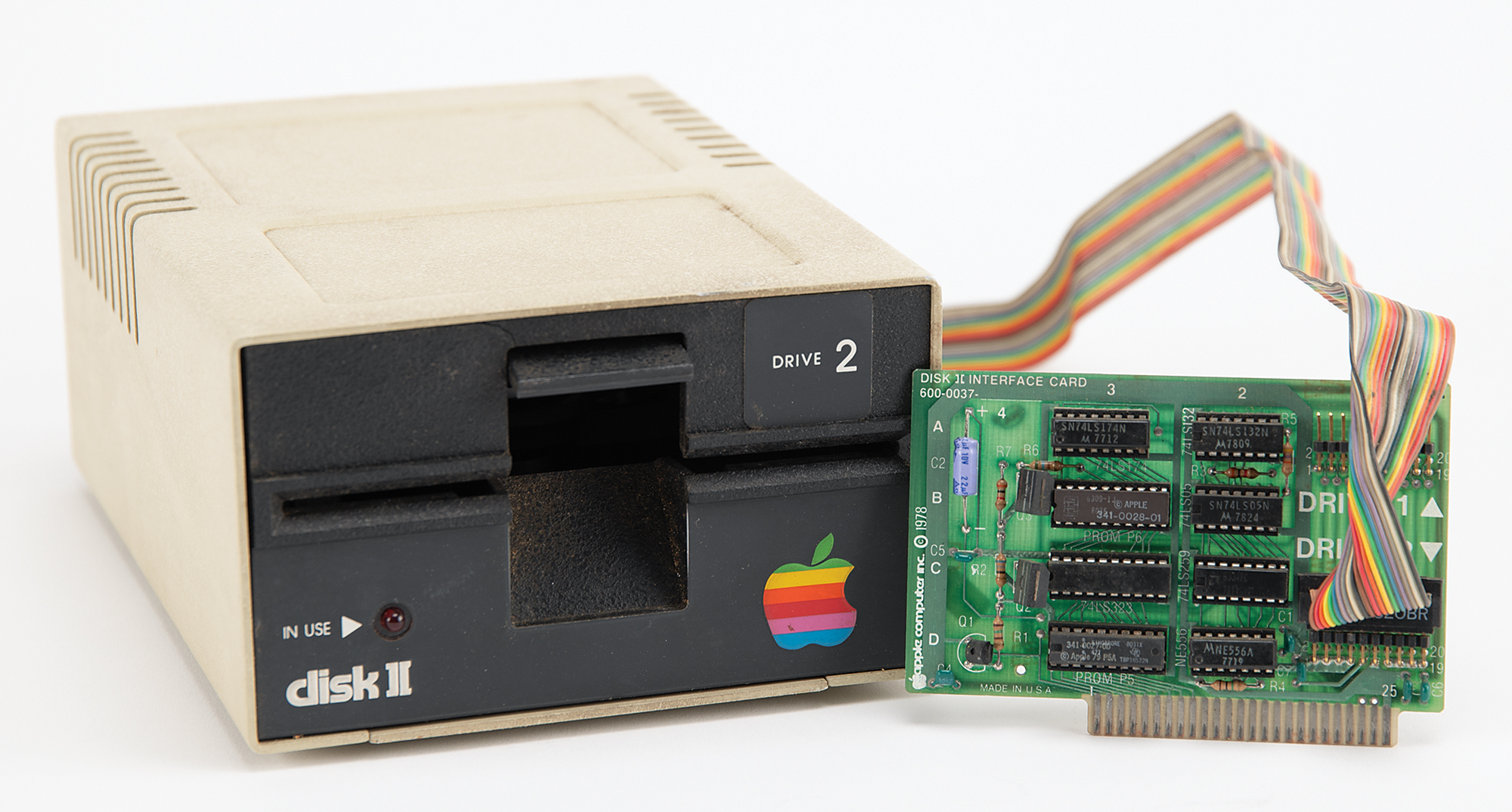 Fascinating original testing set-up used by Apple Computer’s Macintosh development team for work on the original Macintosh motherboard, consisting of an Apple II Plus computer, Model No. A2S1048, Serial No. A2S2-473506, containing an Apple II Main Logic BD RFI board, a Language card, a Smarterm Video Display Interface card, and a Disk II Interface card; a Cyborg ISAAC data acquisition unit, Model No. Sys. 91, Serial No. 1257, Part No. 850-260, Revision F, with the back bearing a 1982 ISAAC 91A Distribution Board; a Cyborg ISAAC power supply, Serial No. A 32364, Part No. 850-213, Revision I; and two Apple Disk II floppy disk drives, with Drive 1 bearing an affixed plate numbered “21287,” with Model No. A2M0003, Serial No. 4200023,” and stamped “0209,” and Drive 2 bearing Serial No. A2M0003-68549, and attached with its dual Disk II Interface card. The setup’s monitor is not included. In overall fine condition, with the Apple II Plus, Disk II disk drives, and ISAAC in working order; however, the system in its entirety has not been fully tested.