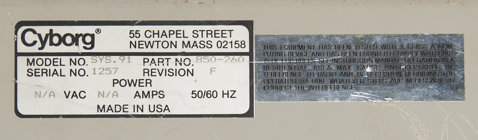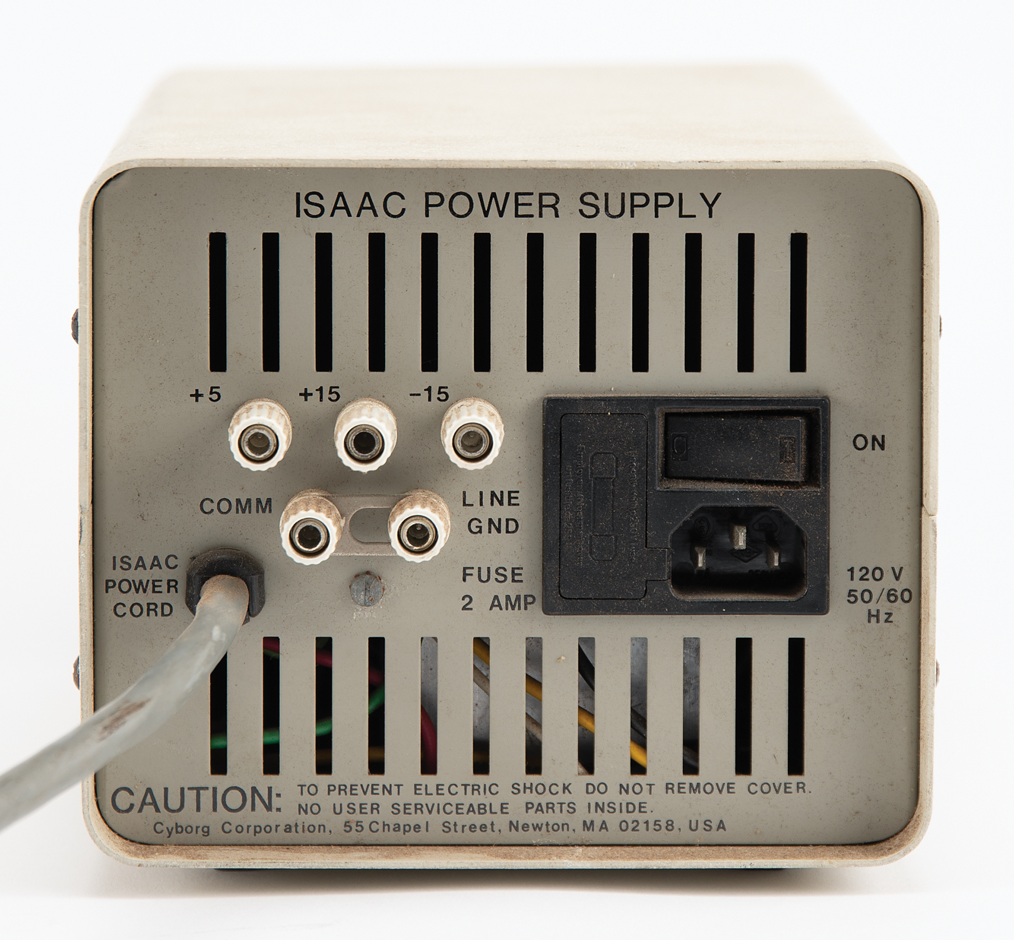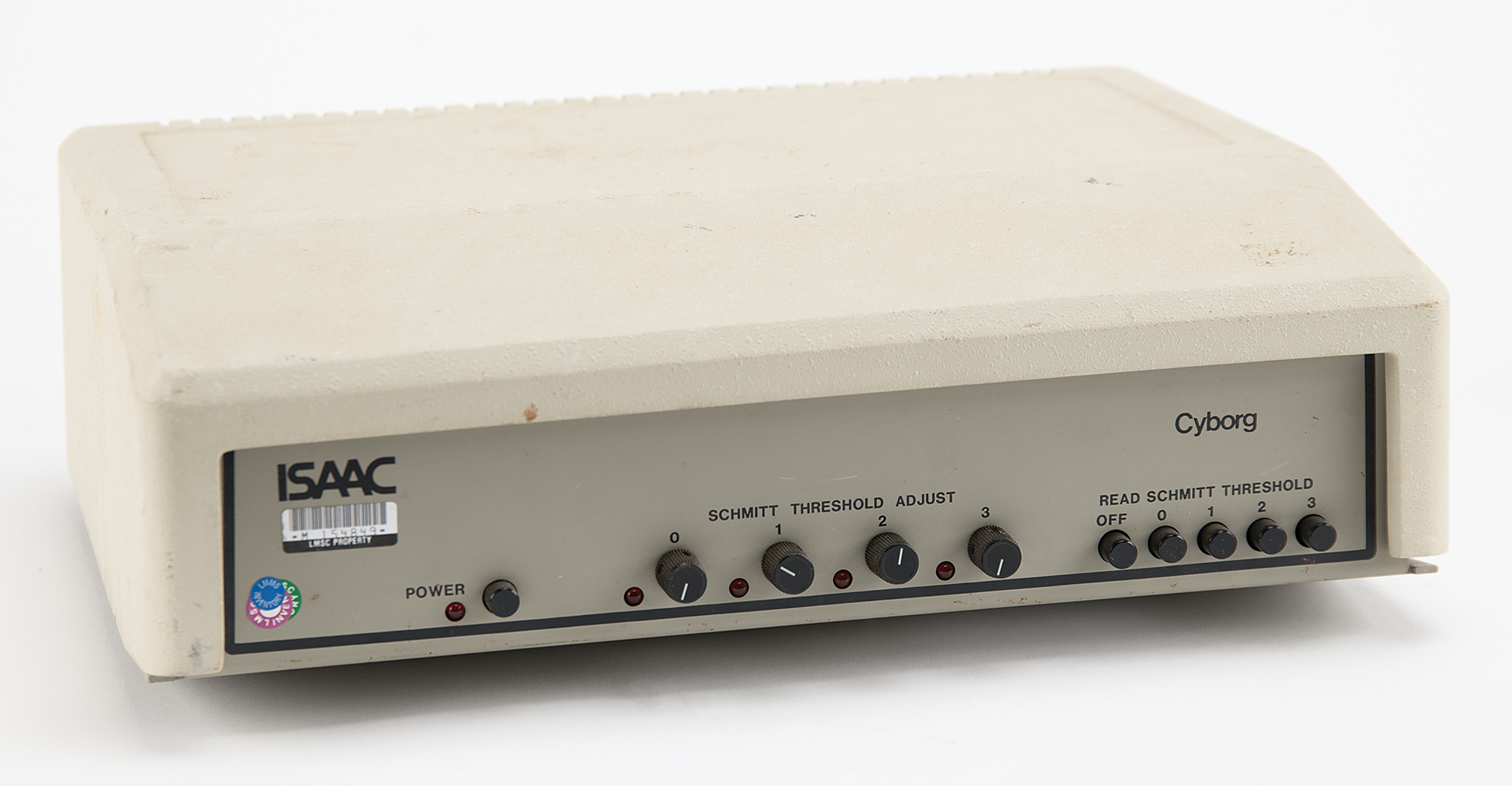 Fascinating original testing set-up used by Apple Computer’s Macintosh development team for work on the original Macintosh motherboard, consisting of an Apple II Plus computer, Model No. A2S1048, Serial No. A2S2-473506, containing an Apple II Main Logic BD RFI board, a Language card, a Smarterm Video Display Interface card, and a Disk II Interface card; a Cyborg ISAAC data acquisition unit, Model No. Sys. 91, Serial No. 1257, Part No. 850-260, Revision F, with the back bearing a 1982 ISAAC 91A Distribution Board; a Cyborg ISAAC power supply, Serial No. A 32364, Part No. 850-213, Revision I; and two Apple Disk II floppy disk drives, with Drive 1 bearing an affixed plate numbered “21287,” with Model No. A2M0003, Serial No. 4200023,” and stamped “0209,” and Drive 2 bearing Serial No. A2M0003-68549, and attached with its dual Disk II Interface card. The setup’s monitor is not included. In overall fine condition, with the Apple II Plus, Disk II disk drives, and ISAAC in working order; however, the system in its entirety has not been fully tested.