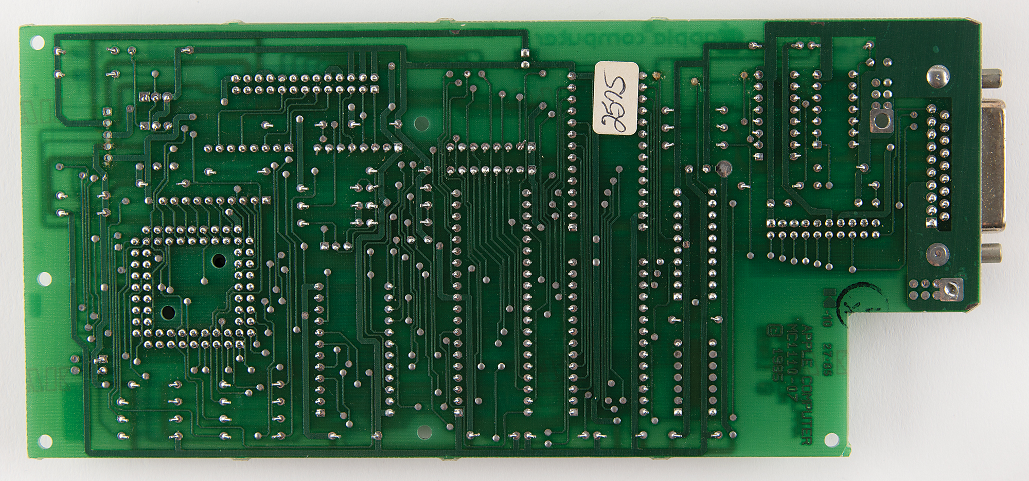 Early unidentified Apple Computer circuit board from 1985 marked with the code “MC1110-07,” 8.5˝ x 3.75˝, with labels to either side numbered “2575.” In fine condition. Although unconfirmed, this board appears to be a prototype for a controller board for the Macintosh Hard Disk 20, the first hard drive developed by Apple Computer specifically for use with the Macintosh 512K. Introduced on September 17, 1985, it was part of Apple's solution toward completing the Macintosh Office announced in January of that year.