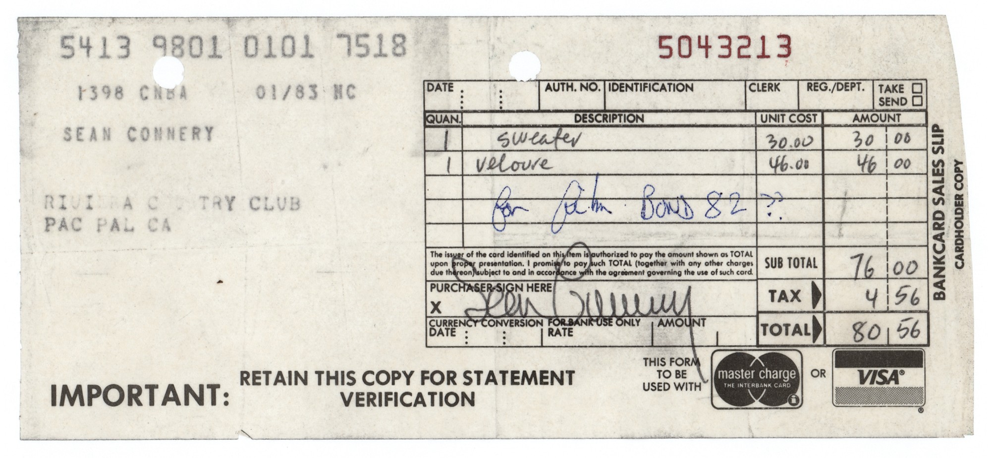 DS, one page, 7.25 x 3.25, no year. Credit card receipt for a purchase made by Sean Connery, who bought a “sweater” and “veloure” for a total of $80.56. An unknown hand has added “For film Bond 82??” Signed below in black ballpoint by Connery. In fine condition.