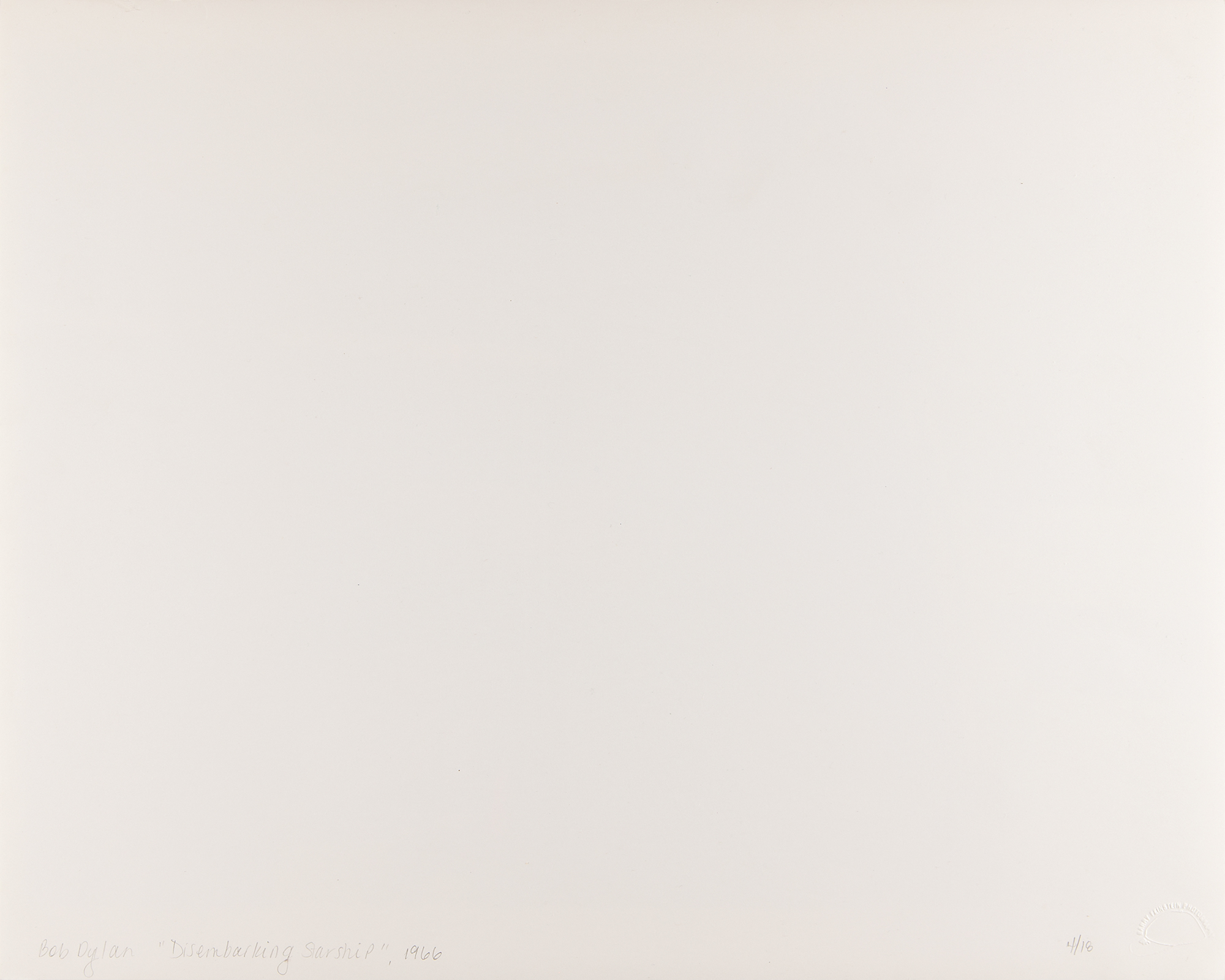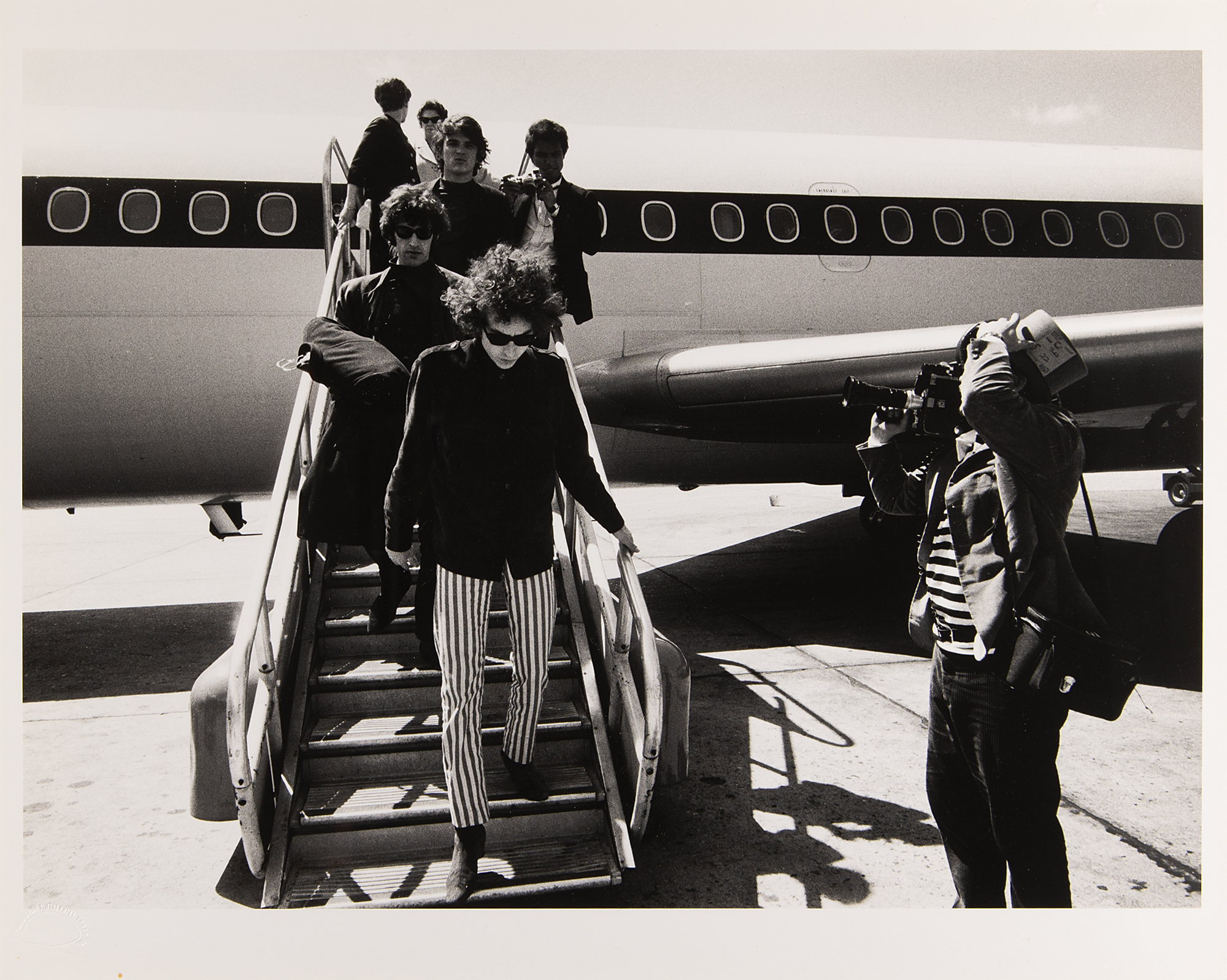 From the personal collection of legendary rock photographer Barry Feinstein—a fabulous original semi-glossy 20 x 16 silver gelatin photograph of Bob Dylan deplaning during his 1966 tour, followed by members of his backing band the Hawks (later The Band), including Richard Manuel and Rick Danko. Blindstamped in the lower left with the "Barry Feinstein Photography" stamp, and titled and numbered on the reverse in pencil, "Bob Dylan, 'Disembarking Starship,' 1966, 4/18." In fine condition.