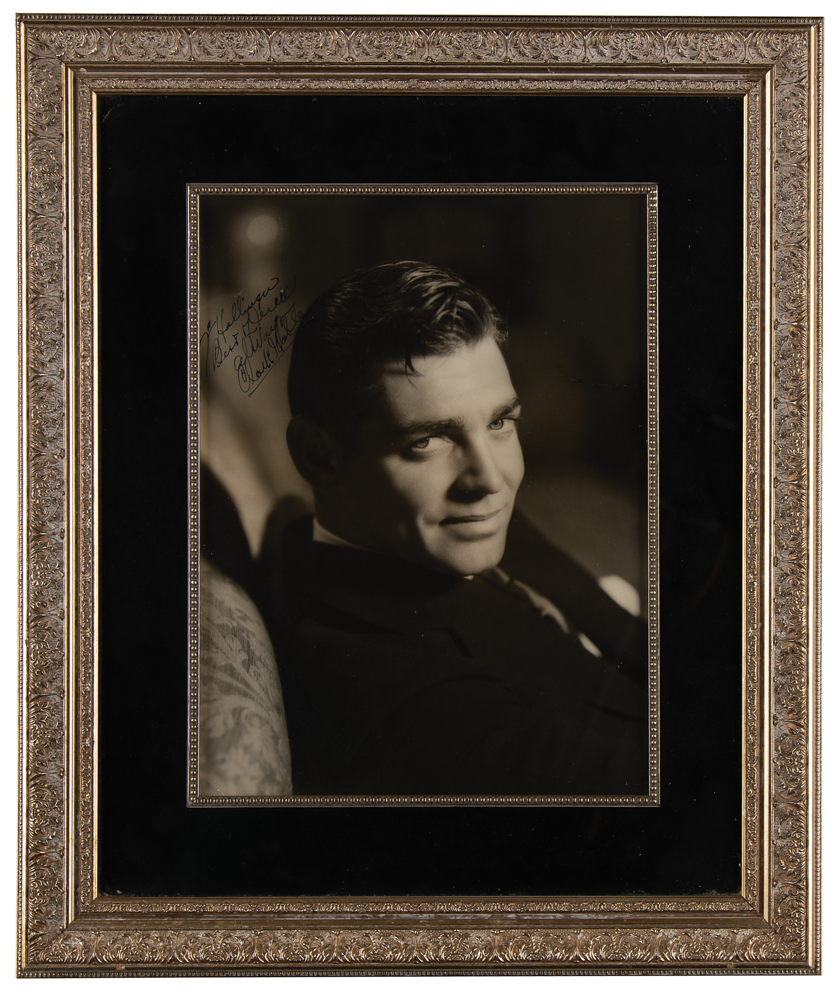 Fabulous vintage glossy 9 x 12 photo of the youthful Clark Gable in a suit and tie, signed and inscribed in fountain pen, "Hallinger, Best of luck always, Clark Gable.” Matted and framed to an overall size of 16.25 x 19.25. In fine condition, with a crease to the right background area.