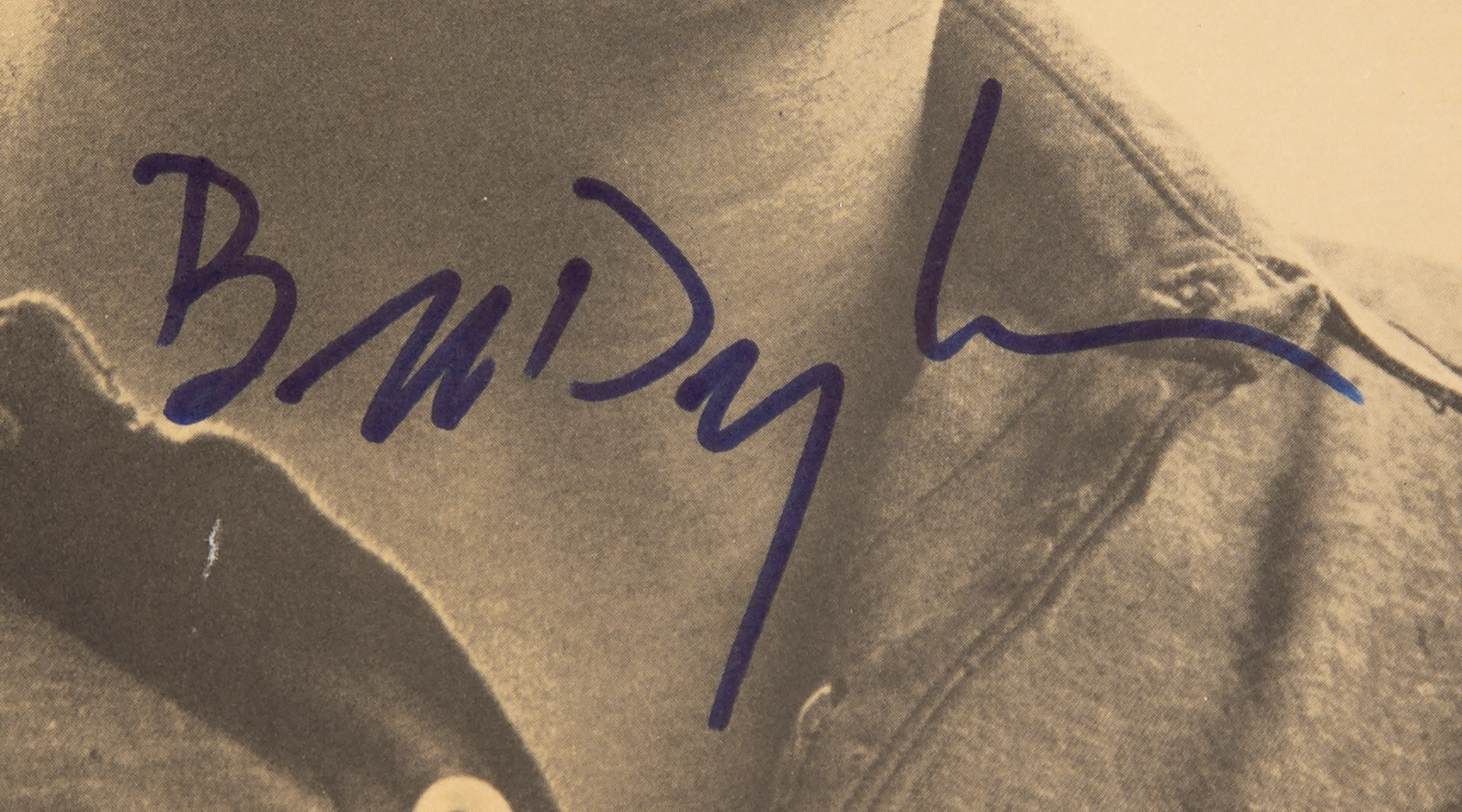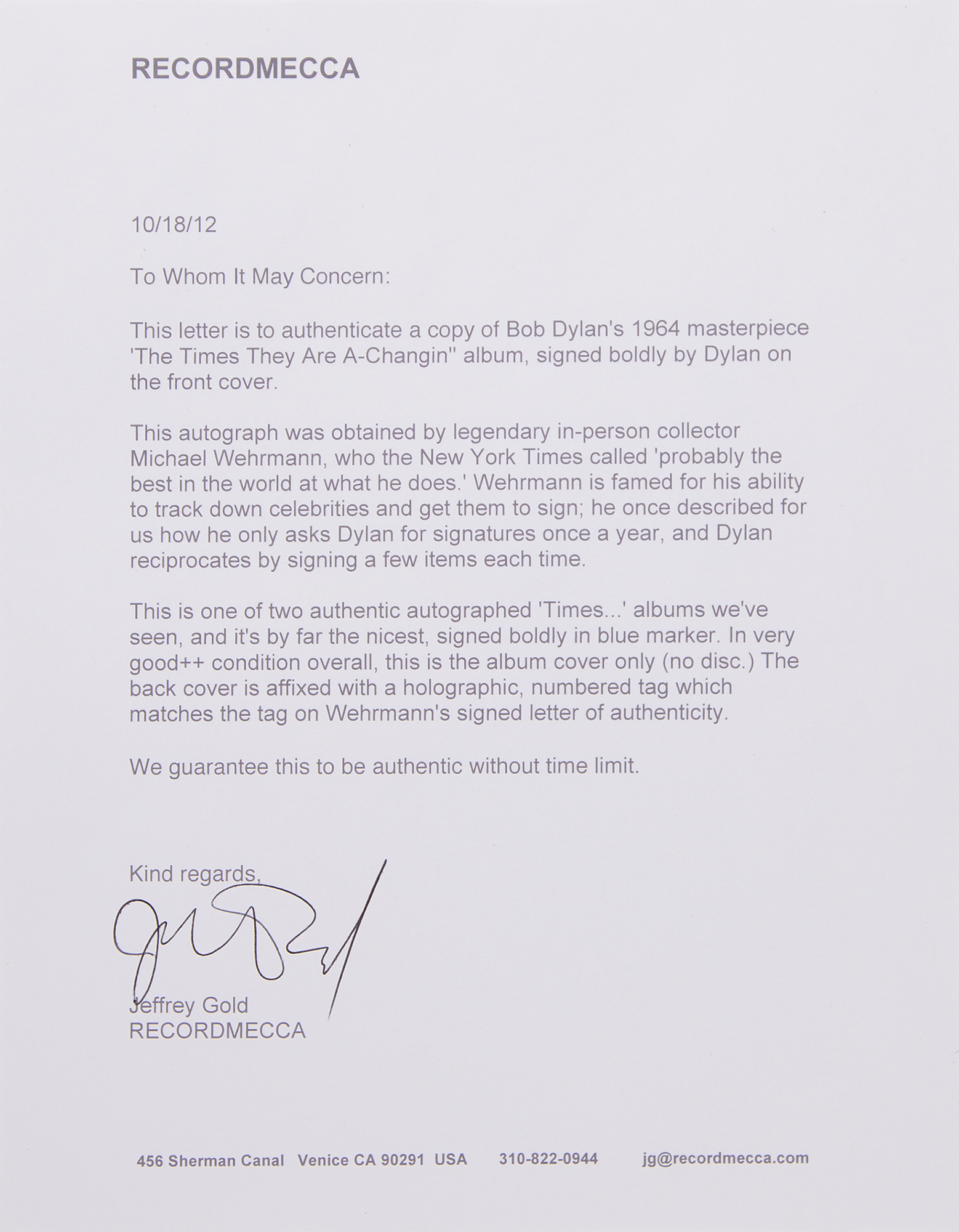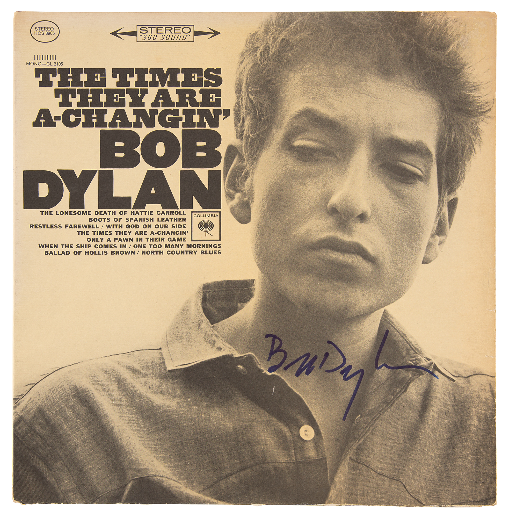 The Times They Are a-Changin' album signed on the front cover in blue felt tip by Bob Dylan. In fine condition. The record is not included. Originally obtained by in-person specialist Mike Wehrmann and accompanied by his certificate of authenticity, as a well as a 2012 letter of provenance from Recordmecca's Jeff Gold; at the time, Gold noted: "This is one of two authentic autographed 'Times…' albums we've seen, and it's by far the nicest."