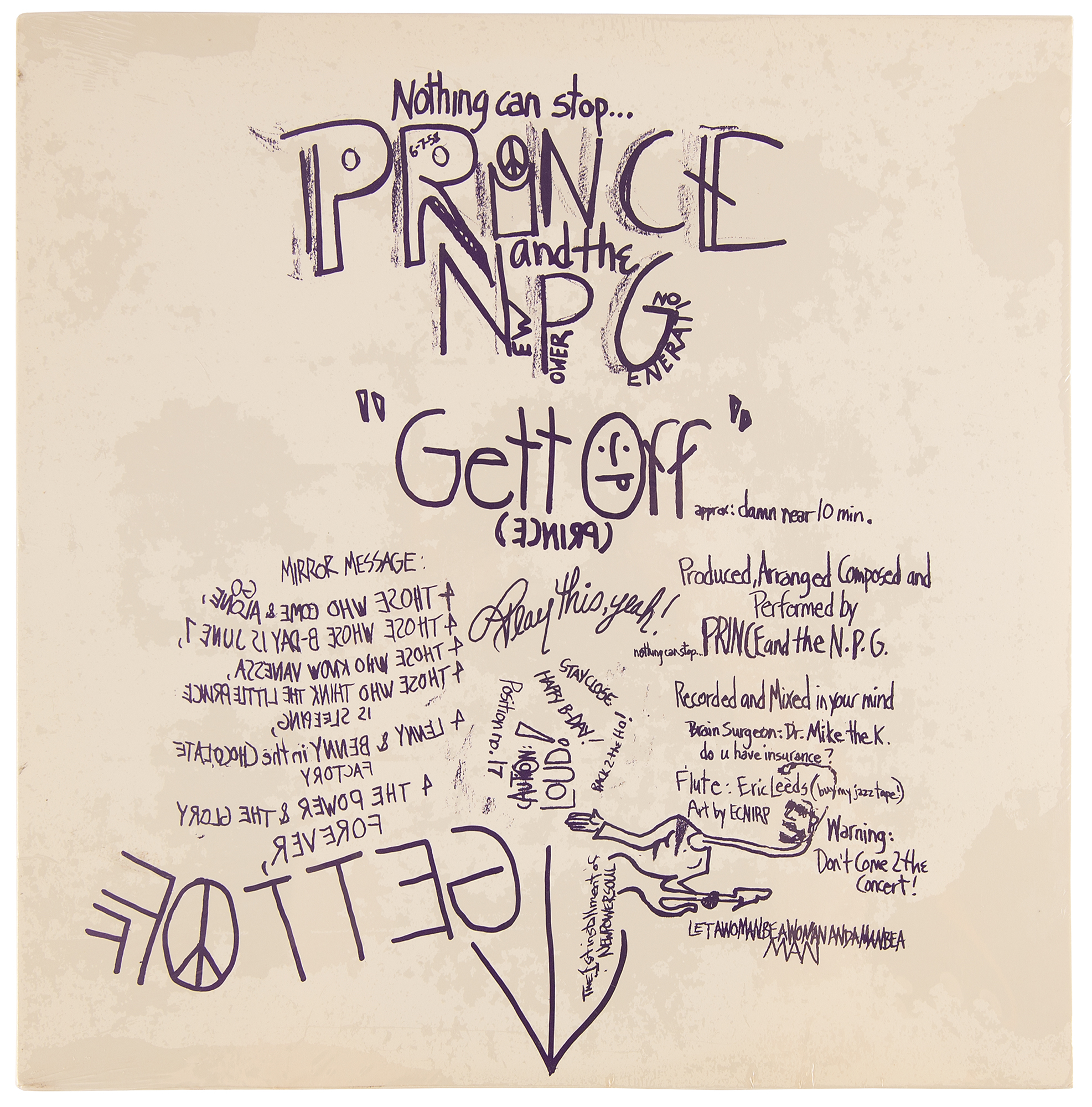 Rare original sealed promotional 12-inch bootleg single of ‘Gett Off’ by Prince and The New Power Generation, self-released in a limited edition of 1500 copies by Prince to celebrate his 33rd birthday on June 7, 1991. The song, entitled on the album sleeve as ‘Gett Off, approx: damn near 10 min.,’ was originally intended as a promotional one-off release delivered to radio and club DJs and not planned to be on the 1991 album Diamonds and Pearls. However, due to the single’s positive reaction, the song replaced the album’s seventh track, ‘Horny Pony,’ on the album as a new, edited 4:31 version and released as the lead-off single.