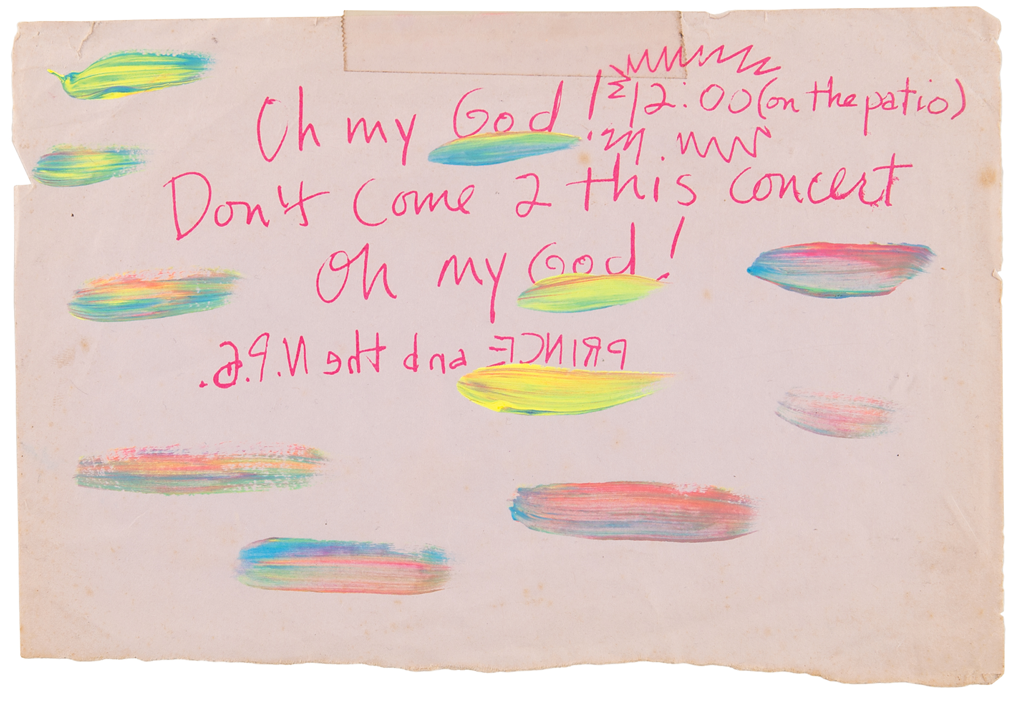 Very rare original invitation for a ‘surprise’ matinee concert by Prince and the New Power Generation held exclusively for Warner Bros. employees at the company’s studio lot (patio) in Burbank, California, on June 3, 1991. The invitation, 8.5 x 5.75, features splotches of psychedelic paint unique to this particular example and printed purple handwriting, which reads: “Oh my God! 12:00 (on the patio), Don’t come 2 this concert, Oh my God! [backwards] Prince and the N.P.G.” In fine condition, with a strip of tape to the edge and some light edgewear.